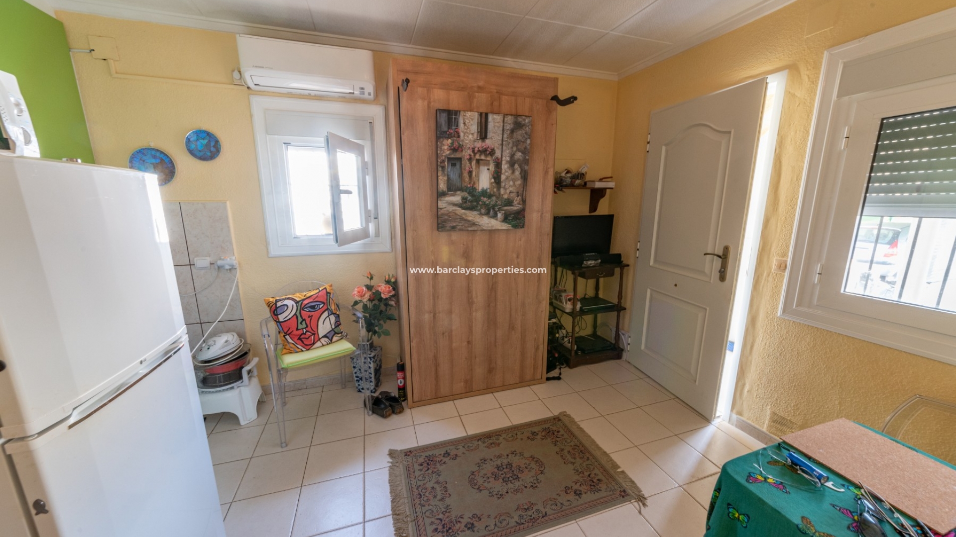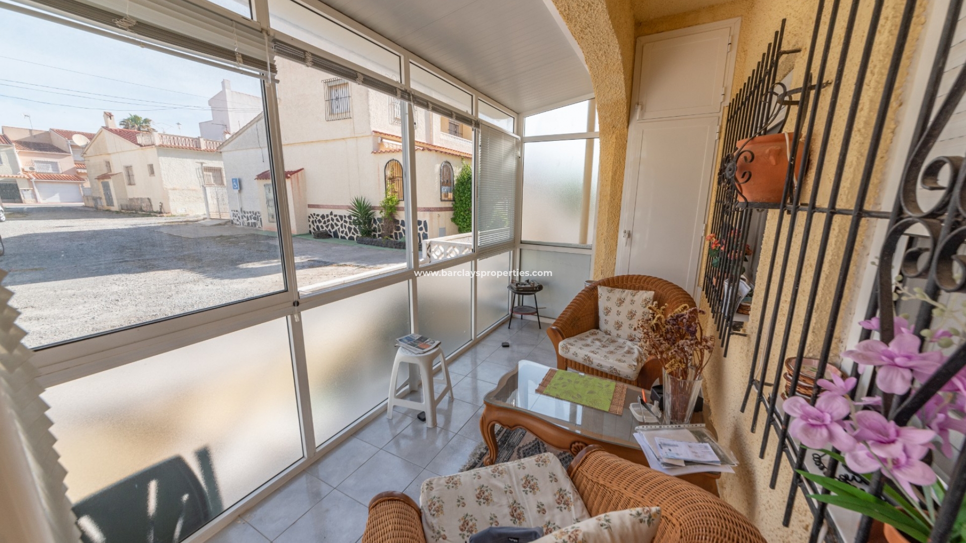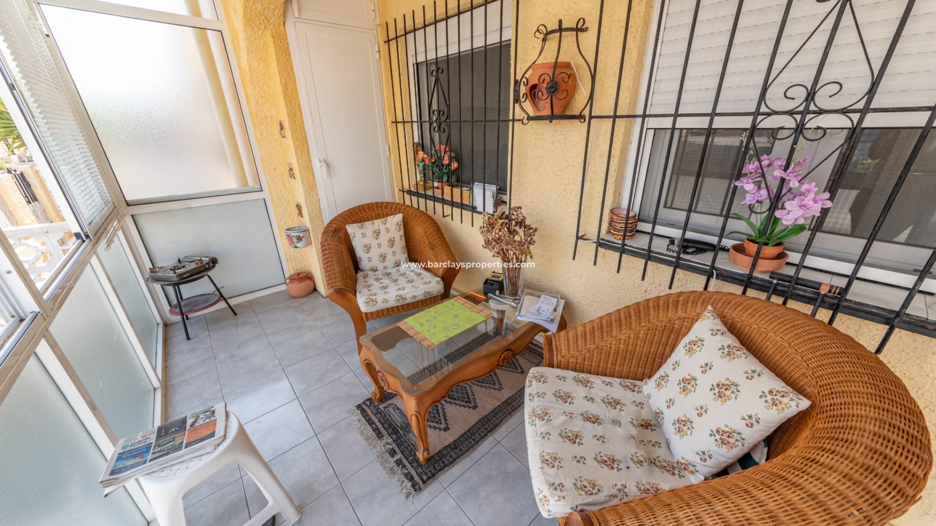 We betreden dit einde van terras rechtstreeks in een glazen serre, het aanbieden van een mooie zithoek voor het hele jaar door. Het pand heeft grote aluminium ramen beschermd door jaloezieën en raam bars die het natuurlijke licht te overstromen in het hele pand mogelijk te maken. Vanaf hier lopen we naar de woon/eetkamer met een volledig ingerichte Amerikaanse keuken en airconditioning om koel te blijven op de warmere dagen. We vinden een tweepersoons slaapkamer met uitzicht op het terras en een volledig ingerichte badkamer.
