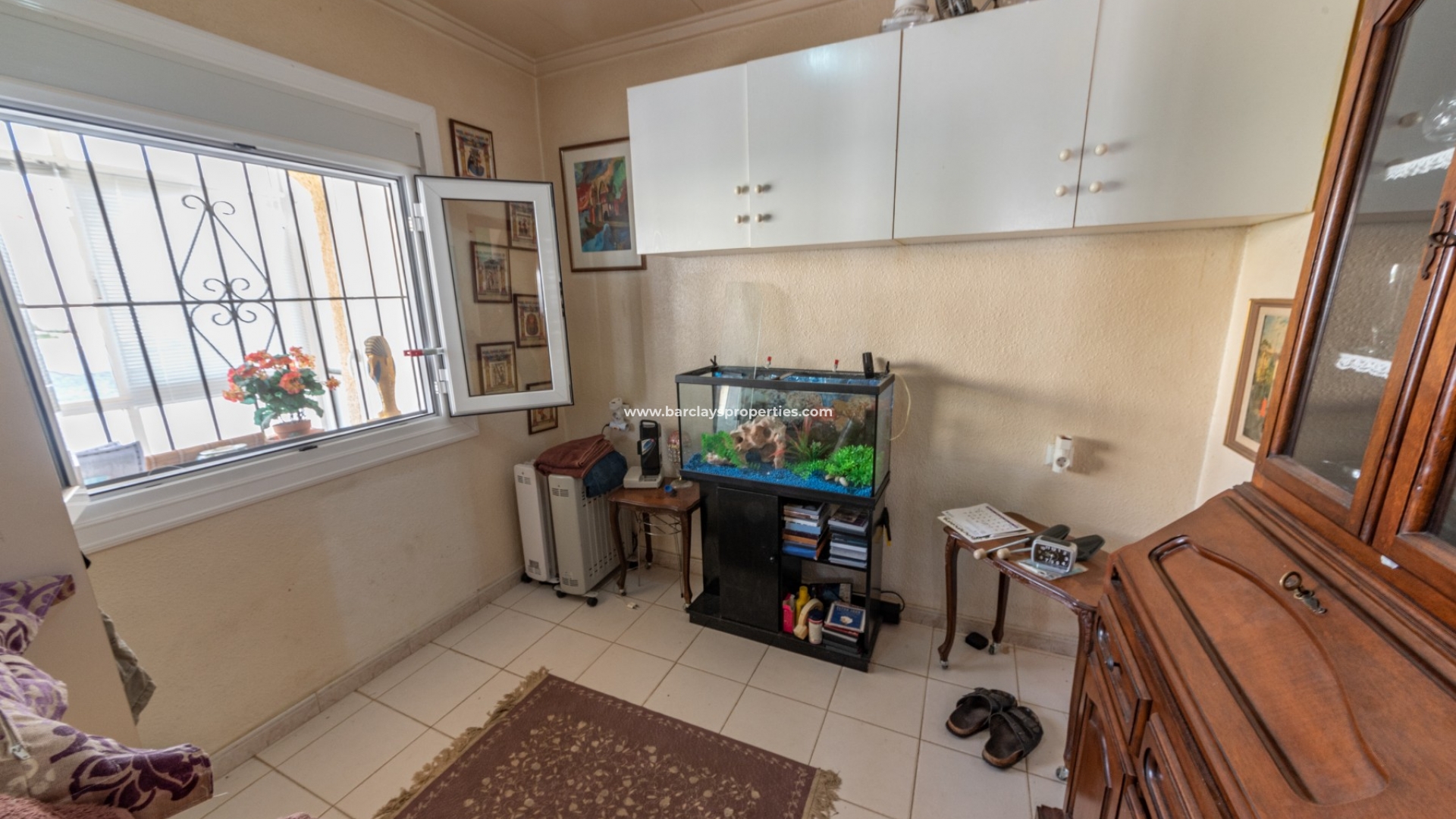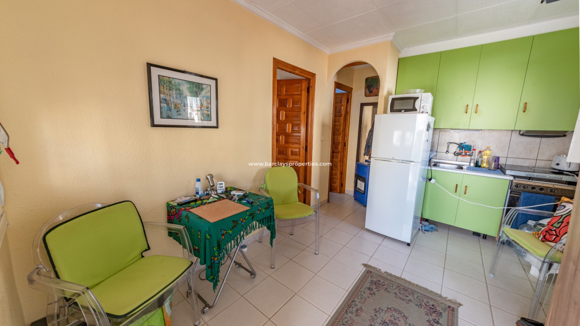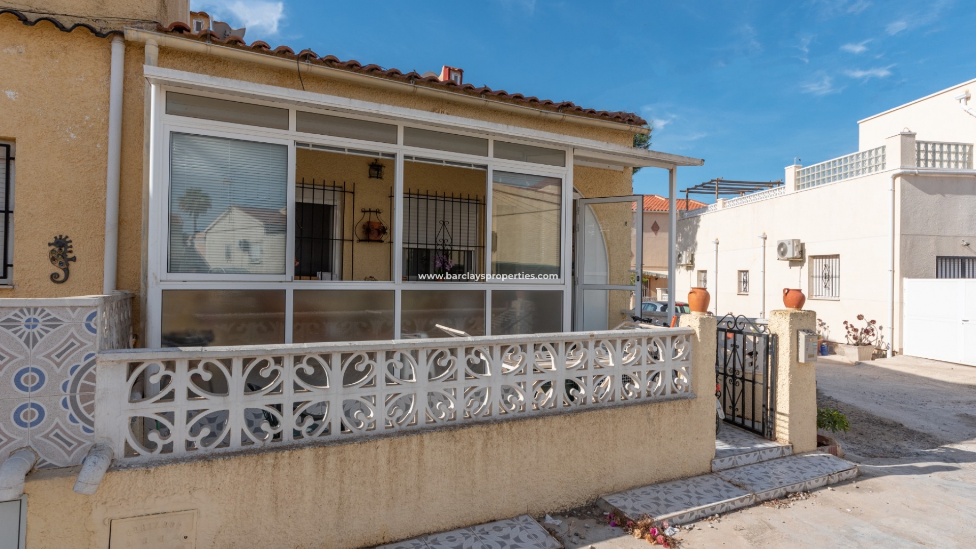 We betreden dit einde van terras rechtstreeks in een glazen serre, het aanbieden van een mooie zithoek voor het hele jaar door. Het pand heeft grote aluminium ramen beschermd door jaloezieën en raam bars die het natuurlijke licht te overstromen in het hele pand mogelijk te maken. Vanaf hier lopen we naar de woon/eetkamer met een volledig ingerichte Amerikaanse keuken en airconditioning om koel te blijven op de warmere dagen. We vinden een tweepersoons slaapkamer met uitzicht op het terras en een volledig ingerichte badkamer.