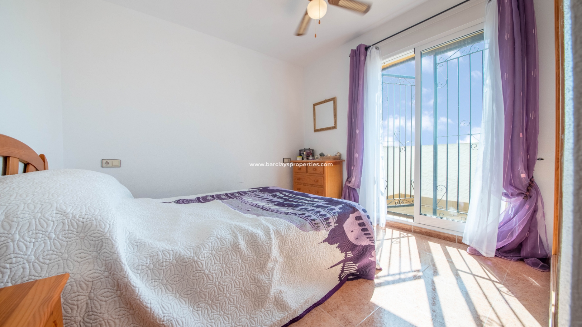 Een overloop met smeedijzeren leuningen leidt naar de overige kamers van het pand, waaronder 2 tweepersoons slaapkamers met inbouwkasten en plafondventilatoren - waarvan een de master is met openslaande deuren naar een eigen zonneterras met prachtig uitzicht op het zwembad en de bergen!