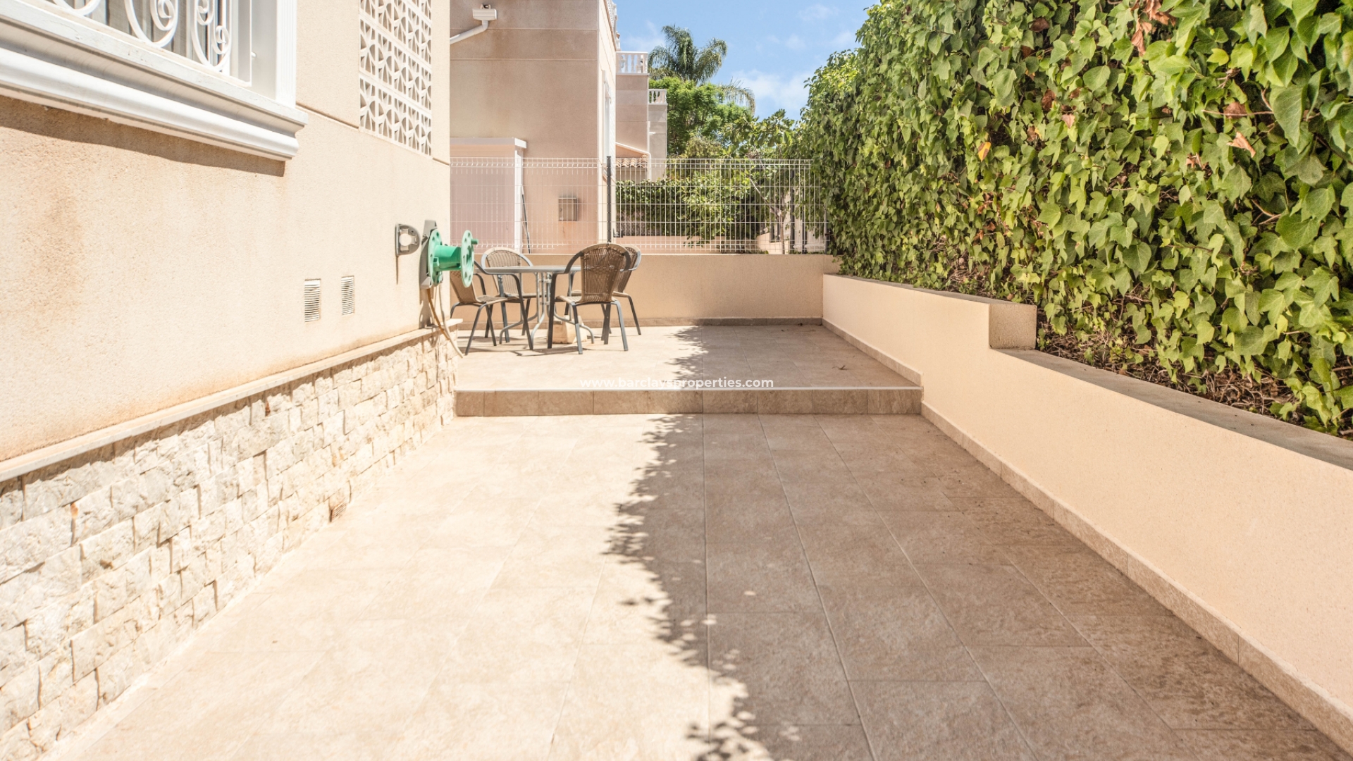 Deze zuid-west georiënteerde villa is absoluut prachtig en zodra u binnenkomt, is het eerste wat opvalt het prachtige verhoogde terras met twee mooie Toscaanse stijl zuilen. De buitenmuur heeft een fijne gotagran afwerking die, samen met de decoratieve vensterroosters, geeft deze prachtige vrijstaande villa een echte lucht van elegantie. De tuin is volledig geplaveid, wat betekent dat het weinig tot geen moeite kost om hem te onderhouden. Er is zowel een voetgangerspoort als een dubbele poort voor de toegang tot het eigendom, waardoor u over een ruim terrein beschikt voor off-road parking.