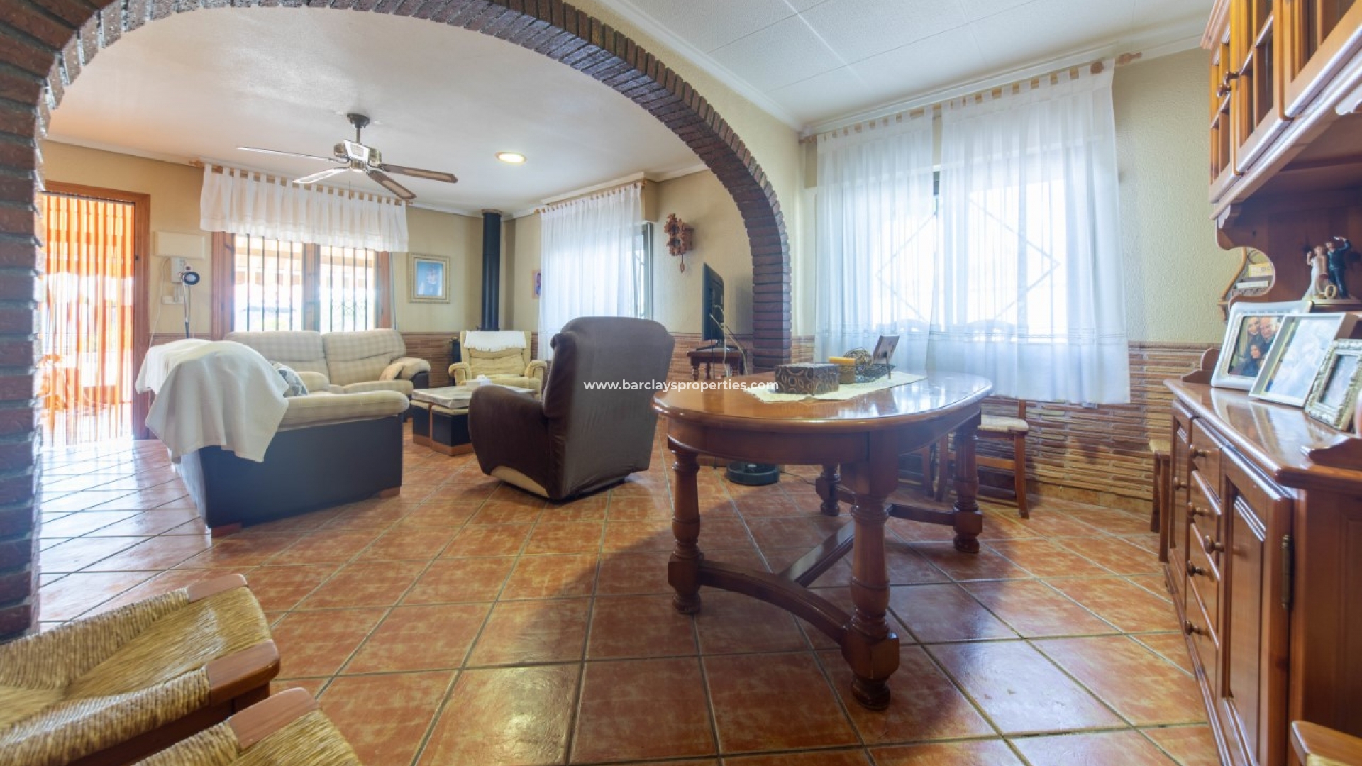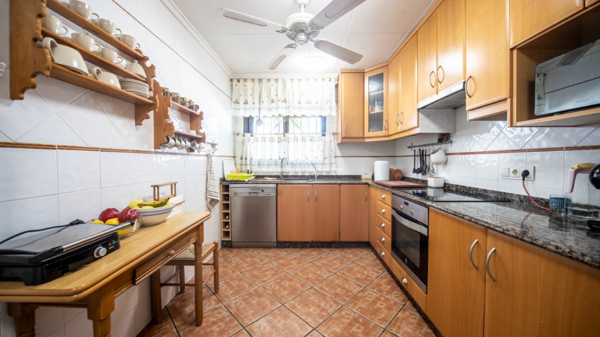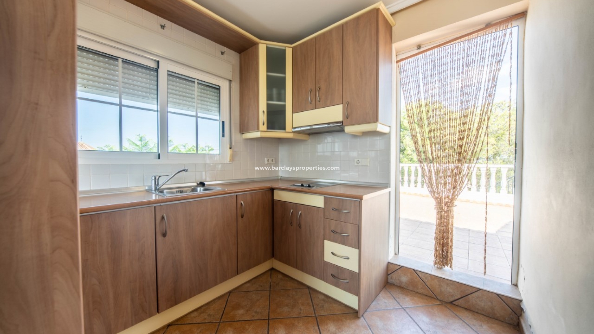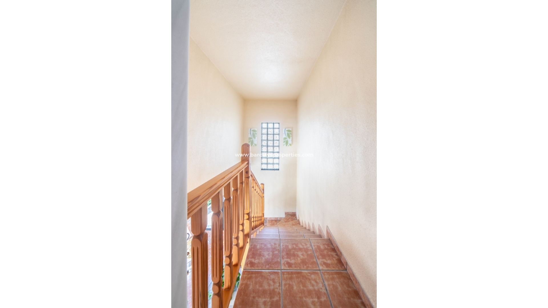 We komen de villa binnen via een ruime veranda met grote glazen deuren die veel natuurlijk licht binnenlaten. Vanaf hier hebben we toegang tot een grote woonkamer met een traditionele landelijke inrichting. Grenzend aan de zitkamer bevinden zich twee tweepersoonsslaapkamers, beide met grote ramen aan de buitenkant. Aan het eind van de zitkamer is een grote boog die ons naar een eetkamer brengt, van hieruit hebben we toegang tot een derde slaapkamer met een ingebouwde kledingkast, een badkamer met een groot marmeren badmeubel en een groot bad, samen met een ruime keuken, die wordt verkocht met alle elektrische apparaten. De keuken heeft ook toegang tot een bijkeuken met een buitendeur naar buiten, evenals een badkamer met een hoekdouche.