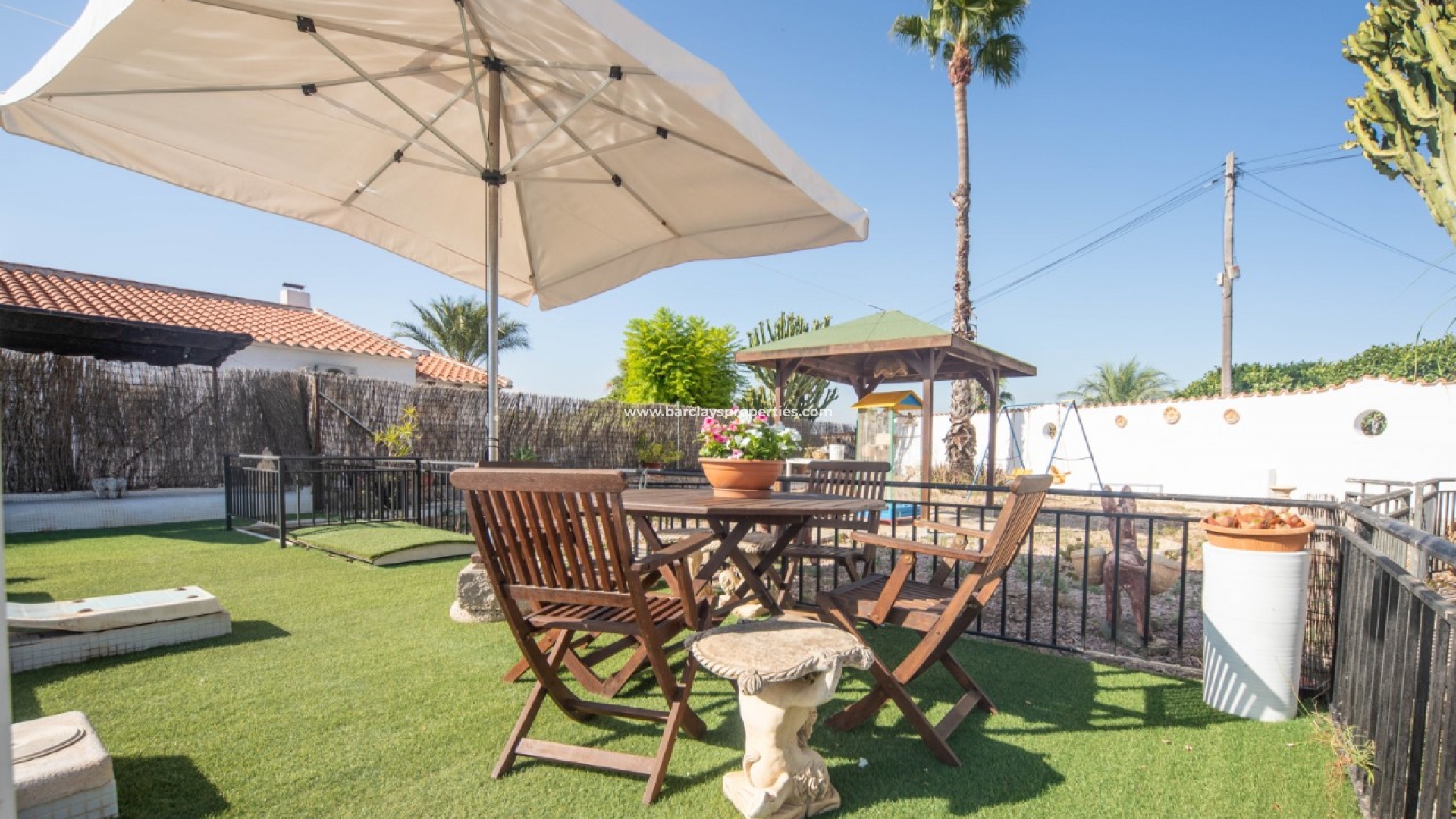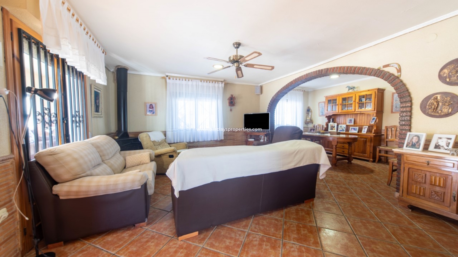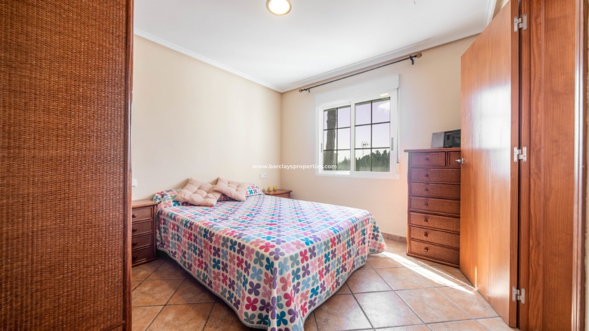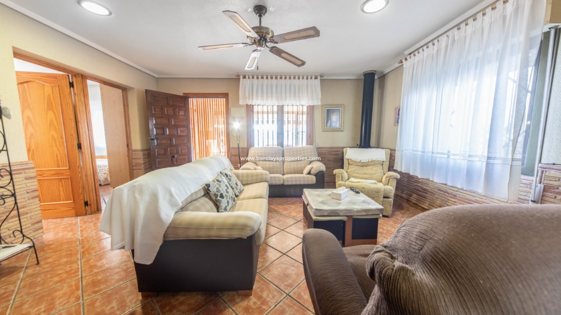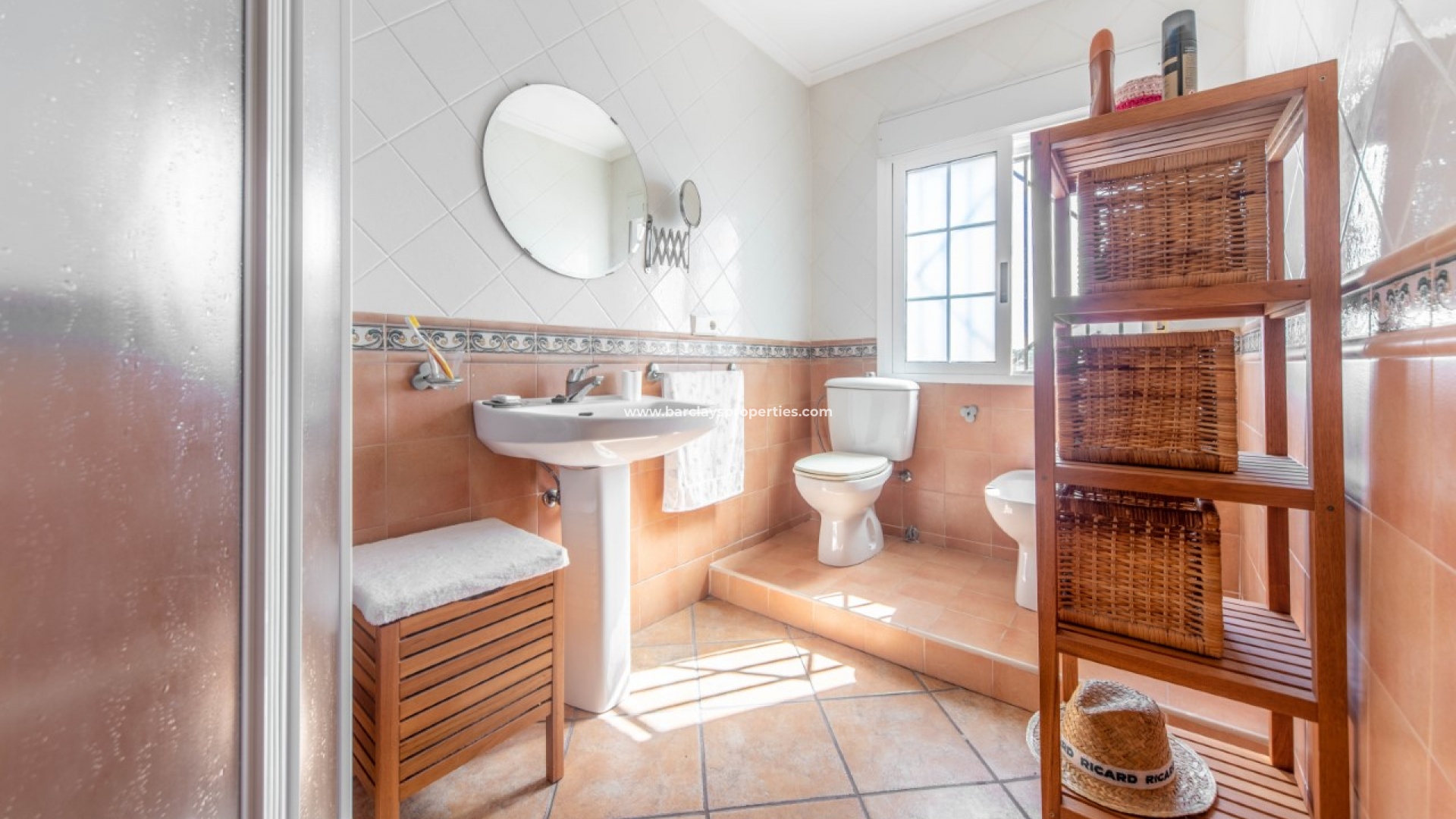 We komen de villa binnen via een ruime veranda met grote glazen deuren die veel natuurlijk licht binnenlaten. Vanaf hier hebben we toegang tot een grote woonkamer met een traditionele landelijke inrichting. Grenzend aan de zitkamer bevinden zich twee tweepersoonsslaapkamers, beide met grote ramen aan de buitenkant. Aan het eind van de zitkamer is een grote boog die ons naar een eetkamer brengt, van hieruit hebben we toegang tot een derde slaapkamer met een ingebouwde kledingkast, een badkamer met een groot marmeren badmeubel en een groot bad, samen met een ruime keuken, die wordt verkocht met alle elektrische apparaten. De keuken heeft ook toegang tot een bijkeuken met een buitendeur naar buiten, evenals een badkamer met een hoekdouche.