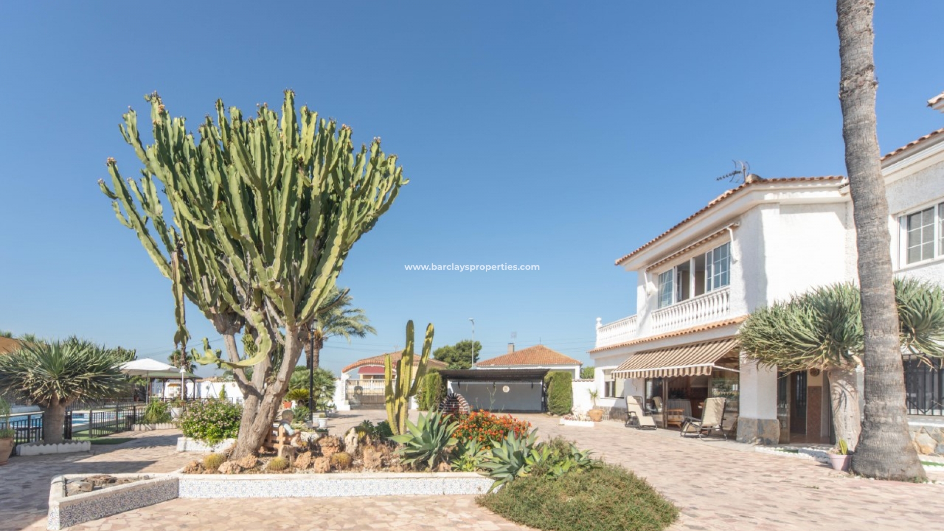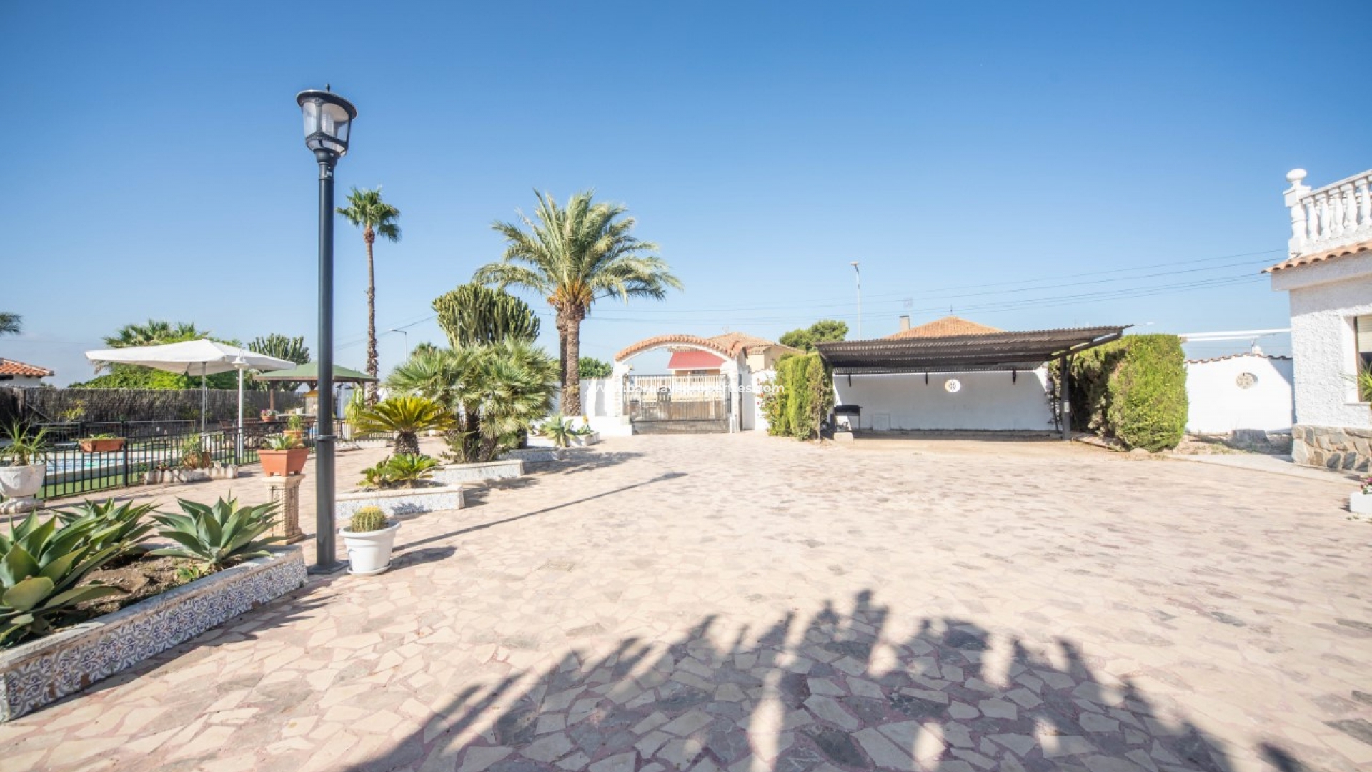De toegang tot dit bijzondere huis is ofwel via de grote elektrische schuifpoort ofwel via de voetgangerspoort. Het heeft een grote tuin met traditionele Spaanse stijl bestrating. Er is een carport met genoeg ruimte voor drie auto's verborgen achter een mooie gesnoeide haag. We vinden er ook enkele opvallend grote cactussen en vele andere typische mediterrane bomen, zoals de mooi aangelegde palmbomen die over het terrein verspreid staan. We vinden ook een prachtig groot zwembad aan de voorzijde van de villa met aantrekkelijk kunstgras eromheen, samen met een mooi schaduwrijk gebied met chique buitenmeubilair, perfect om te chillen rond het zwembad met een koud biertje.