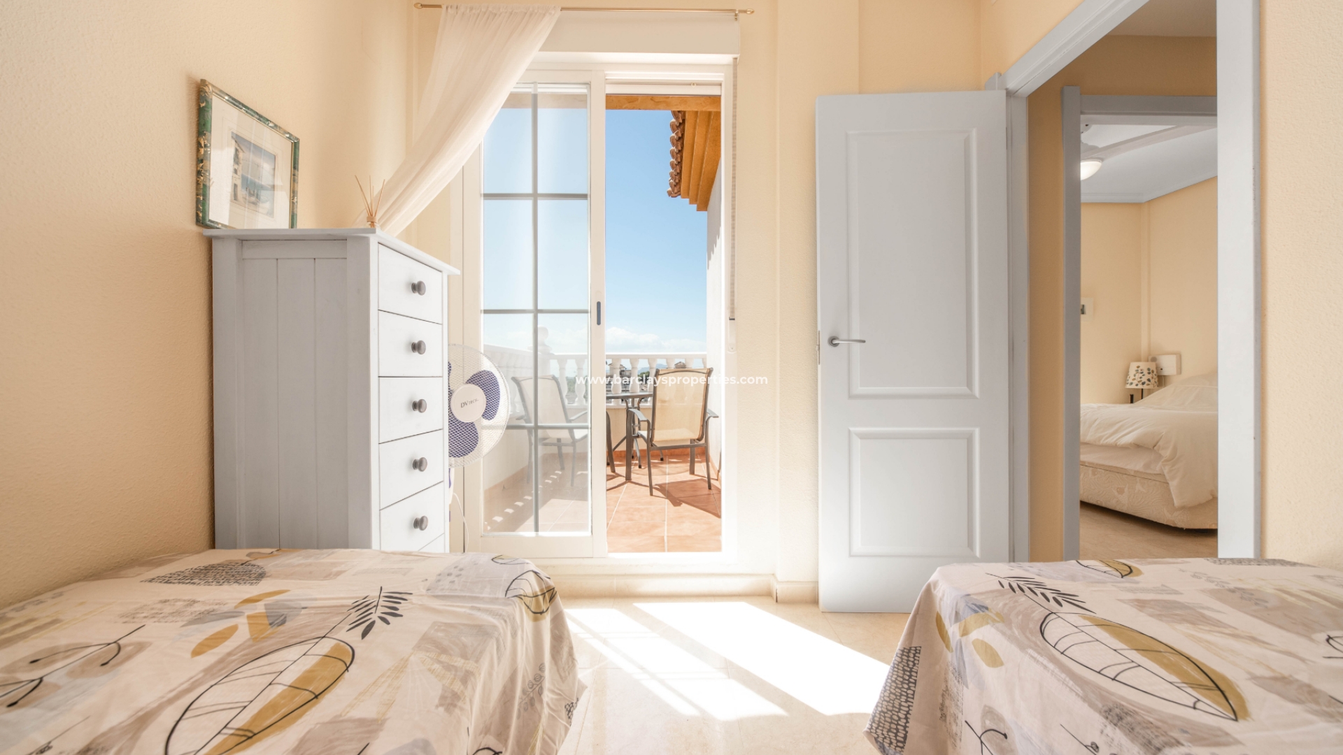 Een marmeren trap leidt naar de eerste verdieping waar zich twee tweepersoons slaapkamers bevinden, een met een privé zonneterras en de master heeft een gebogen balkon, plafondventilator en spiegelkasten. Een familie badkamer is te vinden op deze verdieping met een full size bad, bidet, w.c en wastafel / badmeubel.