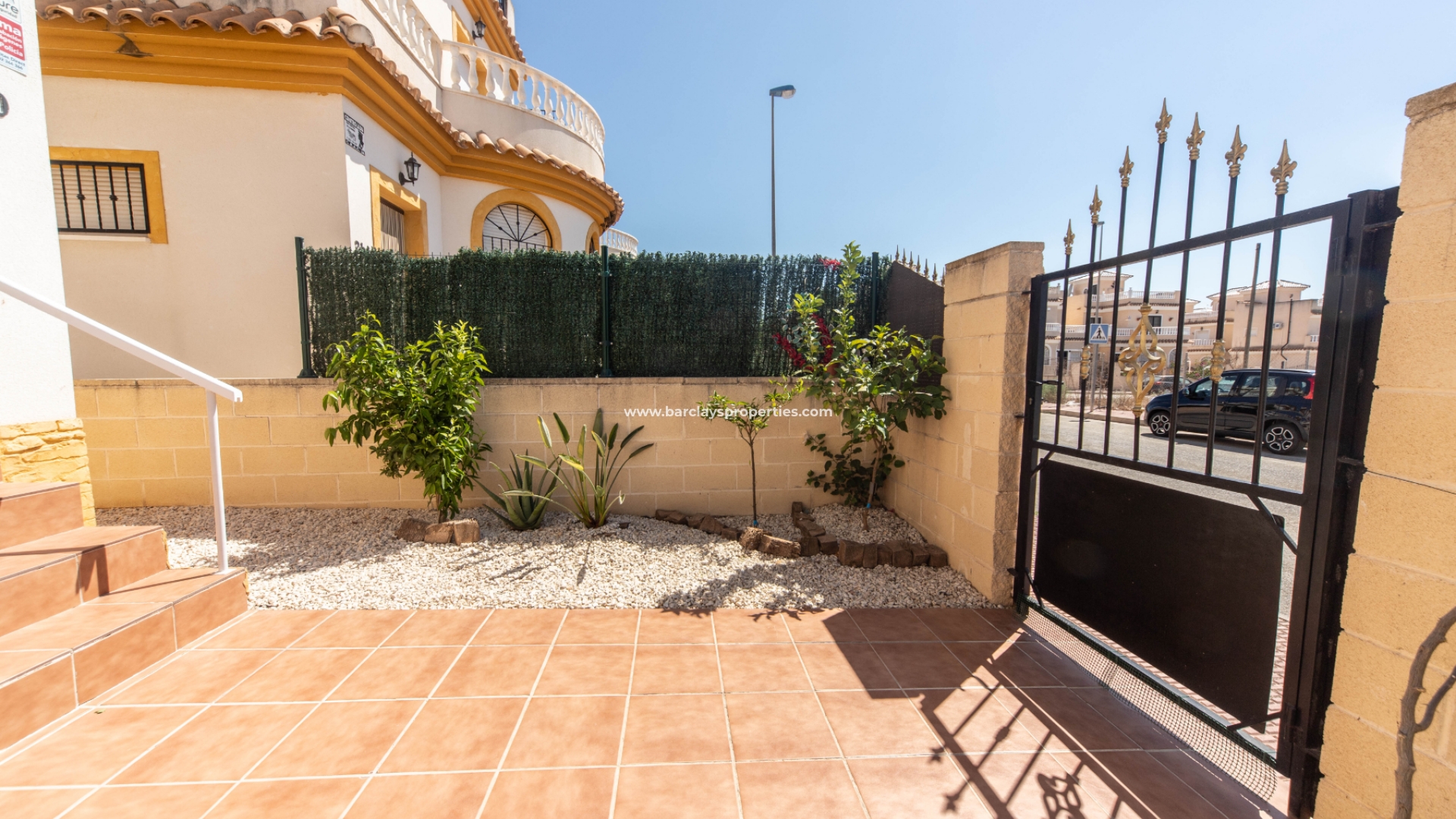 De toegang tot de tuin is via een voetgangerspoort en een dubbele oprijlaan. De off-road parking wordt momenteel gebruikt als een exterieur eethoek, er is een andere zithoek en de tuin is betegeld, grind en met kunstgras toe te voegen aan het dat extra beetje kleur!