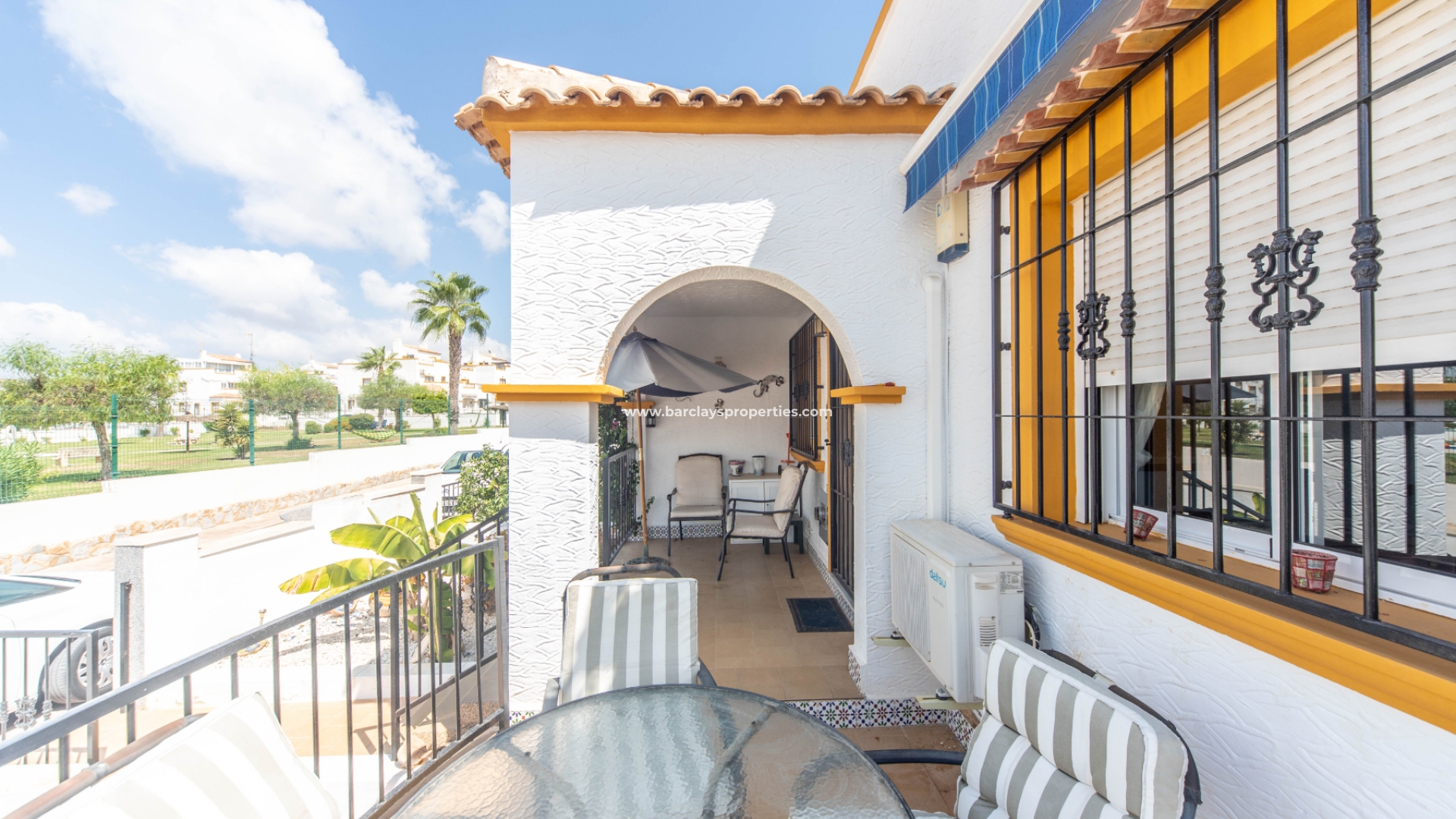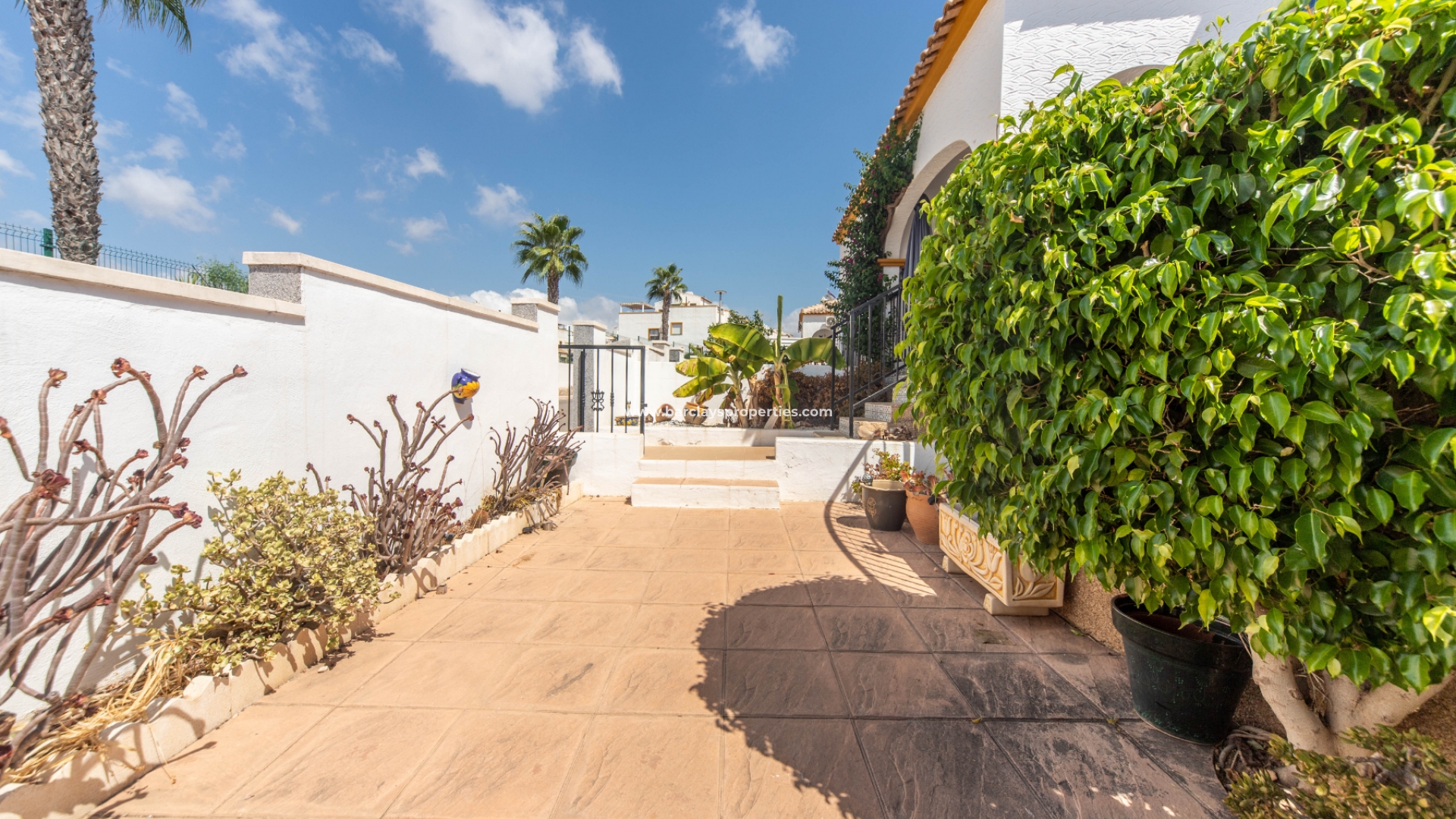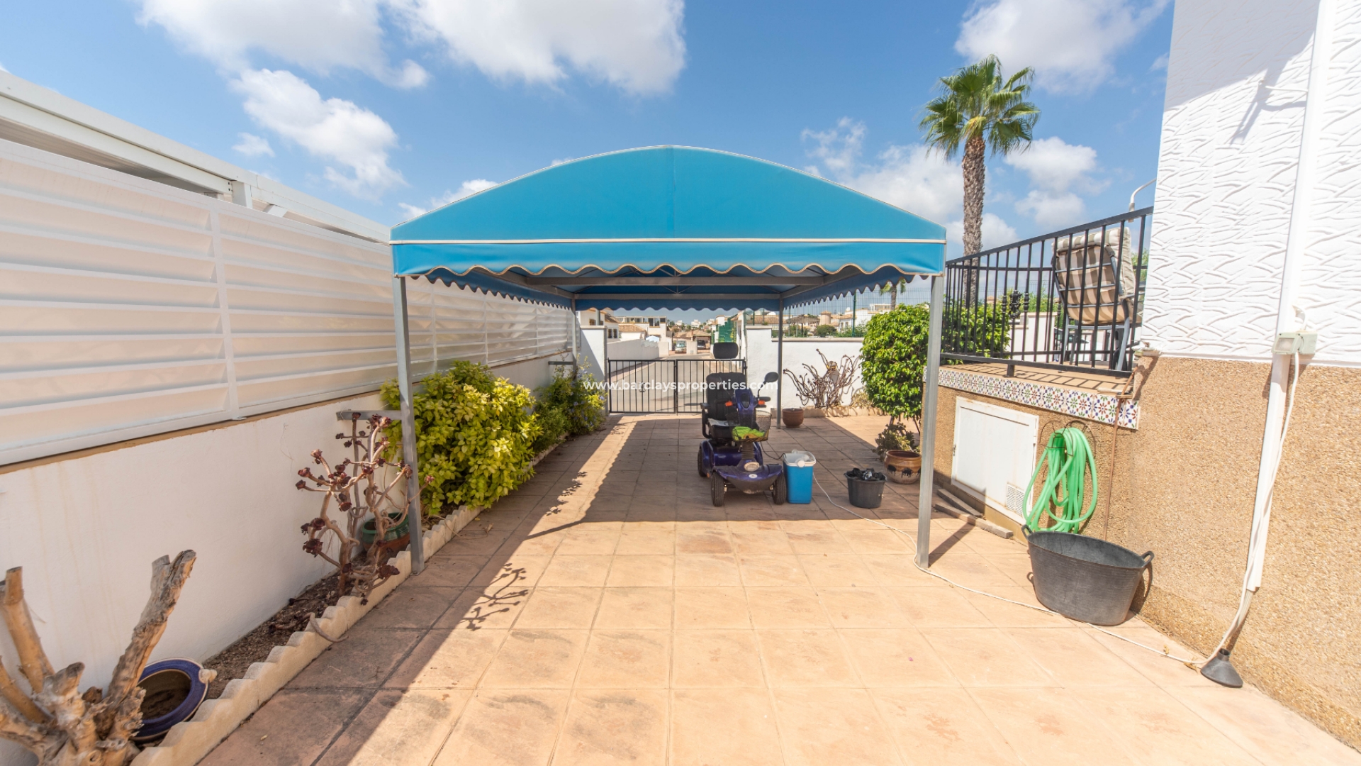 Deze prachtige villa biedt u zowel een voetgangerspoort als een dubbele poort die leidt naar een carport. De tuin is volledig geplaveid met een paar gevestigde bomen en planten, waaronder een volwassen fruitboom. Het is gemakkelijk te onderhouden en heeft een groot verhoogd terras dat gedeeltelijk overdekt is, wat betekent dat u op elk moment van de dag buiten kunt eten.