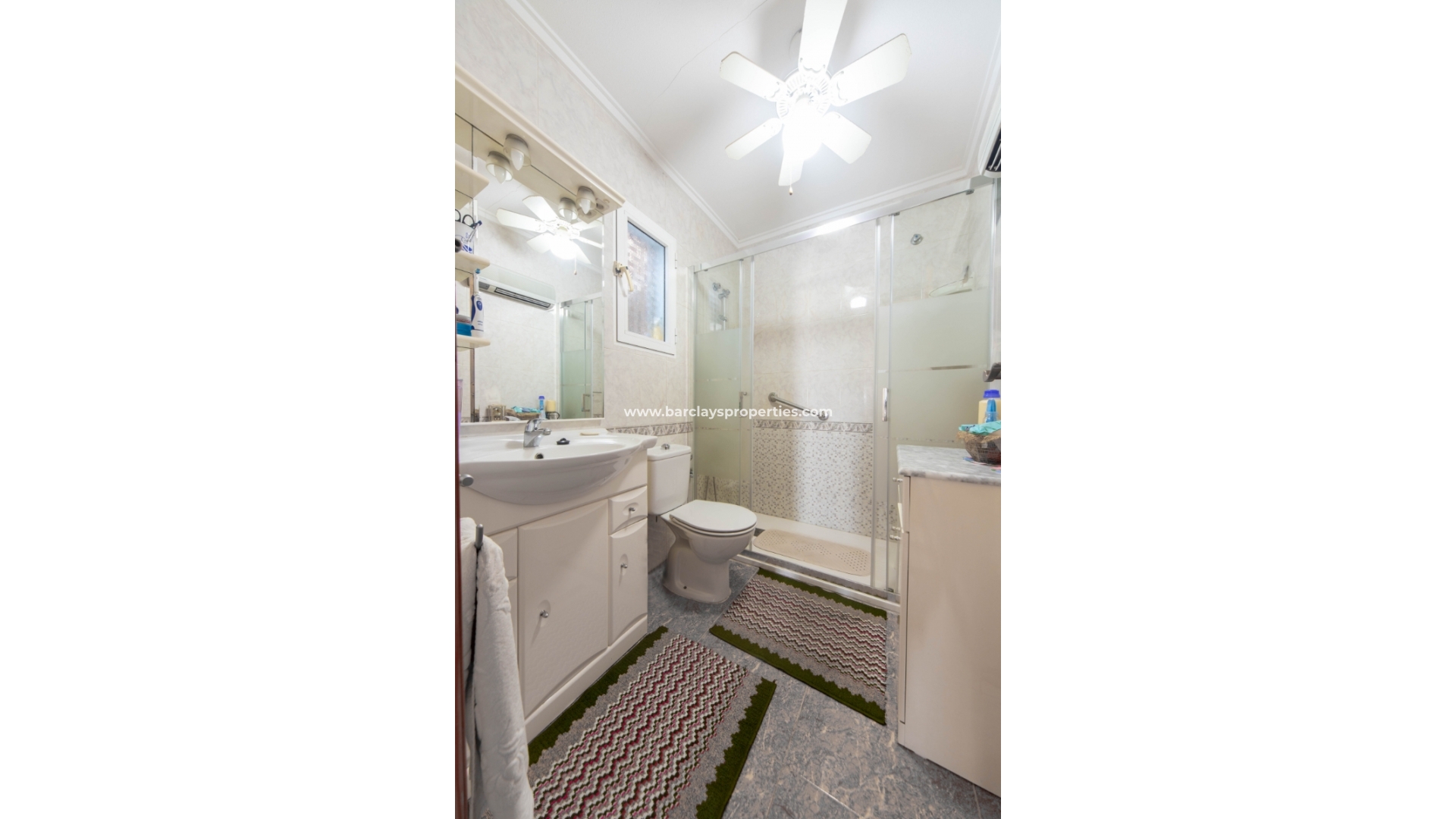 Terug binnen vinden we twee tweepersoons slaapkamers met airconditioning en een kamer met twee eenpersoonsbedden met een plafondventilator, samen met een volledig ingerichte badkamer met een inloopdouche van muur tot muur.