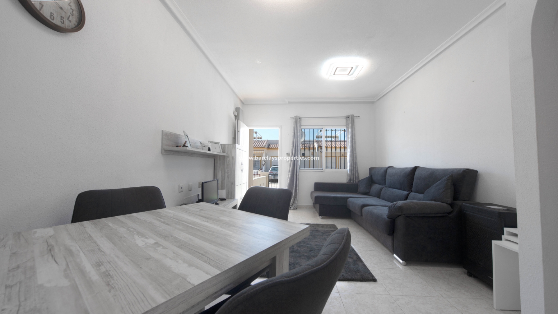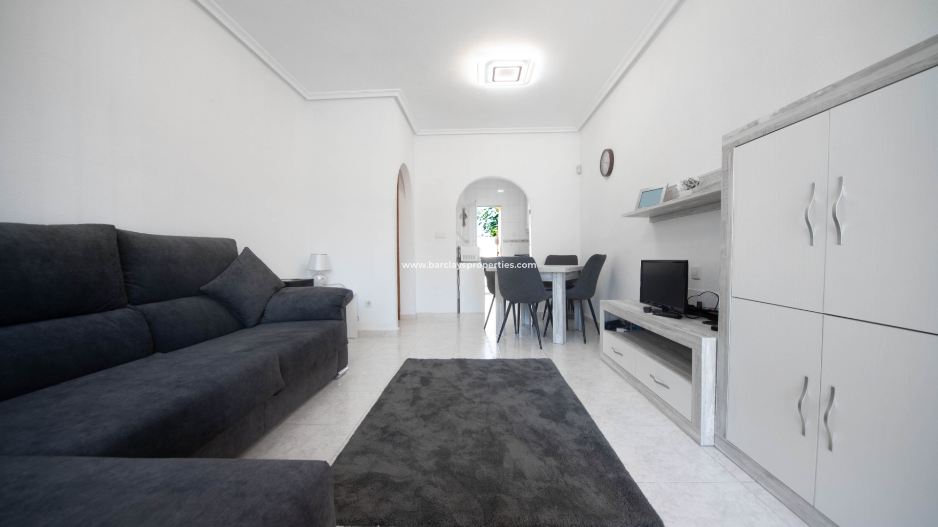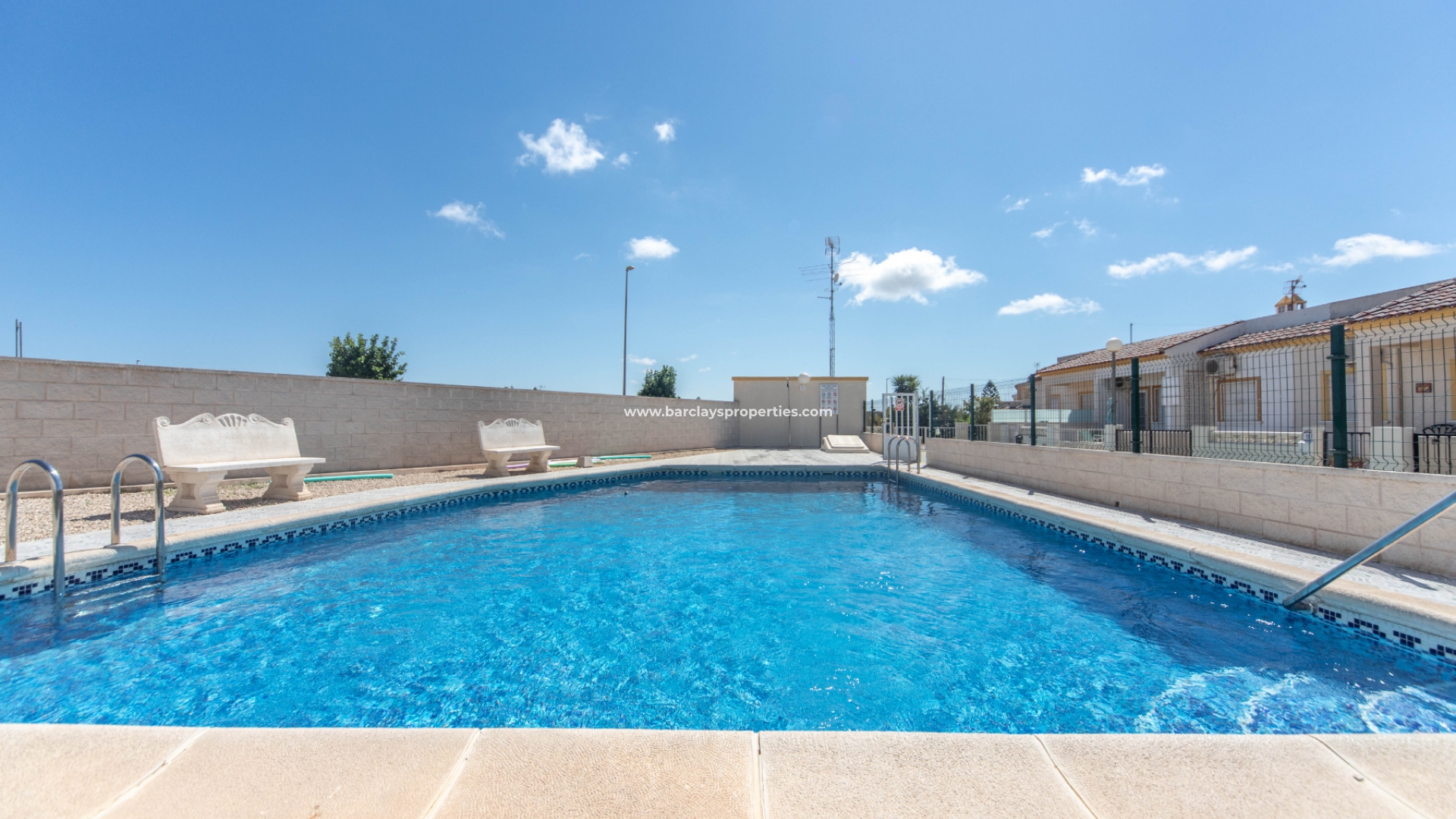 Deze heerlijke woning ligt op een steenworp afstand van het gemeenschappelijke zwembad. We hebben de keuze om binnen te komen via een voetgangerspoort of via de dubbele poorten die ons naar de oprit leiden voor parkeergelegenheid, de tuin is volledig bestraat en gemakkelijk in onderhoud.