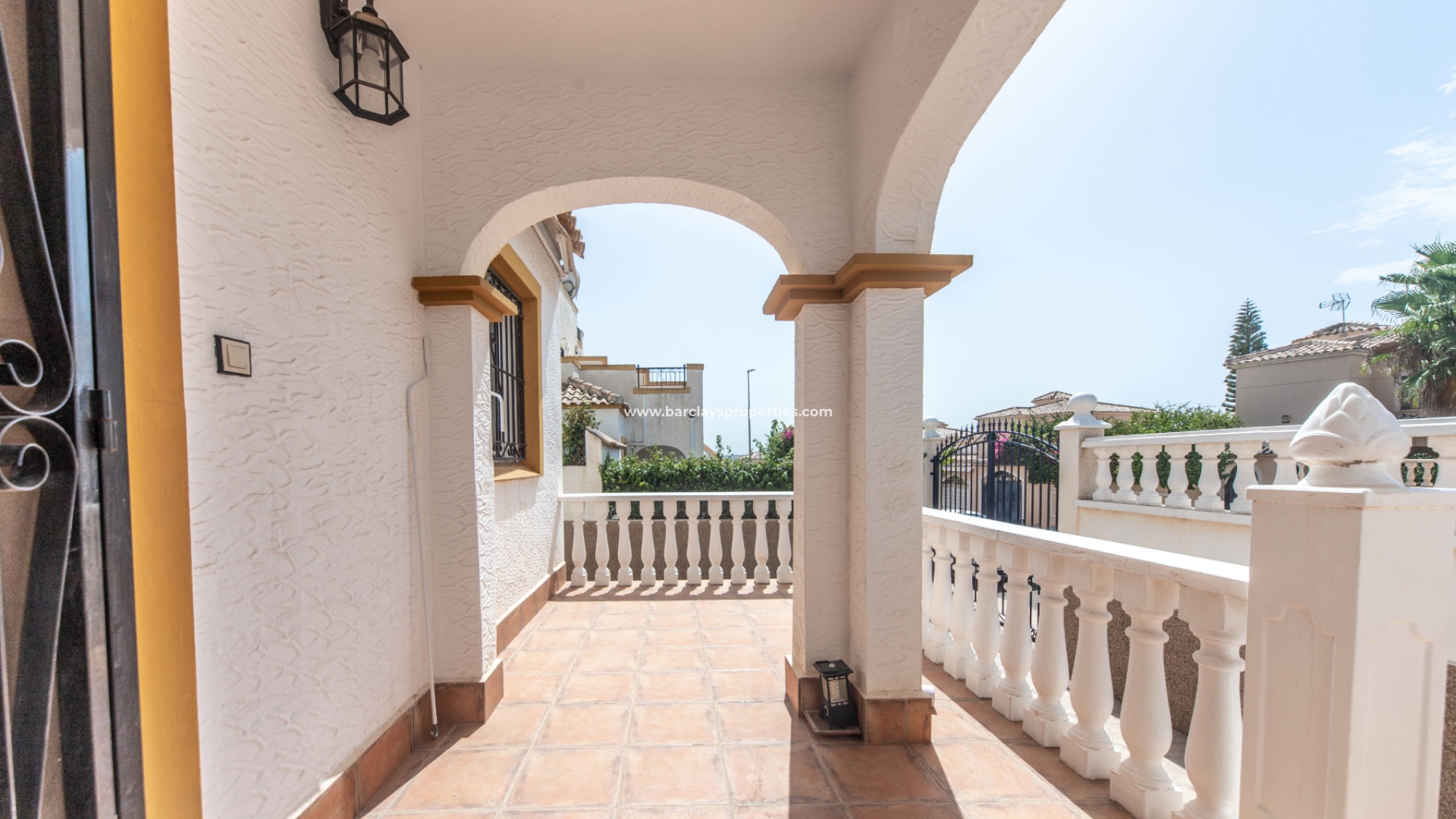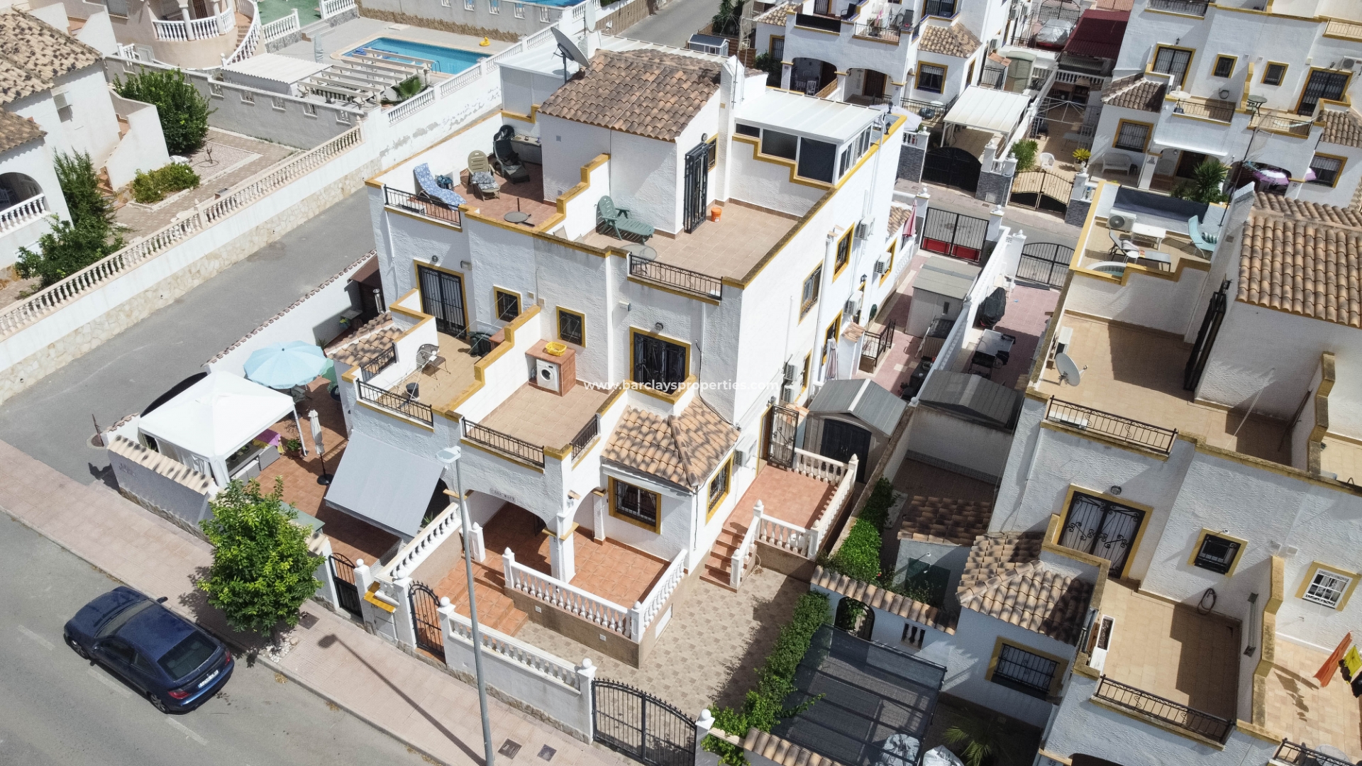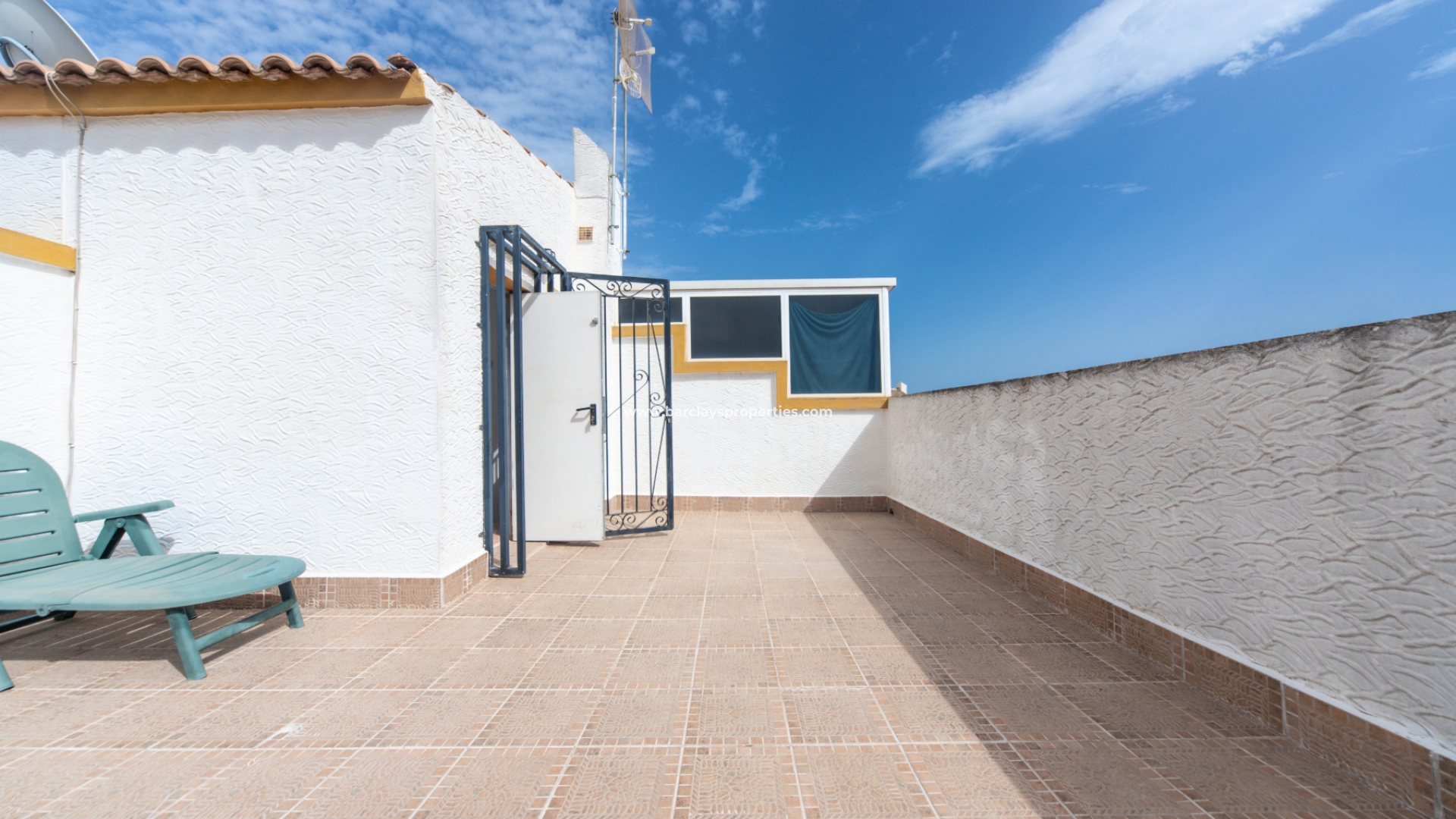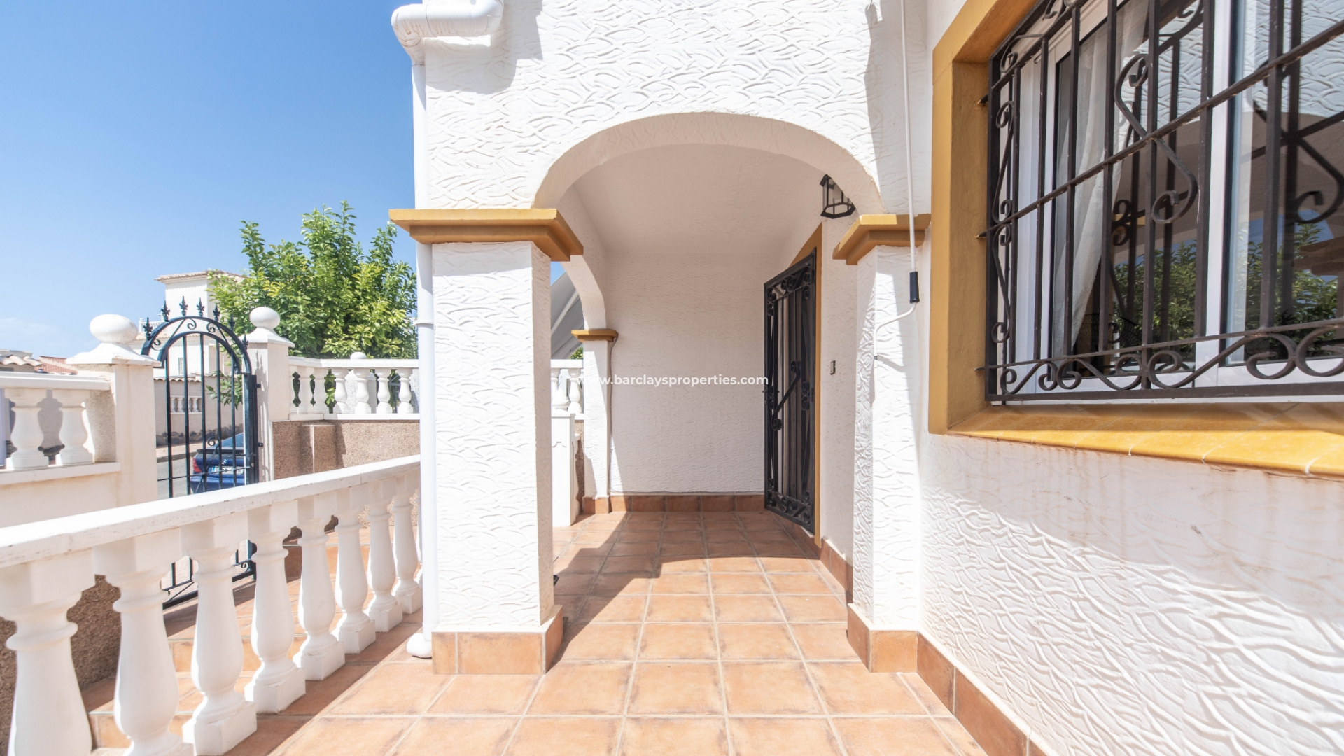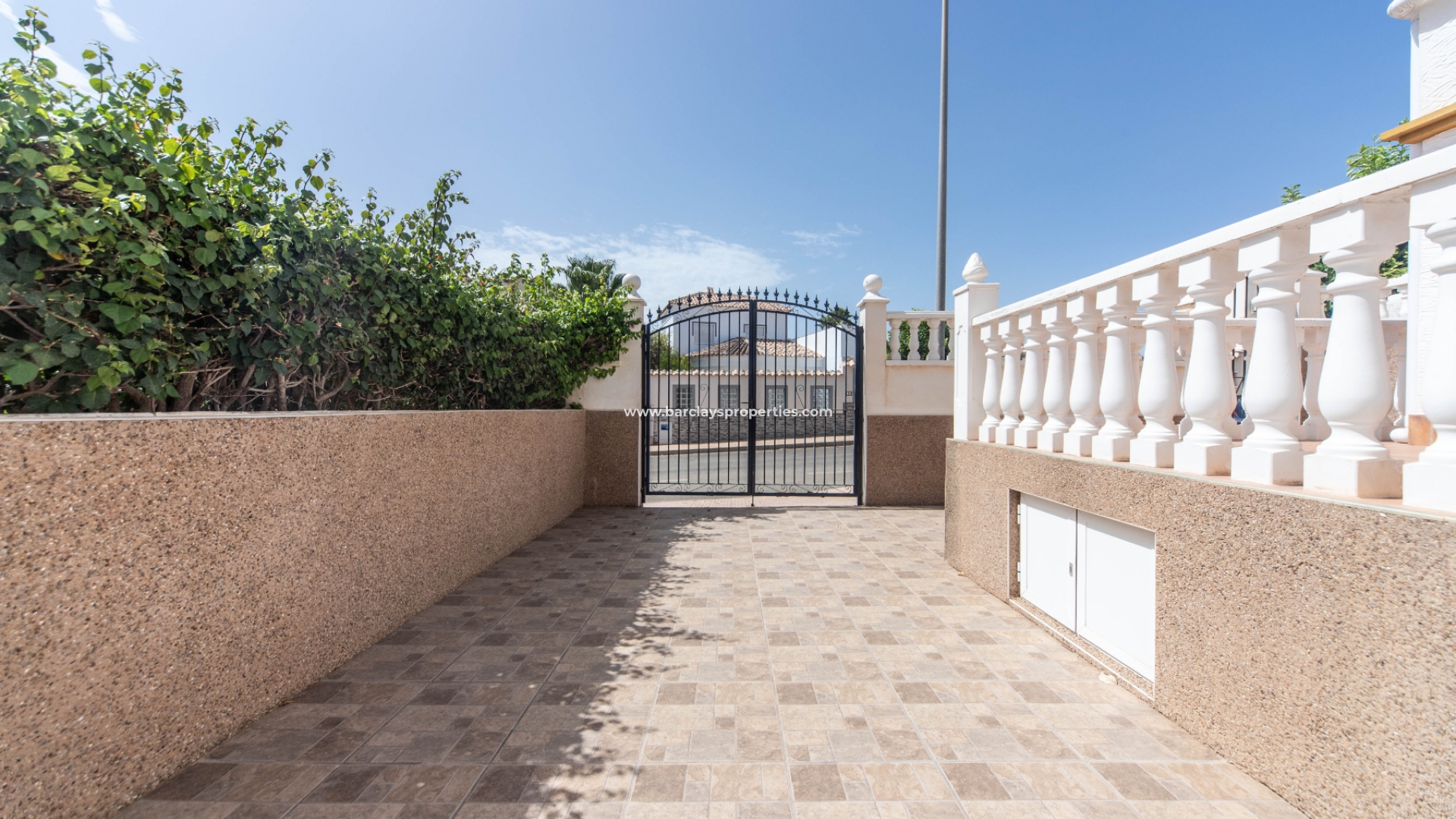 Toegang tot de woning is via een voetgangerspoort en oprit poorten geven toegang tot de off-road parkeerplaats en berging aan de zijkant. De tuin is volledig betegeld zodat er weinig onderhoud nodig is.