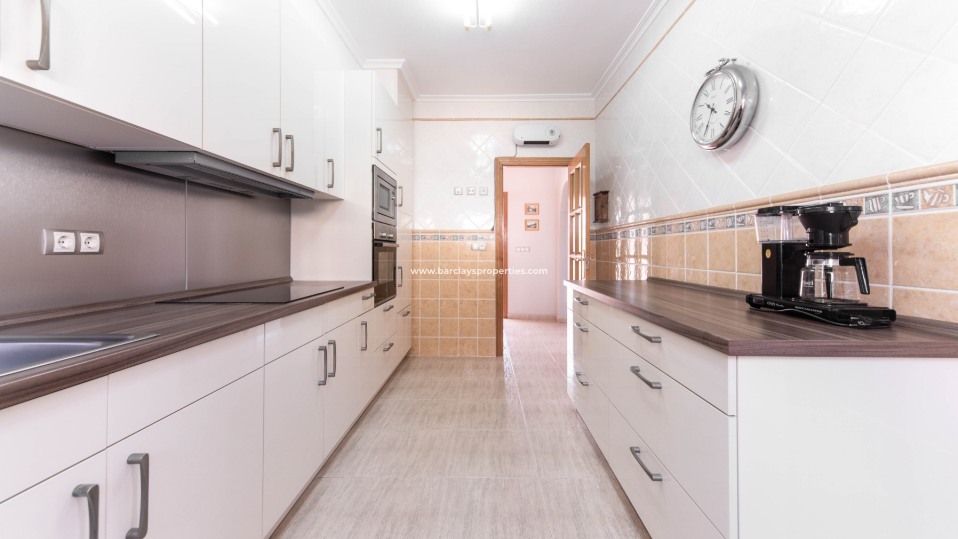 Een uitnodigend, mooi zonneterras met plafondventilatoren en zonneschermen geeft toegang tot het interieur van het pand waar we een hal vinden die leidt naar de lichte, ruime woonkamer met airconditioning, een moderne gashaard en toegewezen eethoek. Naast de woonkamer is een nieuw ingerichte onafhankelijke keuken met een elektrische split-level oven en kookplaat, afzuigkap en koelkast met vriesvak. Vanuit de keuken komt u in de bijkeuken, waar zich nog een koelkast met vriesvak, een wasmachine en een wijnkoeler bevinden. Vanaf hier leidt een binnentrap naar het solarium op het dak met een 2.4 satellietschotel en een prachtig uitzicht op het platteland.