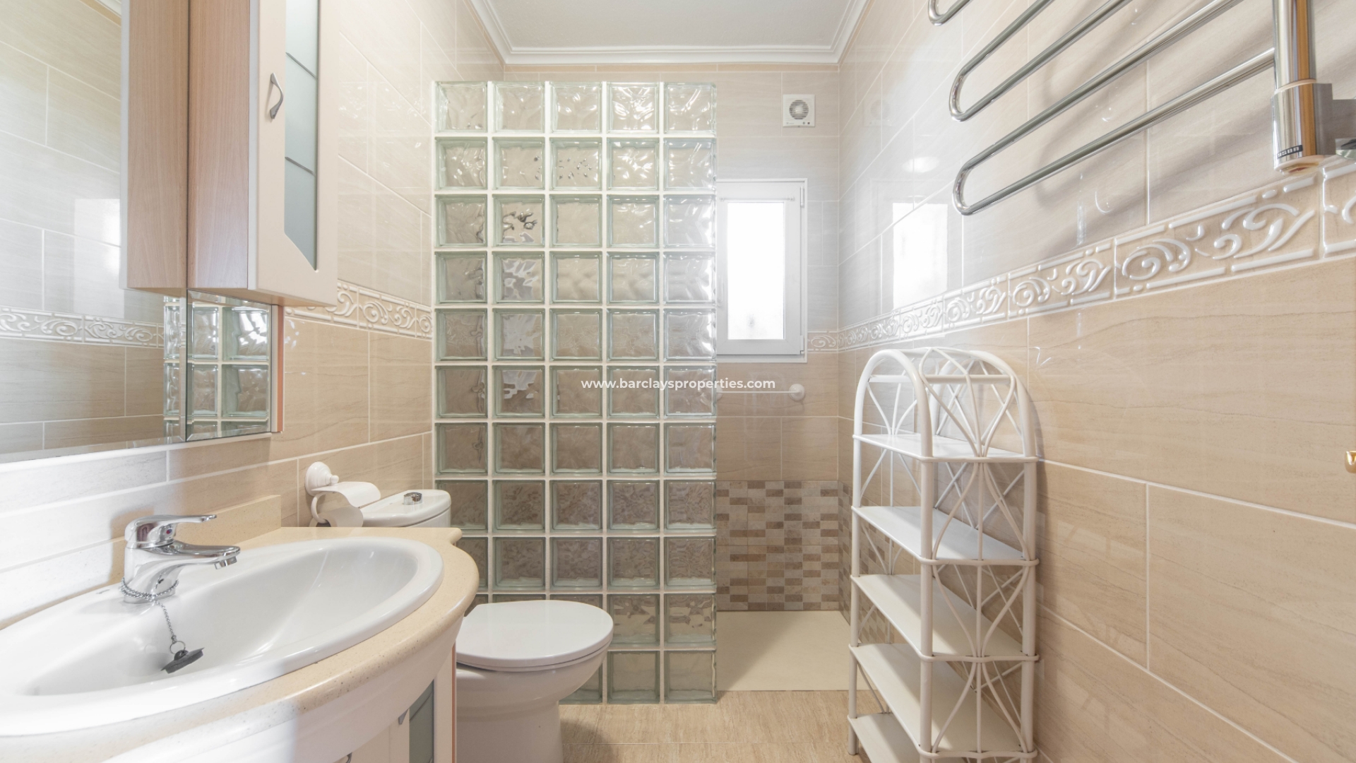 Terug naar het interieur van het huis, de resterende kamers zijn een familie badkamer met douche, wastafel en toilet met vloerverwarming, drie dubbele slaapkamers allen met airconditioning en inbouwkasten en de master heeft een en-suite badkamer met inloopdouche met bakstenen design en wederom vloerverwarming.