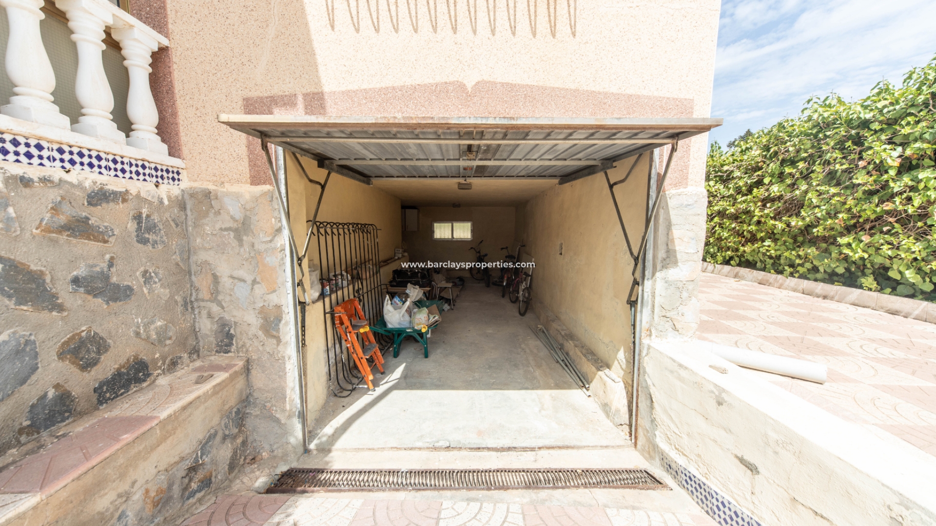 We betreden deze schilderachtige villa via de dubbele poort, die ons direct naar de tuin leidt die volledig geplaveid is, wat eenvoudig onderhoud betekent. Er is een ruime garage, die samen met de oprit twee tot drie parkeerplaatsen biedt.