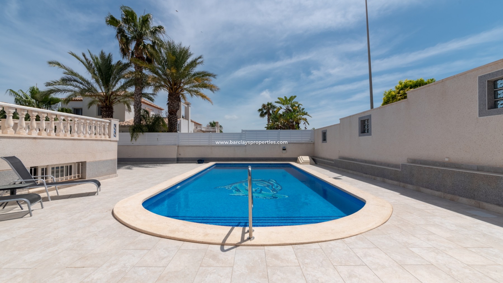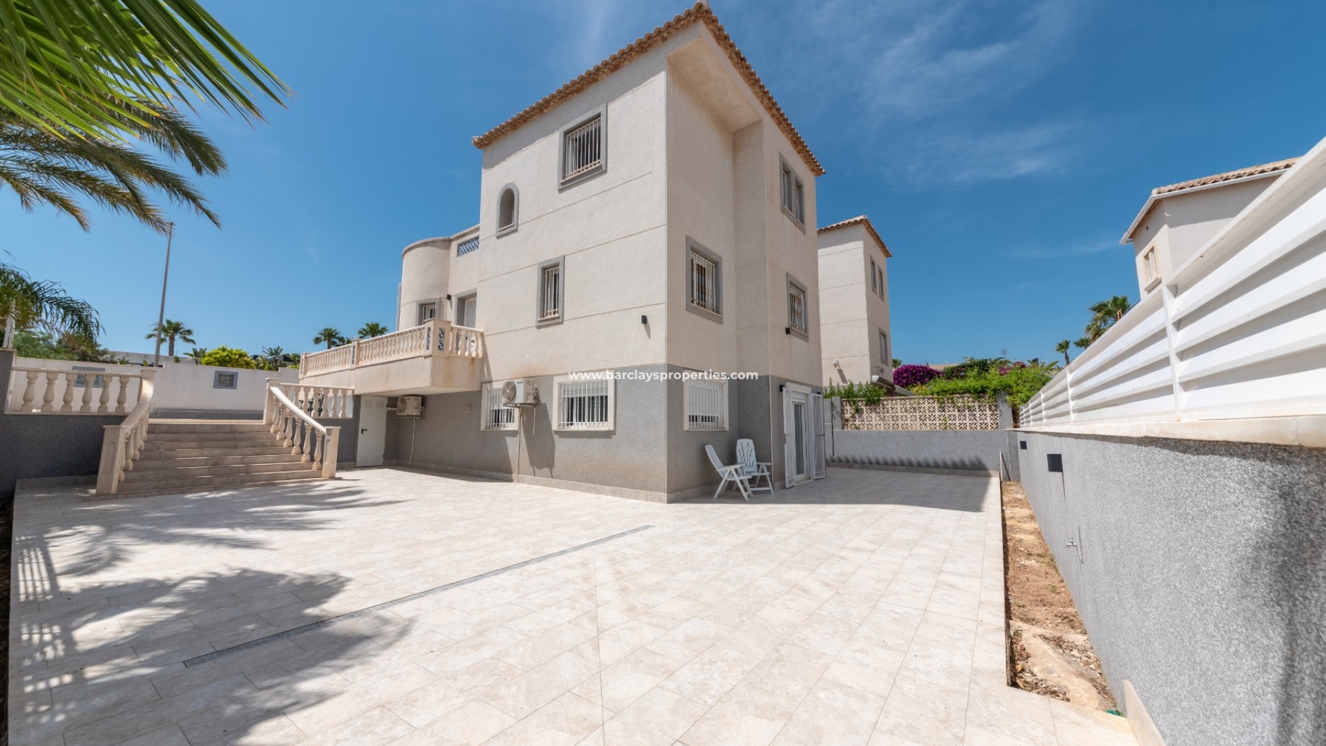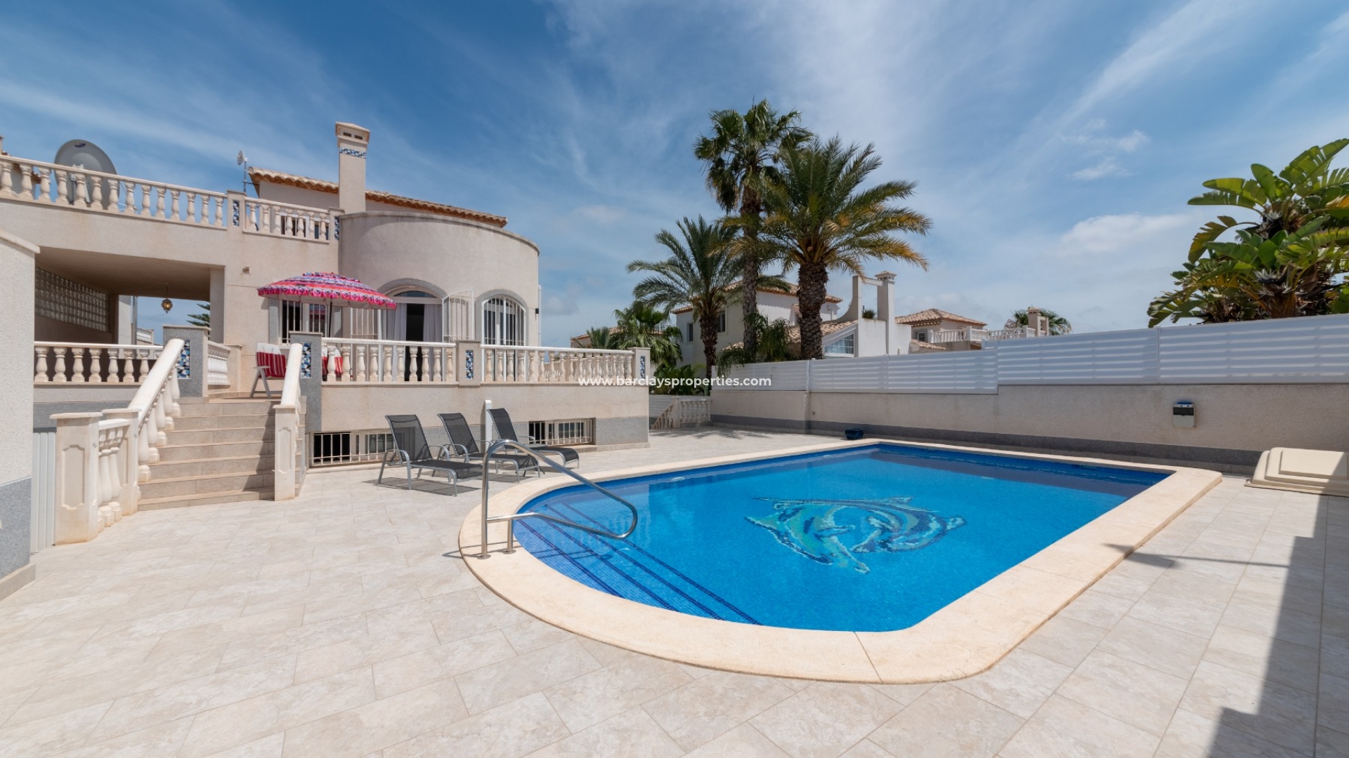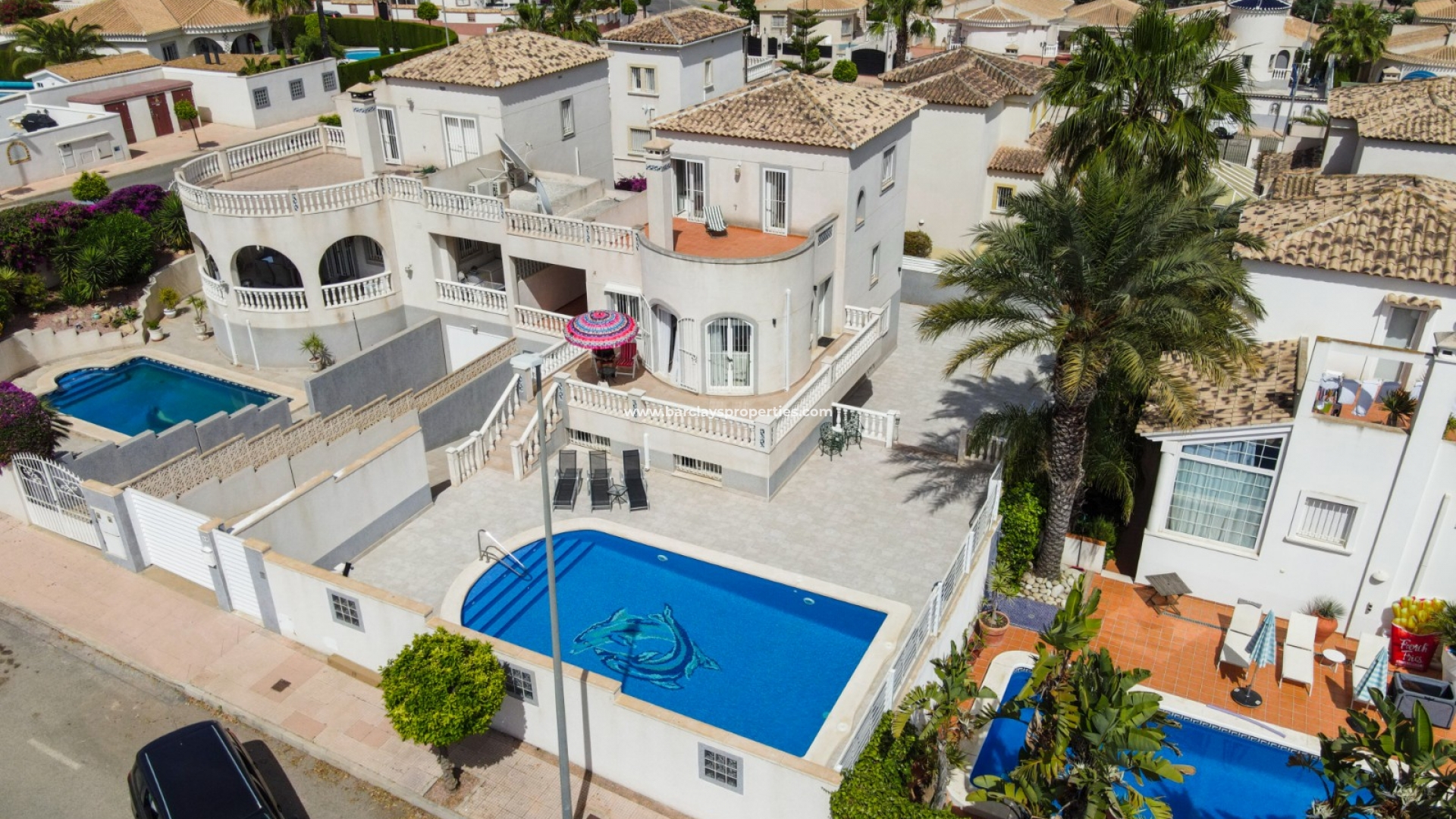 Gelegen in een goed formaat perceel van 510m2 is deze ruime zuid-westen gelegen 7 slaapkamer / 3 badkamer vrijstaande villa, een model "Ibiza" met leefruimte op drie verdiepingen. De villa heeft een prive zwembad van 5 x 9,5 binnen de verharde tuinen omgeven door hoge muren voor privacy. Dit is een prachtige eigenschap en een fantastische kans als er slechts een paar van dit type model gebouwd op de urbanisatie.