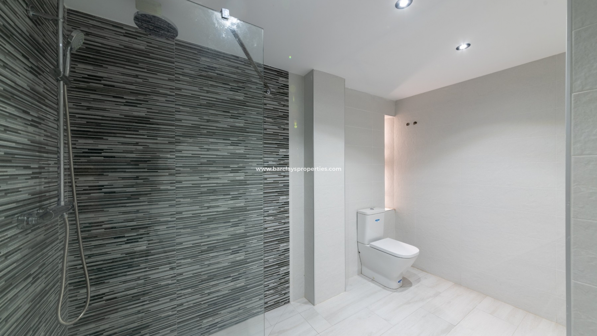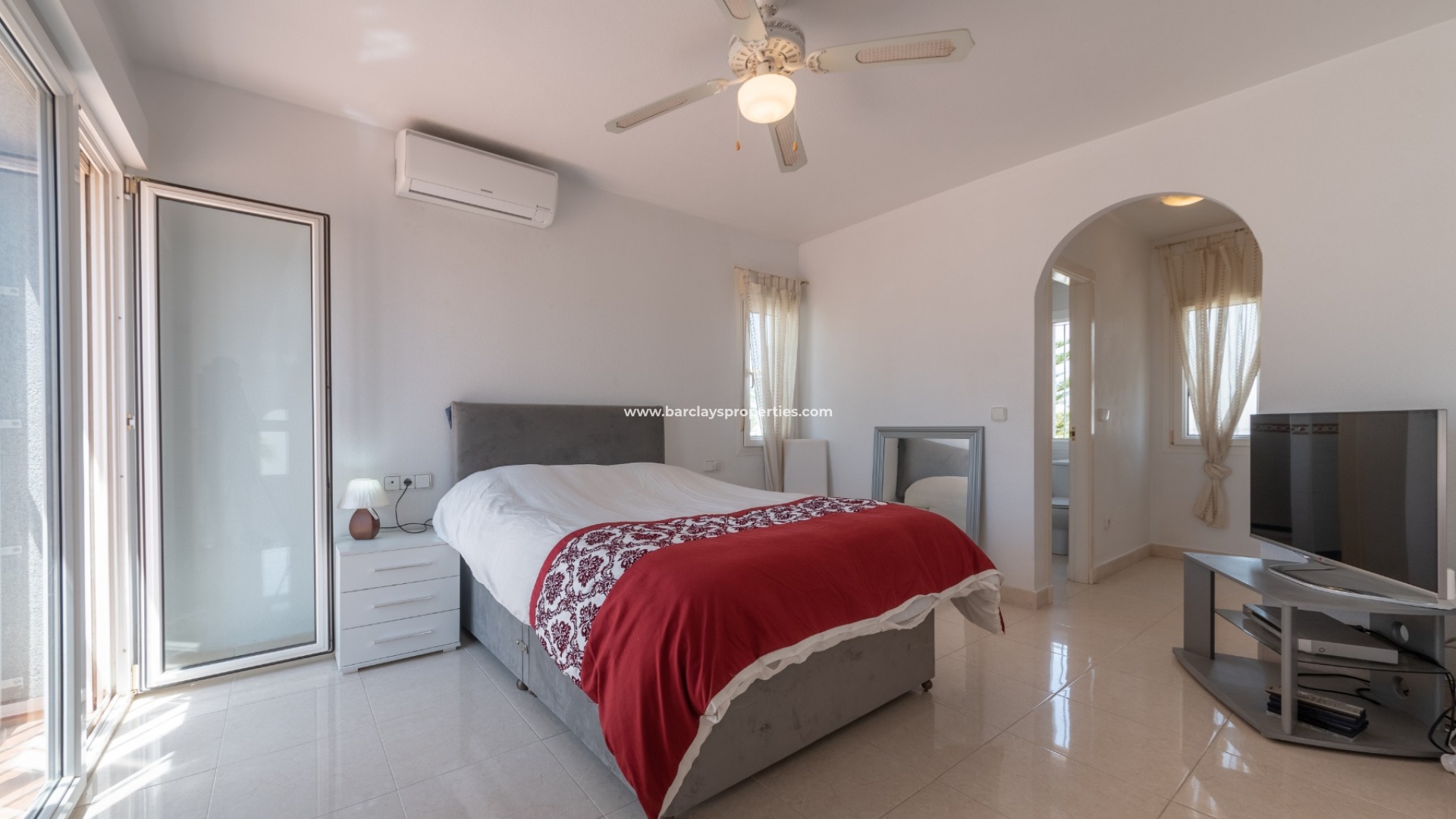 Een trap leidt naar de eerste verdieping waar we een grote hoofdslaapkamer vinden met airconditioning, plafondventilatoren, een en-suite badkamer uitgerust met hoekdouche en heeft een spectaculair zonneterras met prachtig uitzicht op de bergen, evenals uitzicht op het zwembad. Een vierde tweepersoonsslaapkamer is te vinden op de eerste verdieping.