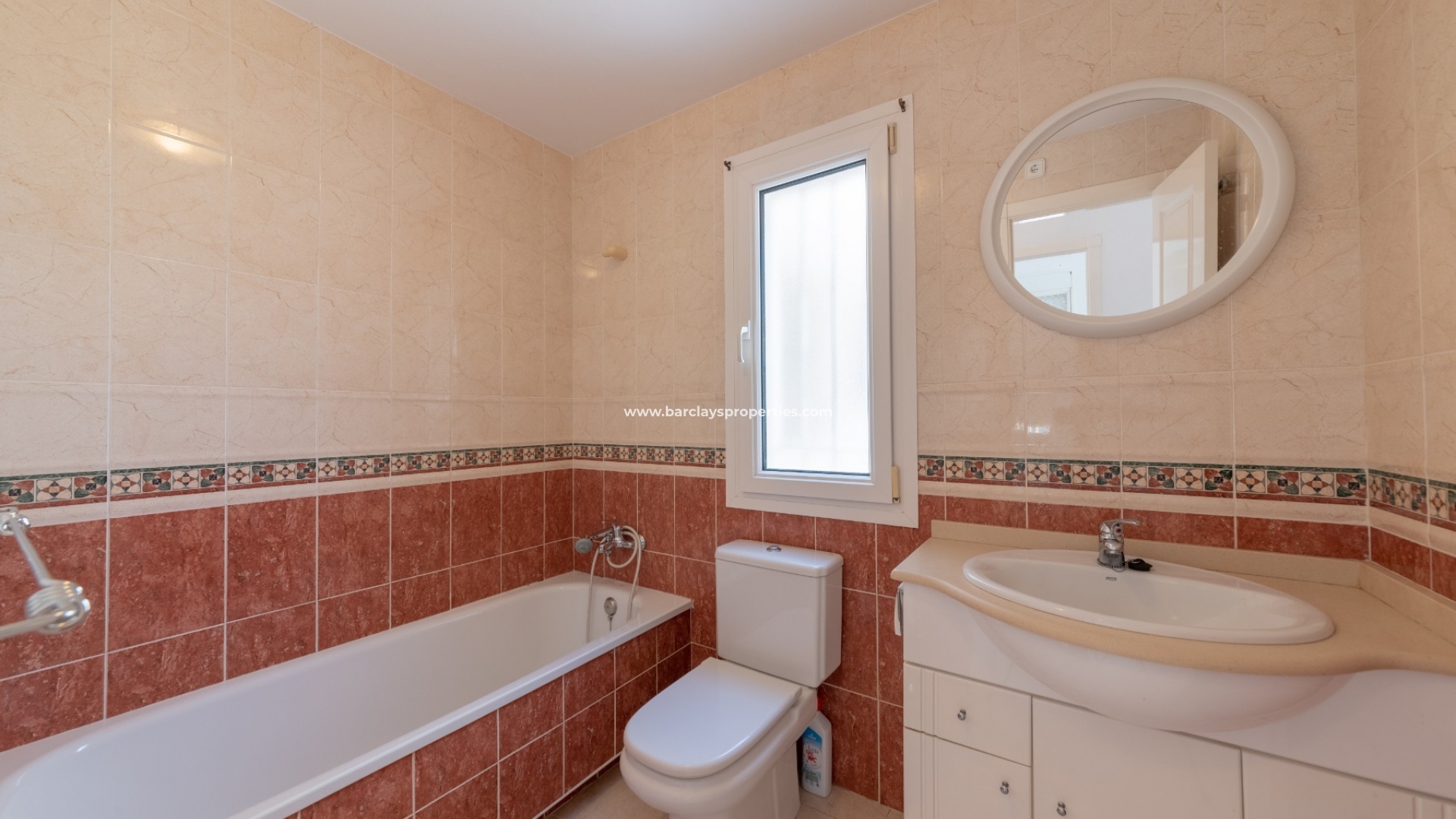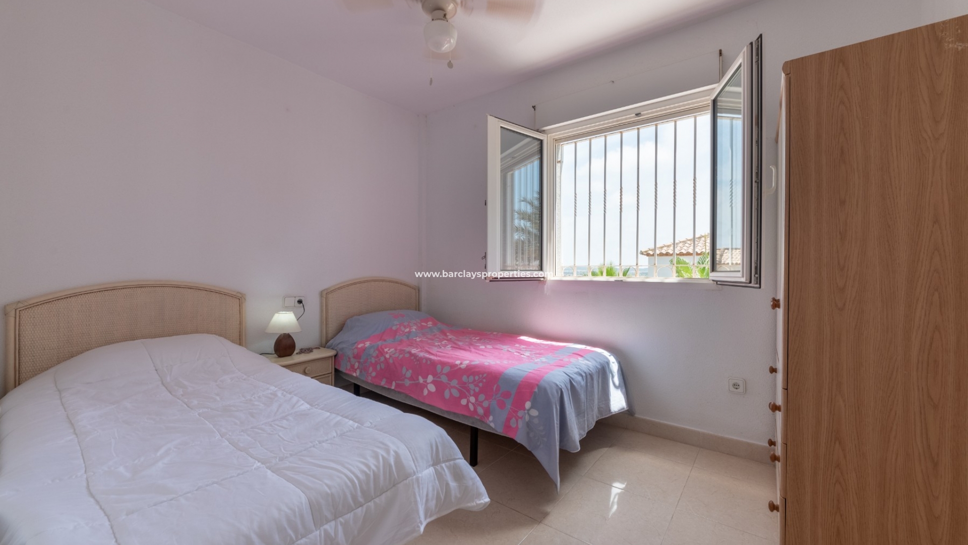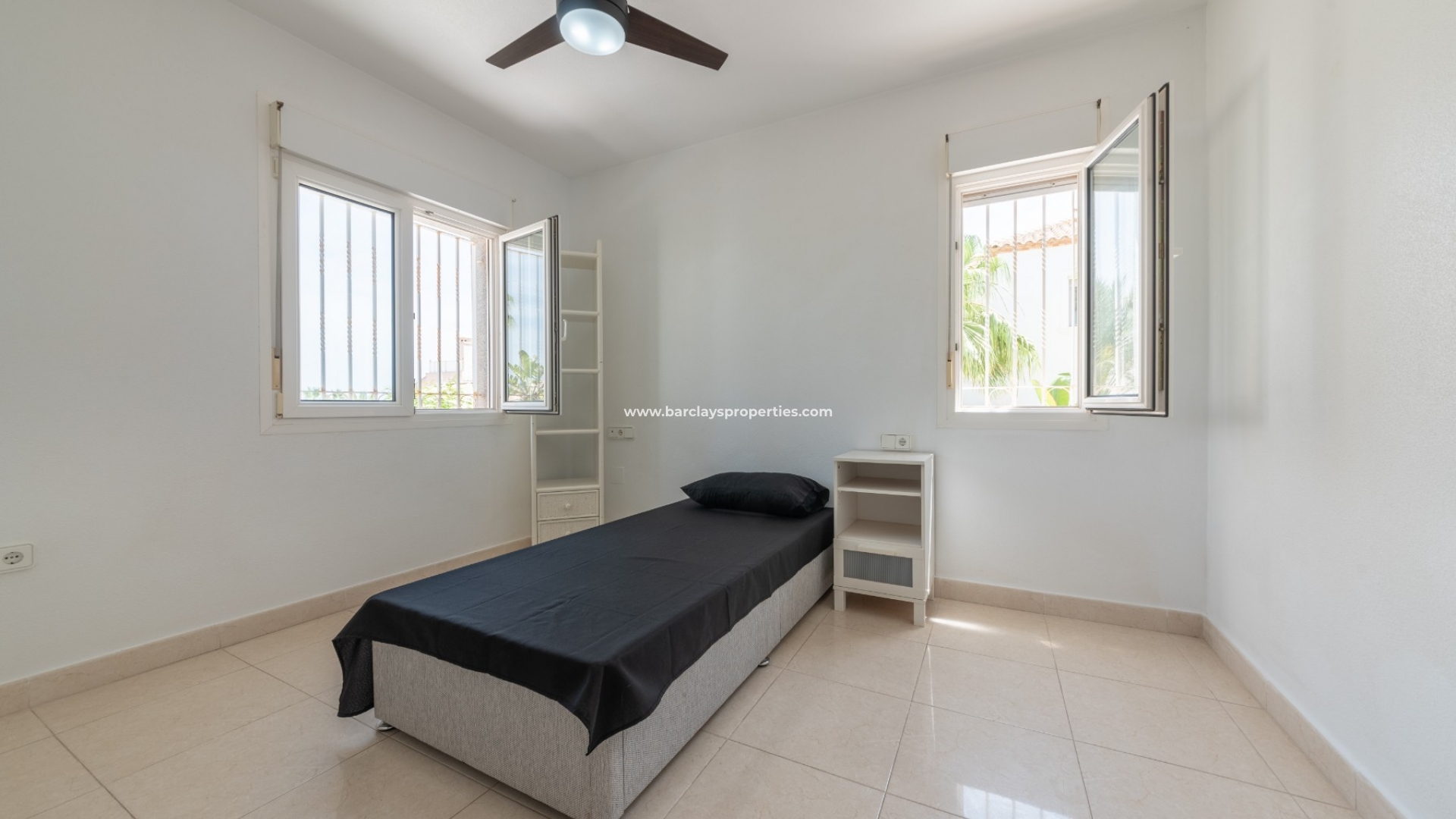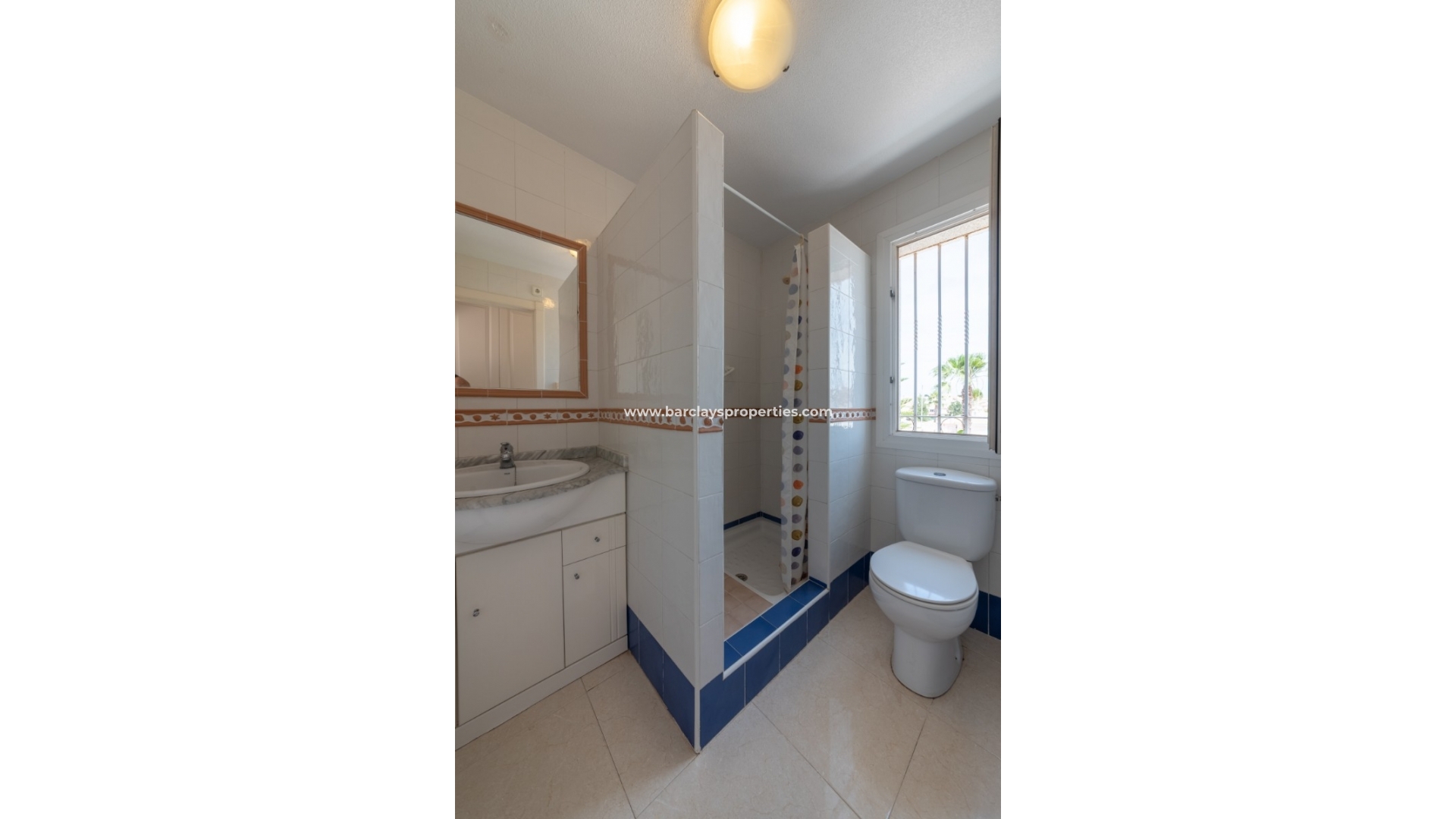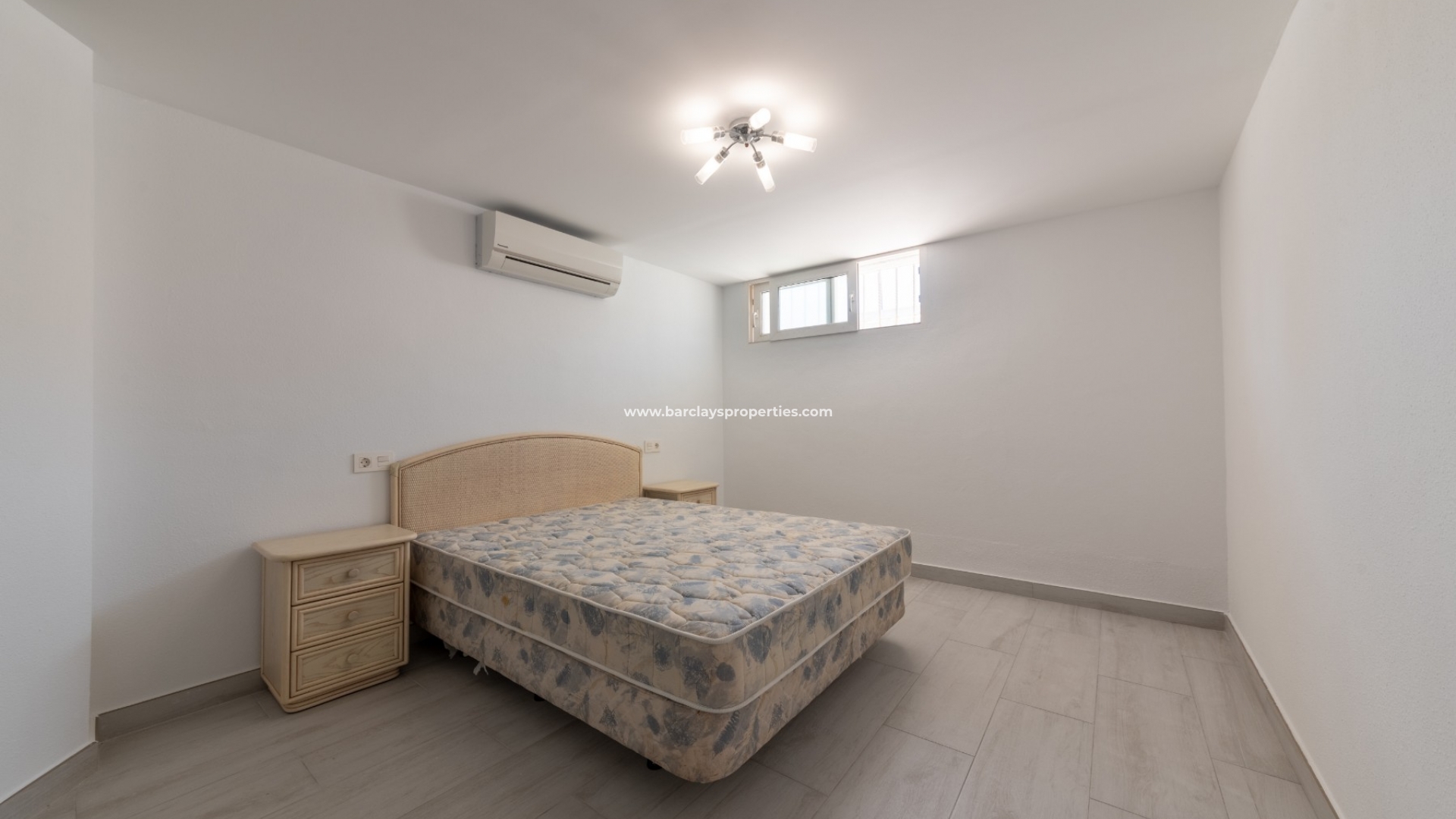 De begane grond op straatniveau nodigt ons uit naar het interieur van de villa en een grote lichte woonkamer met open haard, airconditioning, plafondspots en openslaande deuren die leiden naar een groot zonneterras. De onafhankelijke volledig ingerichte keuken is voorzien van een dubbel granieten werkblad met geïntegreerde kookplaat en oven. Een bijkeuken leidt naar een ruim overdekt buitenterras. Vanuit de hal vinden we 2 dubbele slaapkamers met ingebouwde kasten en plafondventilatoren en een familie badkamer met full size bad, w.c en wastafel.