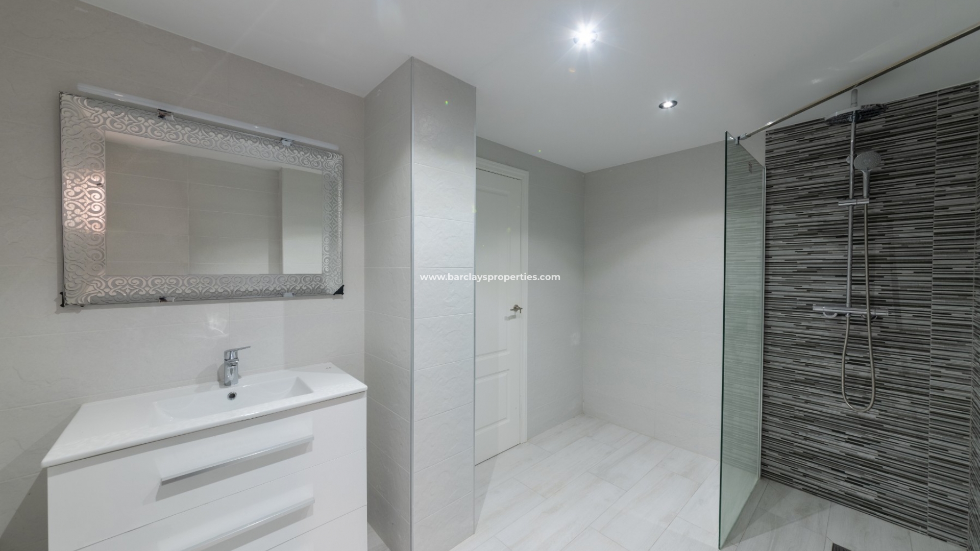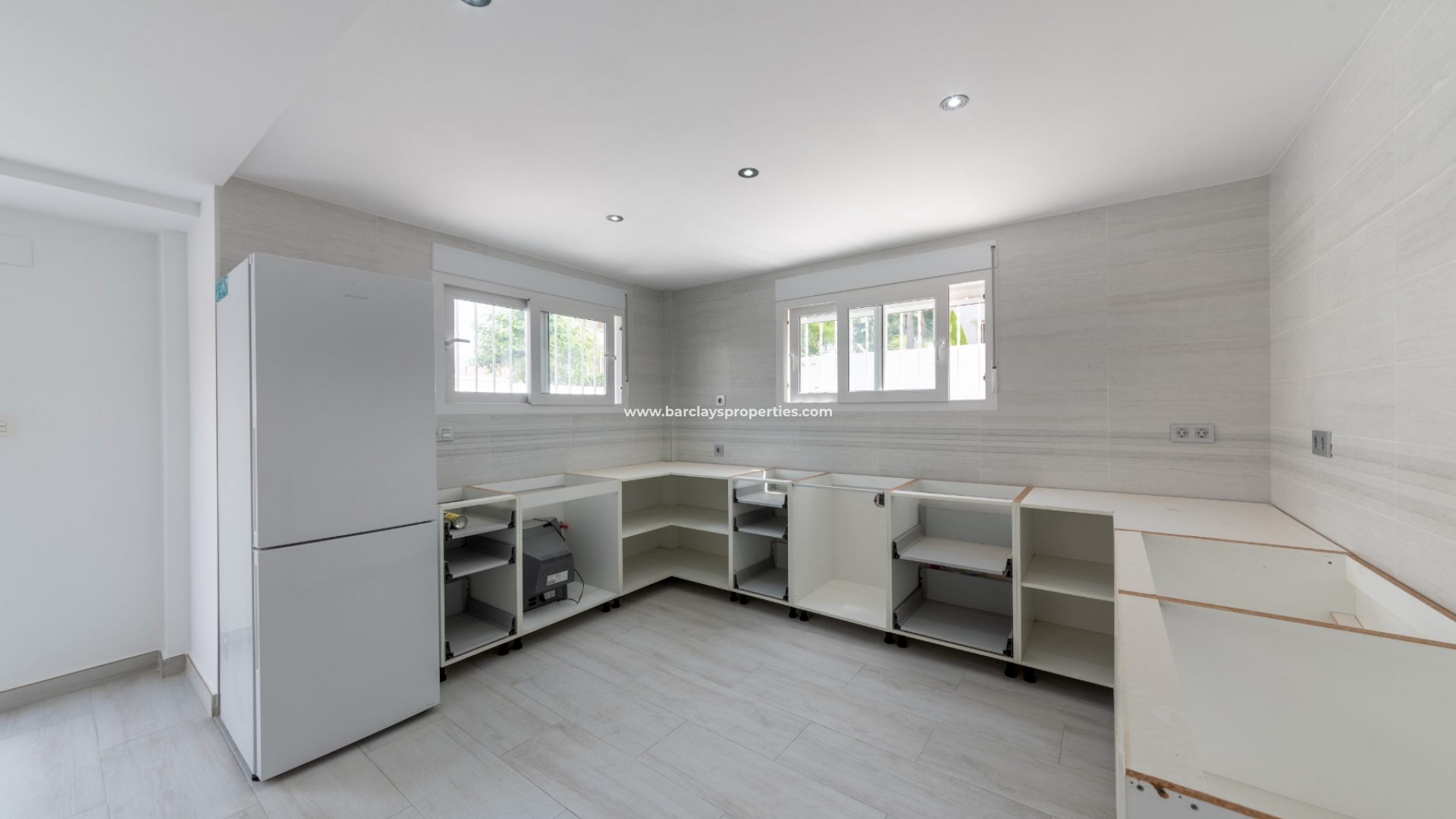 Bij het betreden van het pand via de onderbouw vinden we het is volledig gerenoveerd en biedt een grote woonkamer met airconditioning, spotlights in heel en veel ramen om het licht door te laten stromen, een open gerenoveerde keuken, drie slaapkamers met inbouwkasten en airconditioning, een wasruimte met wasmachine en droger, een grote familie badkamer met hoekdouche, toilet, en moderne wastafel. De grote garage is toegankelijk op dit niveau.