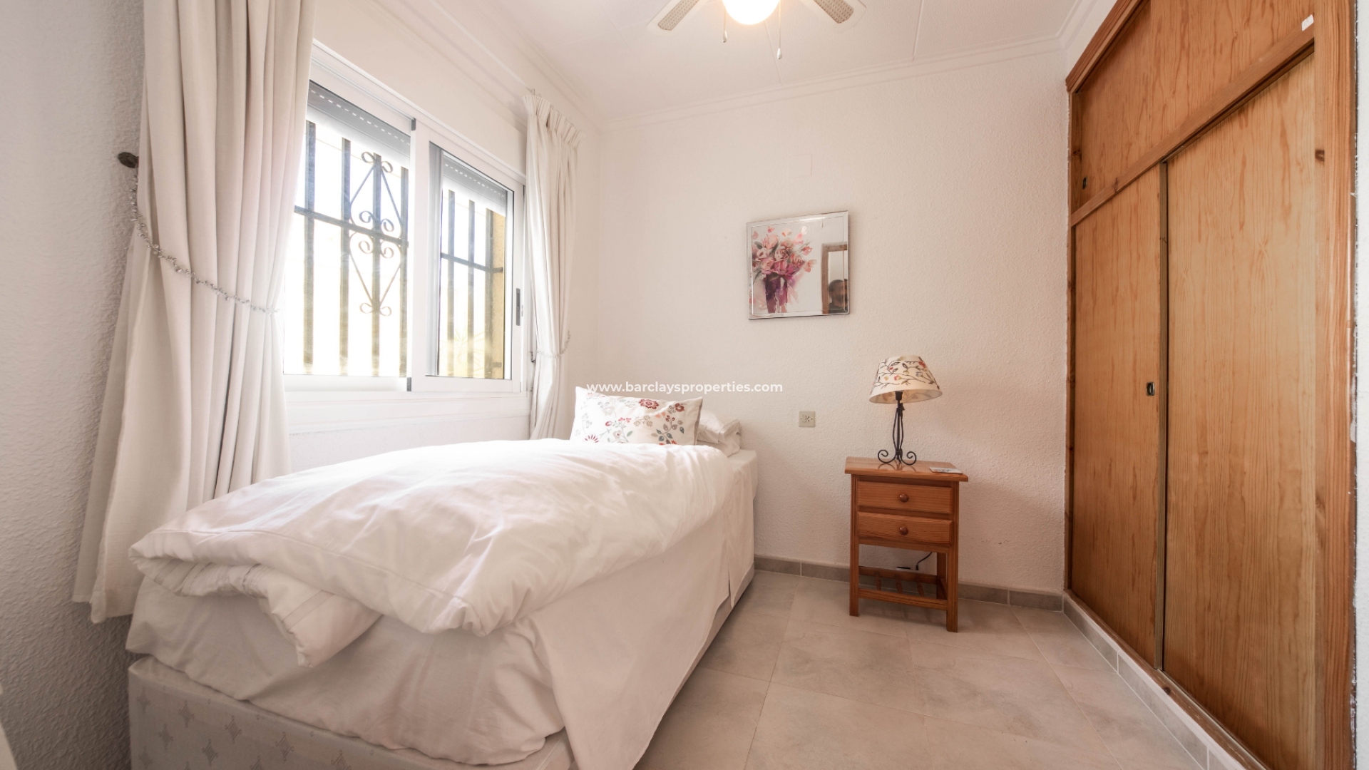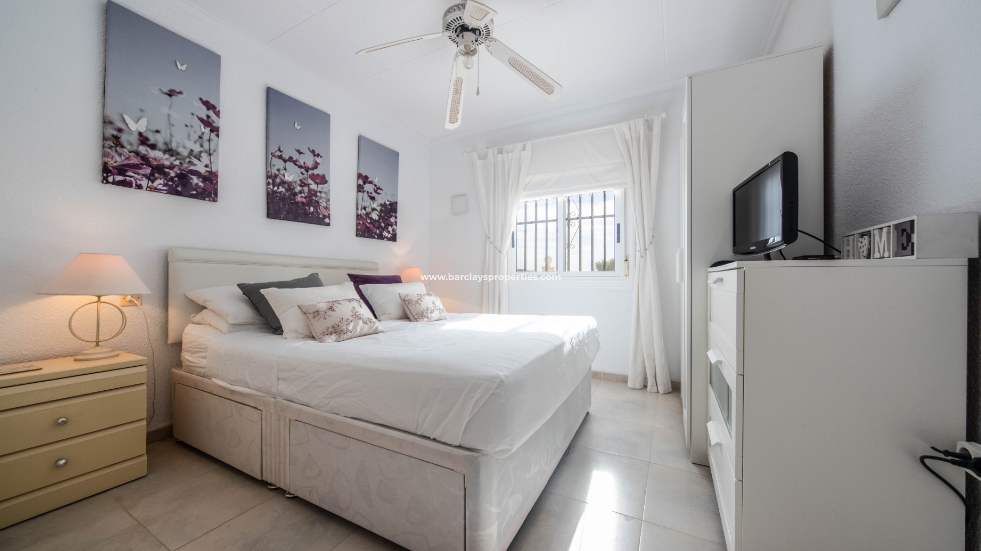 We betreden de volledig betegelde tuin en betreden de woning om de bijkeuken en onafhankelijke volledig ingerichte keuken te vinden die leidt naar een ruime en lichte woonkamer met open haard en plafondventilatoren. Vanuit de hal vinden we een badkamer met inloopdouche, een tweepersoons slaapkamer met inbouwkasten en plafondventilatoren en een andere slaapkamer met inbouwkasten en plafondventilator.