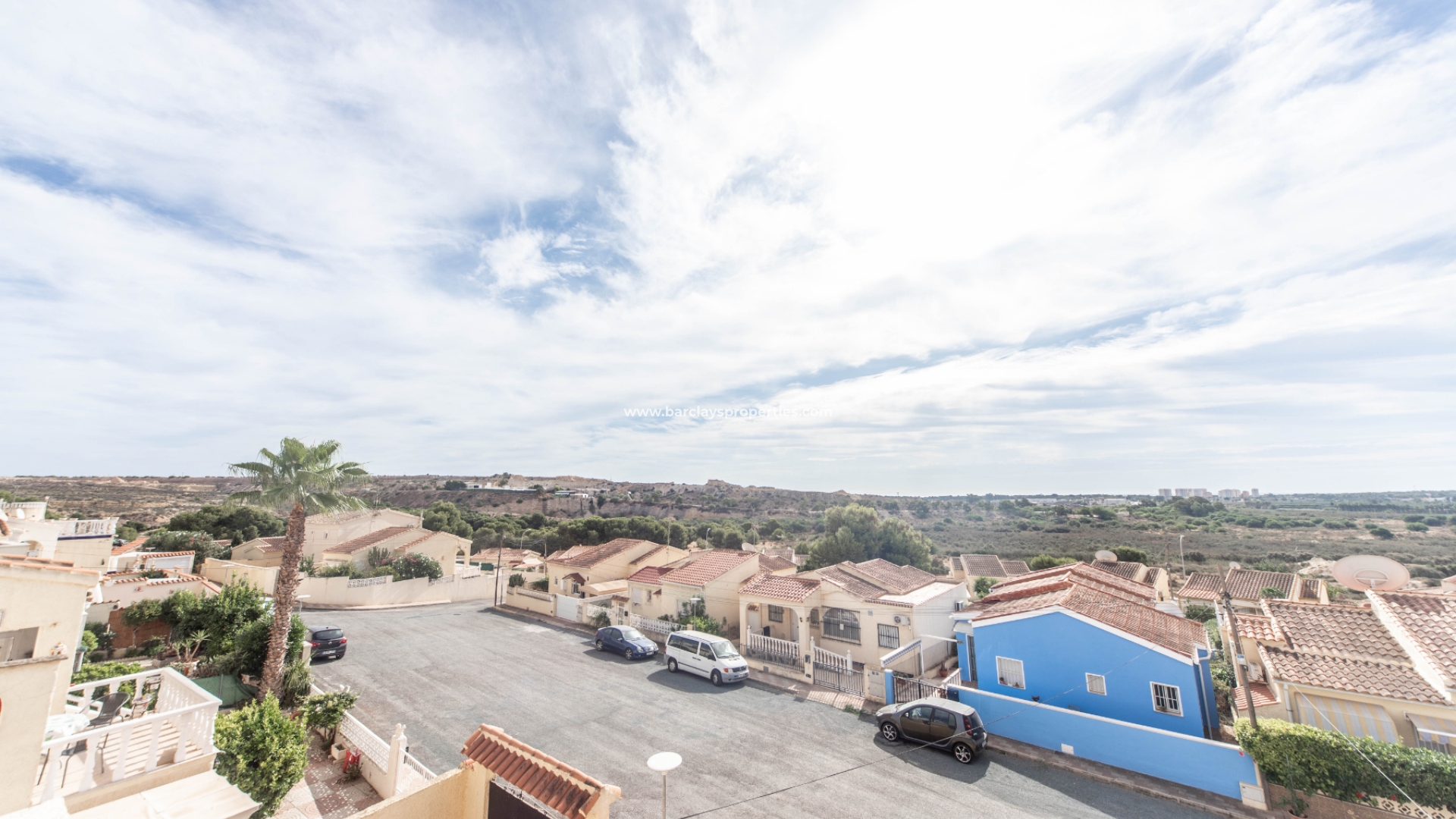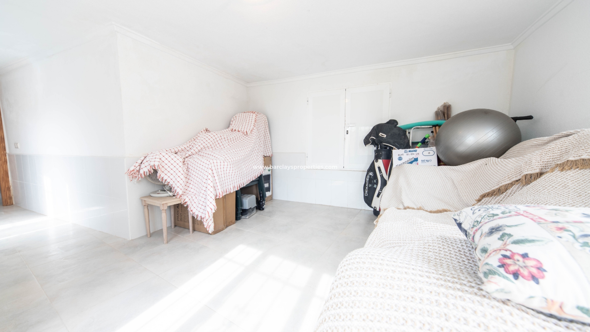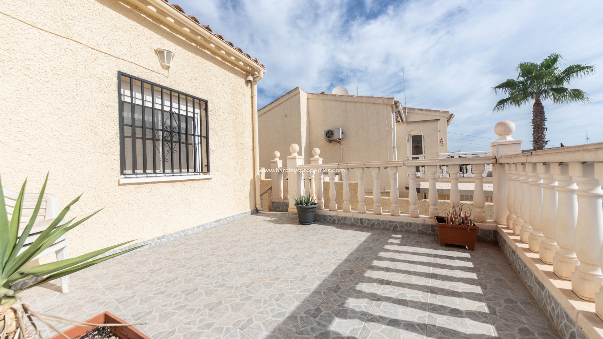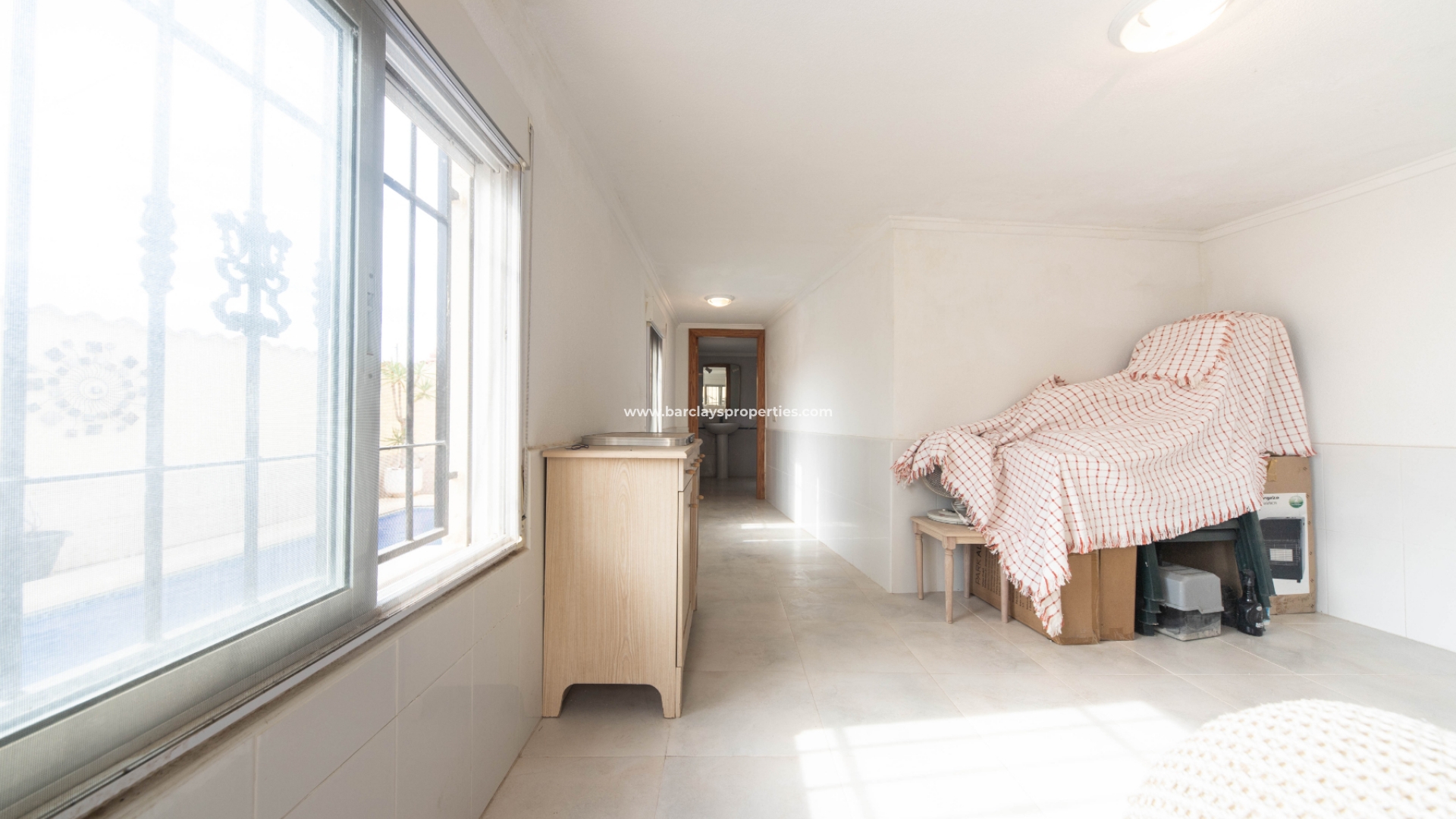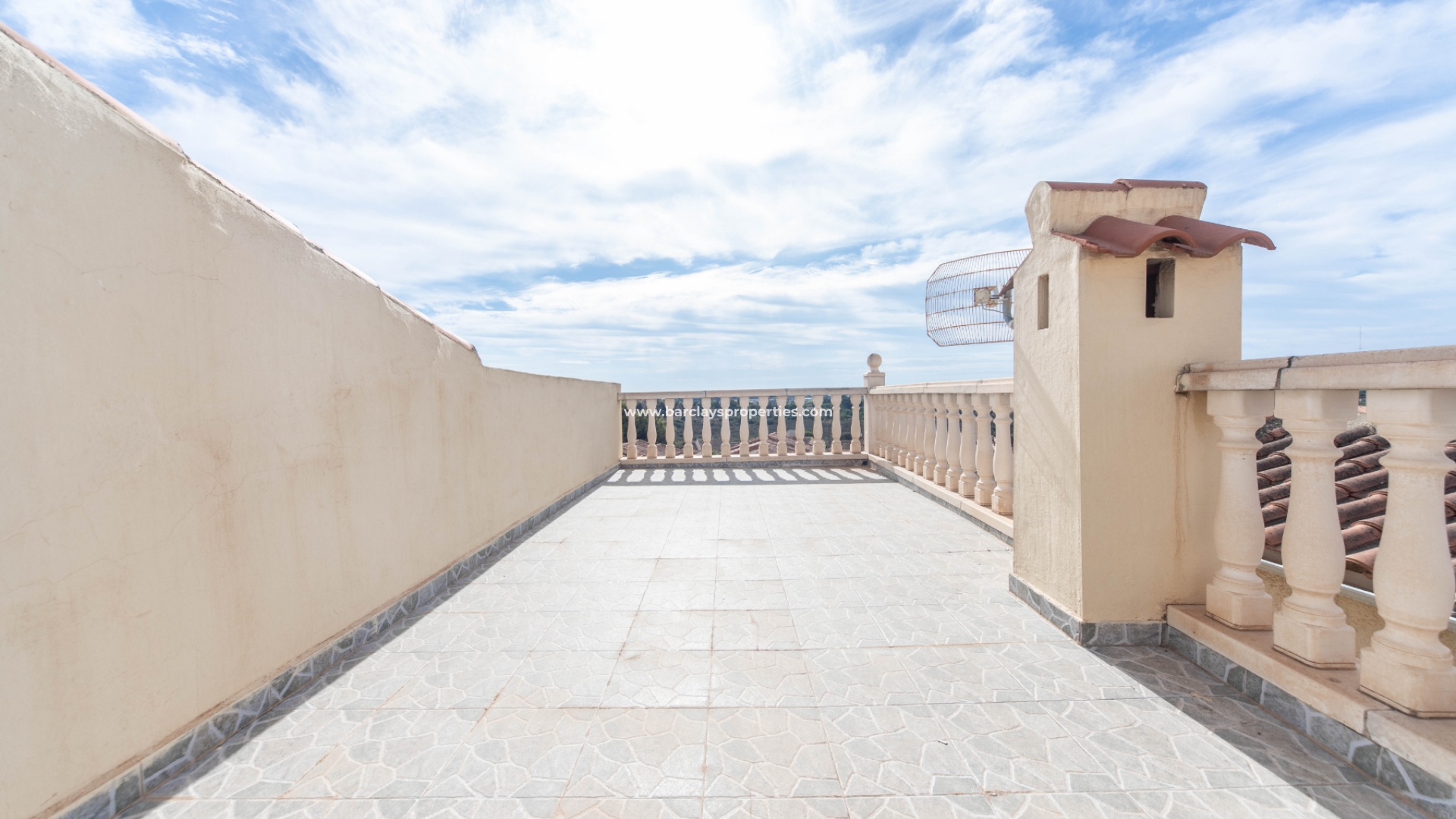 Terug naar buiten en naar de achtertuin is er een buitenzitje, opslagruimte en een wenteltrap die leidt naar een solarium op het dak met prachtig uitzicht op het platteland en in de richting van Guardamar del Segura.