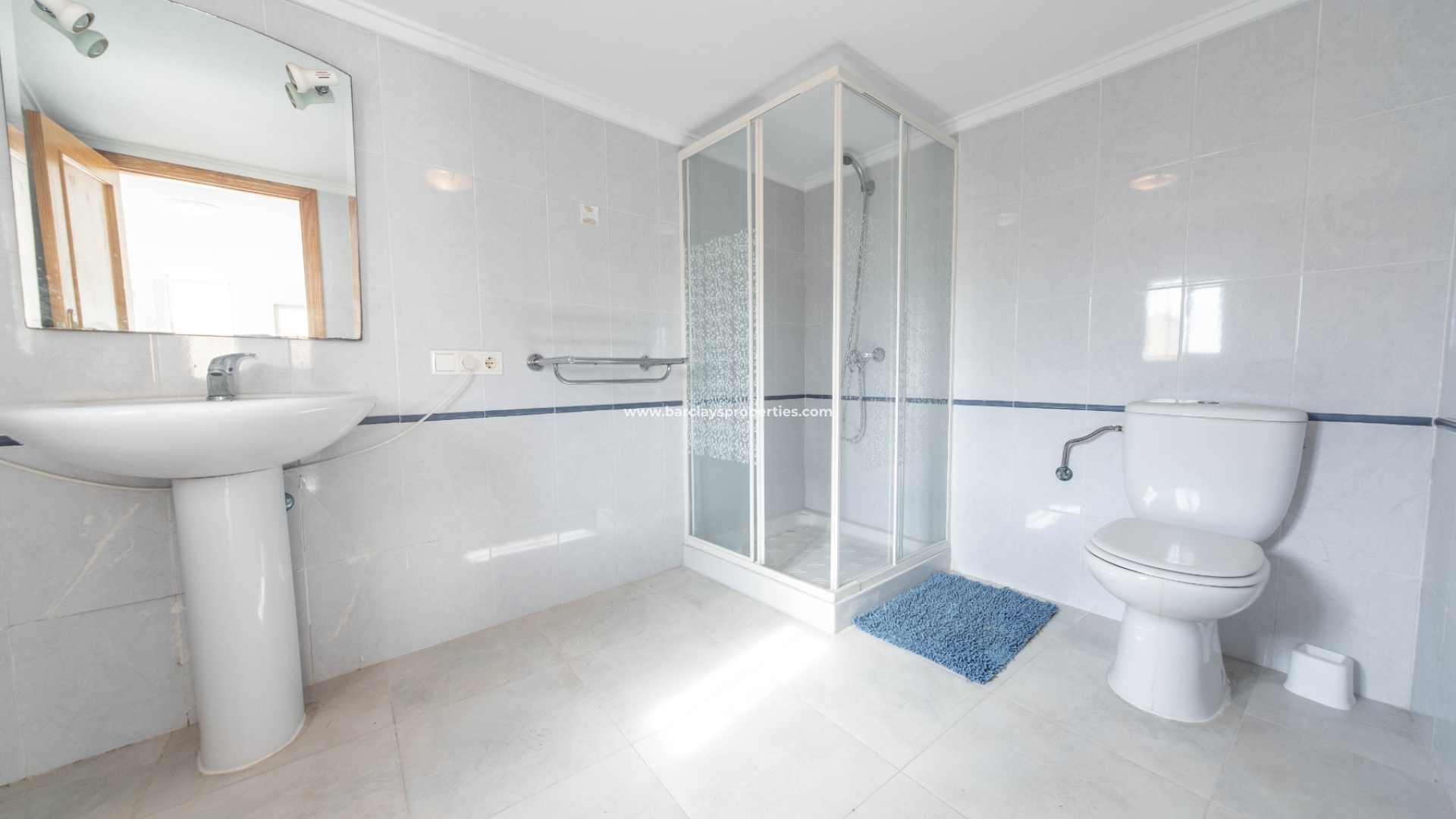 Vanuit de woonkamer vinden we een glazen terras met zitjes en openslaande deuren naar een verhoogd zonneterras met uitzicht op de naburige badplaats Guardamar del Segura. Treden leiden naar de zijtuin waar we toegang vinden tot een ruime onderbouw, we vinden er een extra open woon/slaapkamer en een grote badkamer met hoekdouche, ideaal als gastenverblijf.