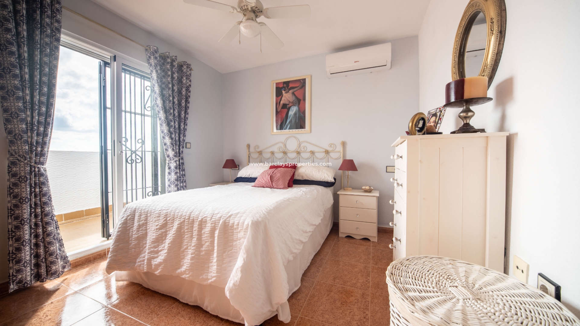 Een trap leidt naar de eerste verdieping met een ruime badkamer met ligbad, twee tweepersoons slaapkamers met inbouwkasten (een slaapkamer heeft ook een plafondventilator, de ouderslaapkamer heeft airconditioning en toegang via een terrasdeur naar een eigen zonneterras met prachtig uitzicht op zee en de bergen).