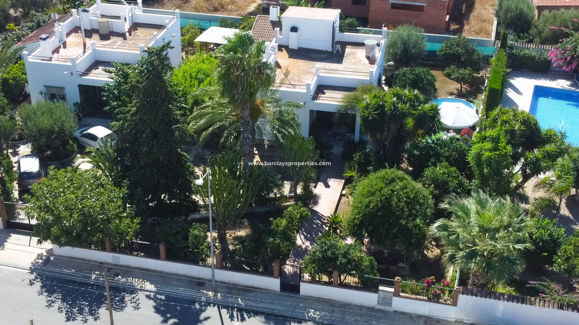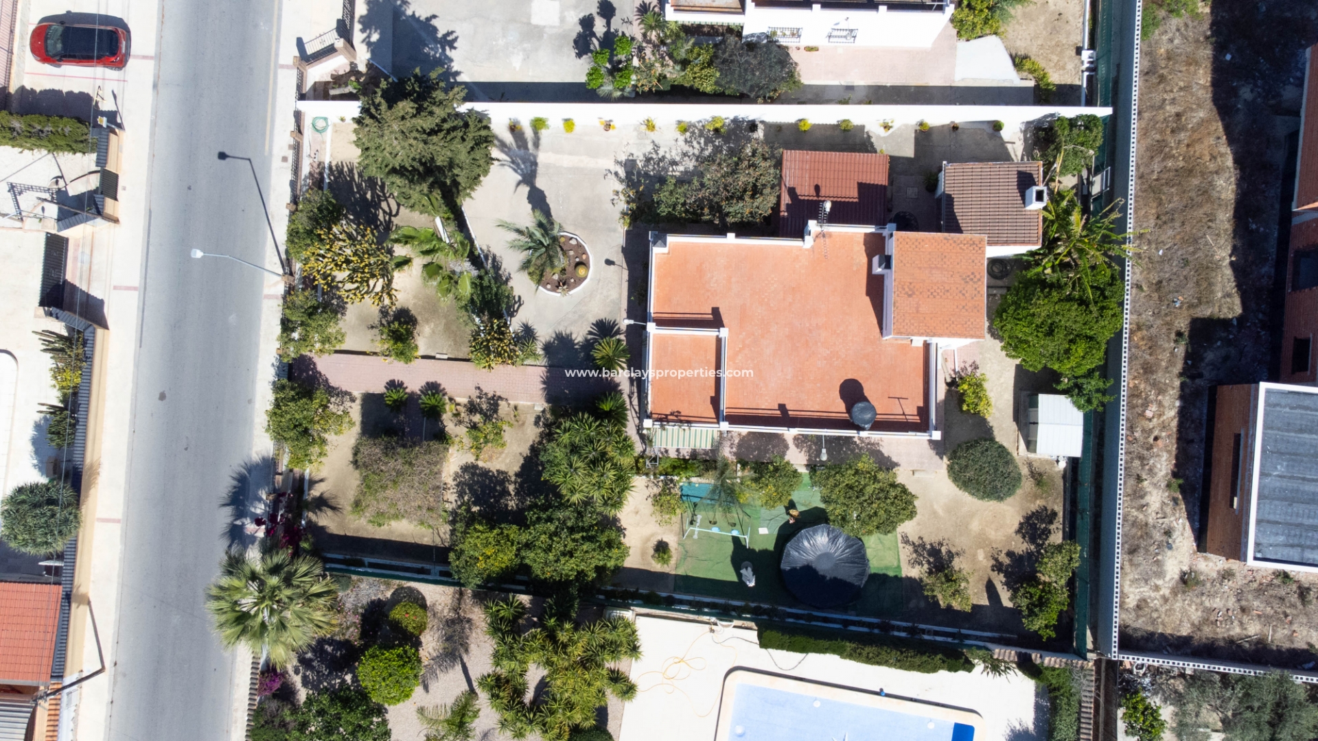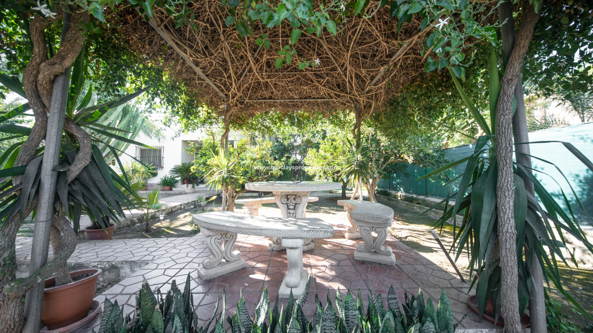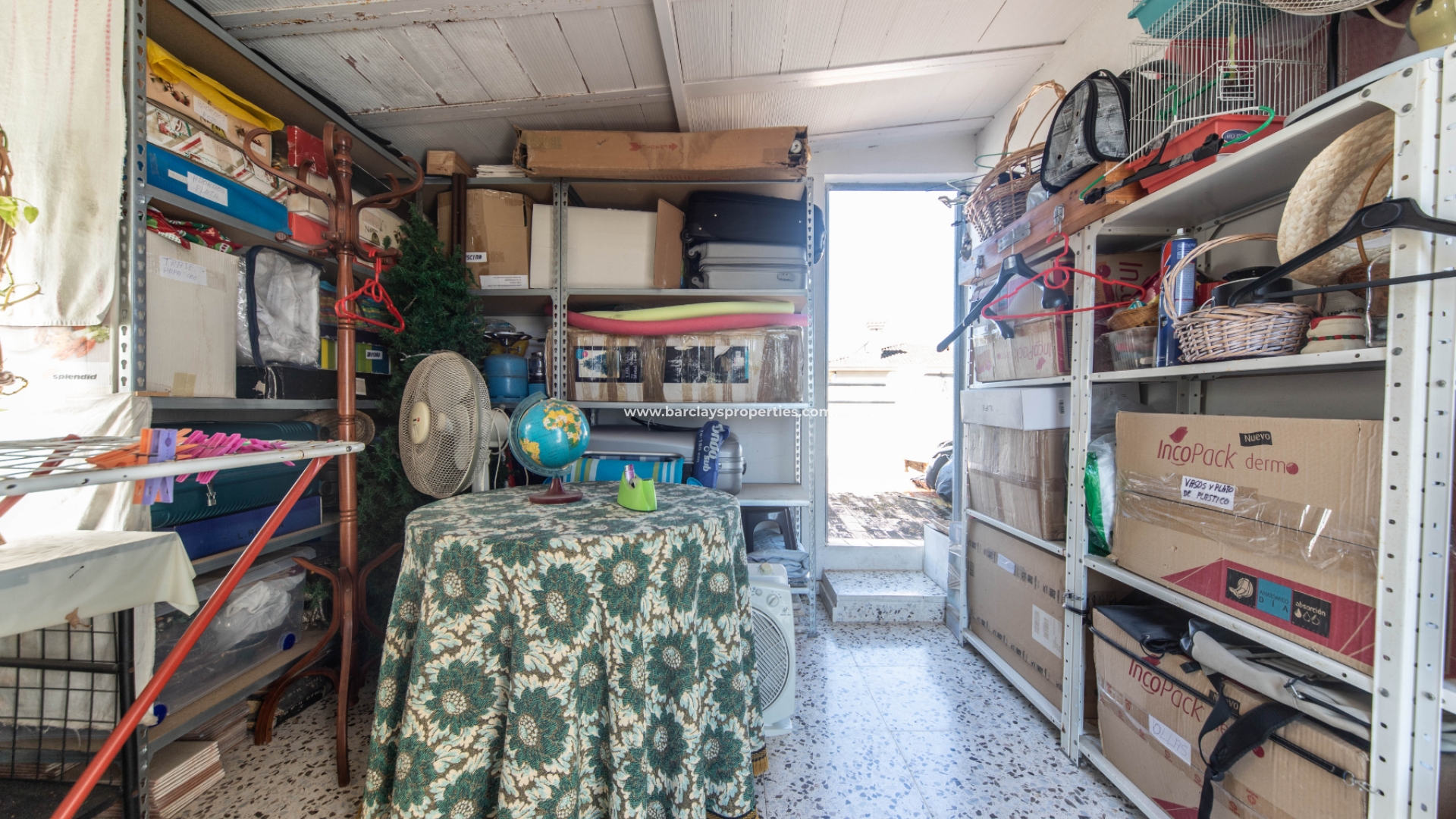 Het pand heeft een apart gebouw met een buitenkeuken en barbecue en vlakbij is er een wenteltrap die leidt naar een grote bergruimte die leidt naar het solarium op het dak met prachtig adembenemend uitzicht over de urbanisatie El Oasis en naar het platteland en de bergen.