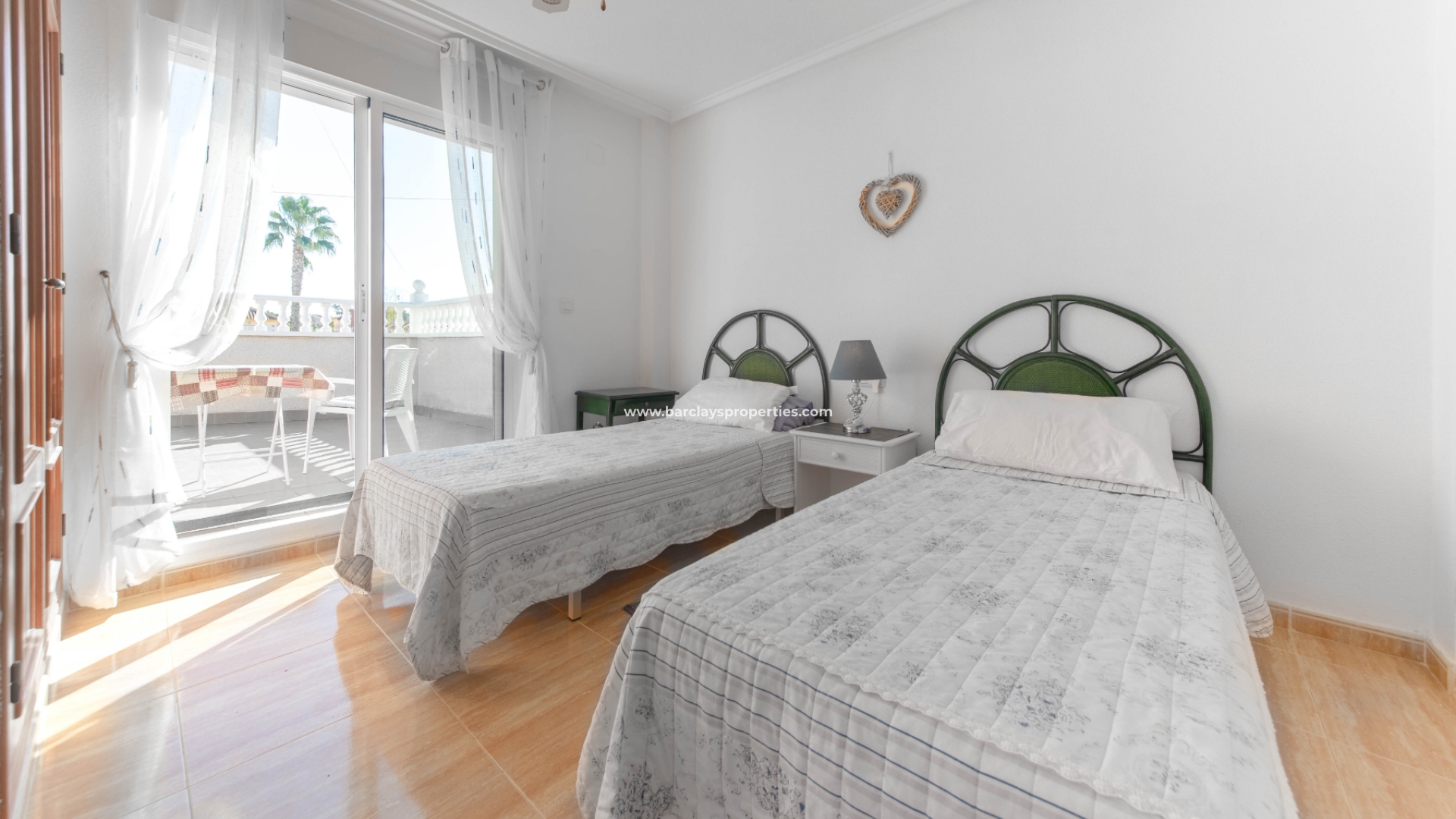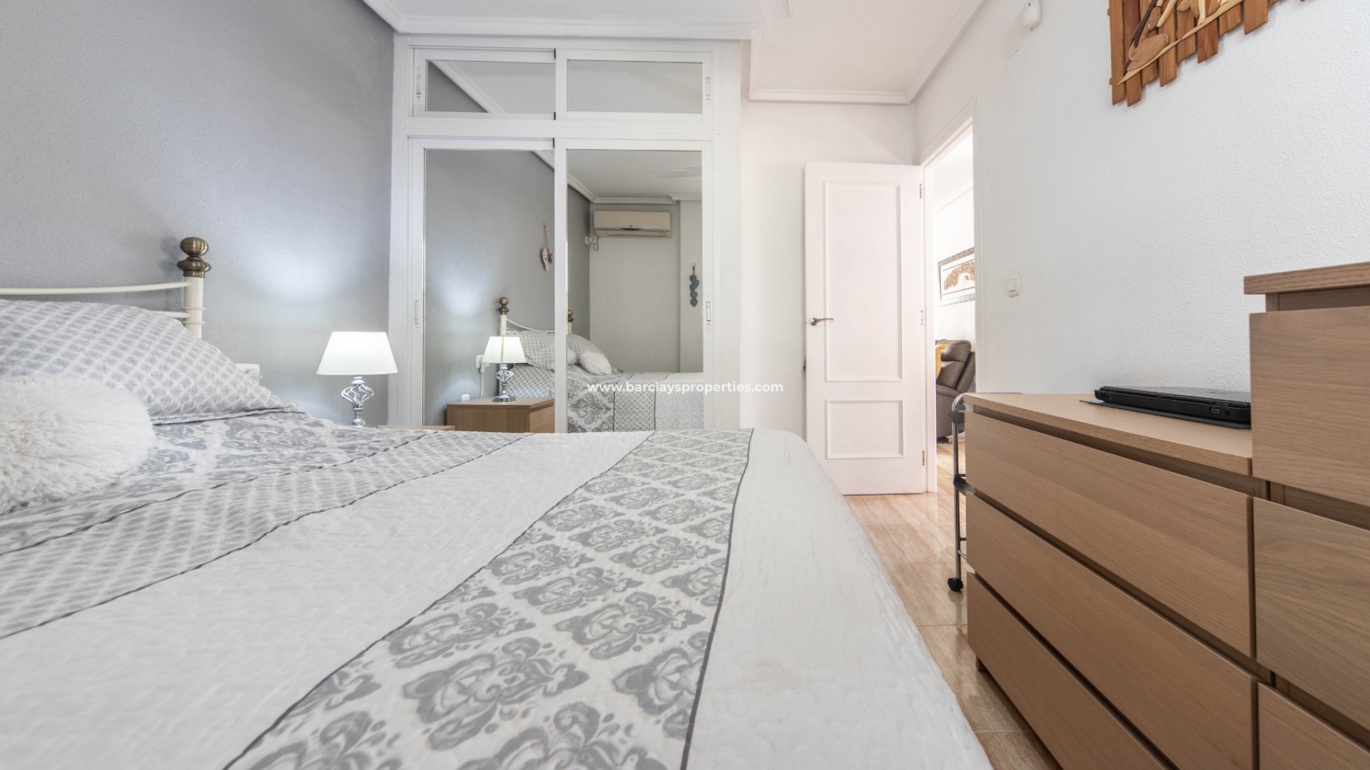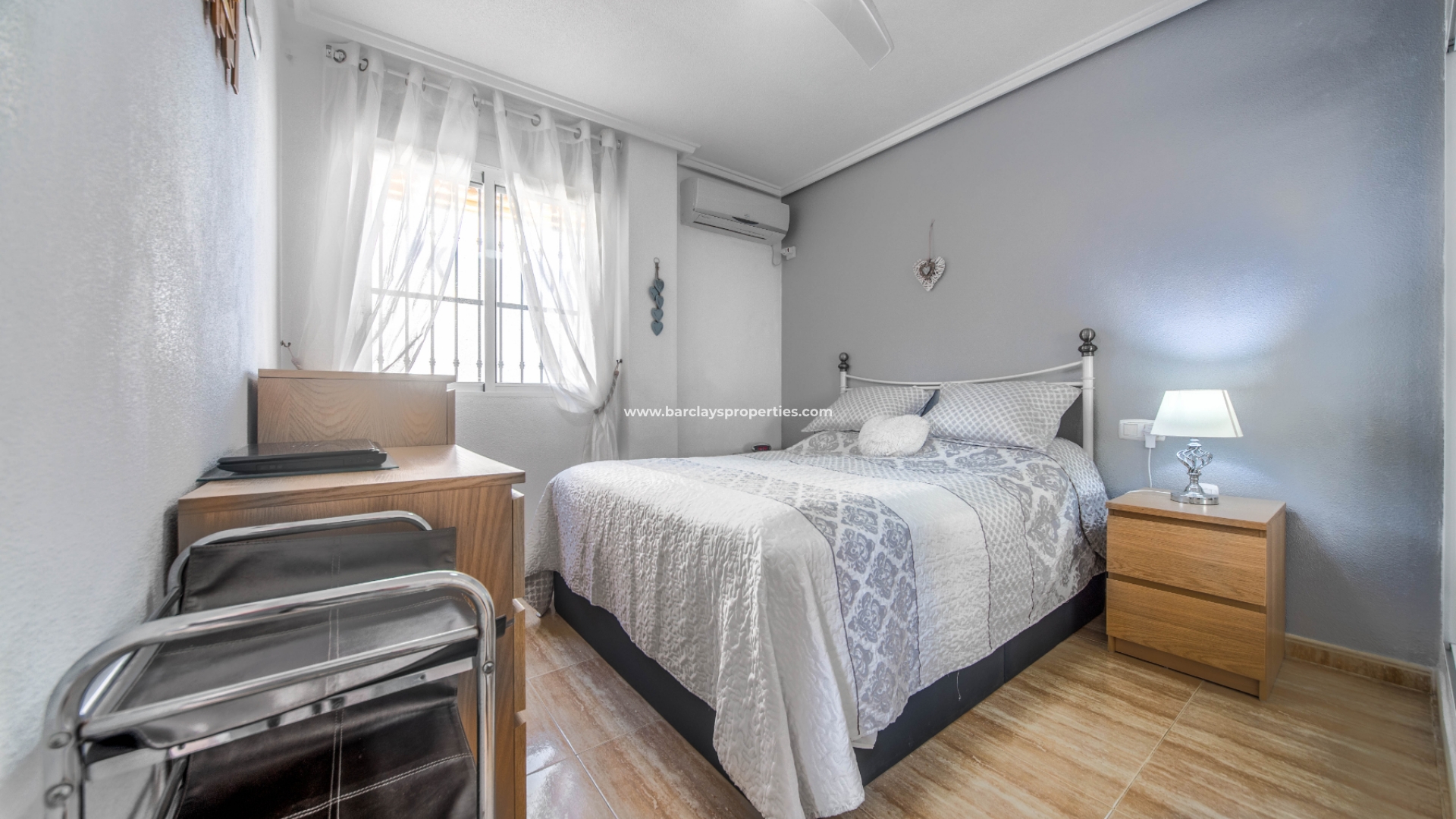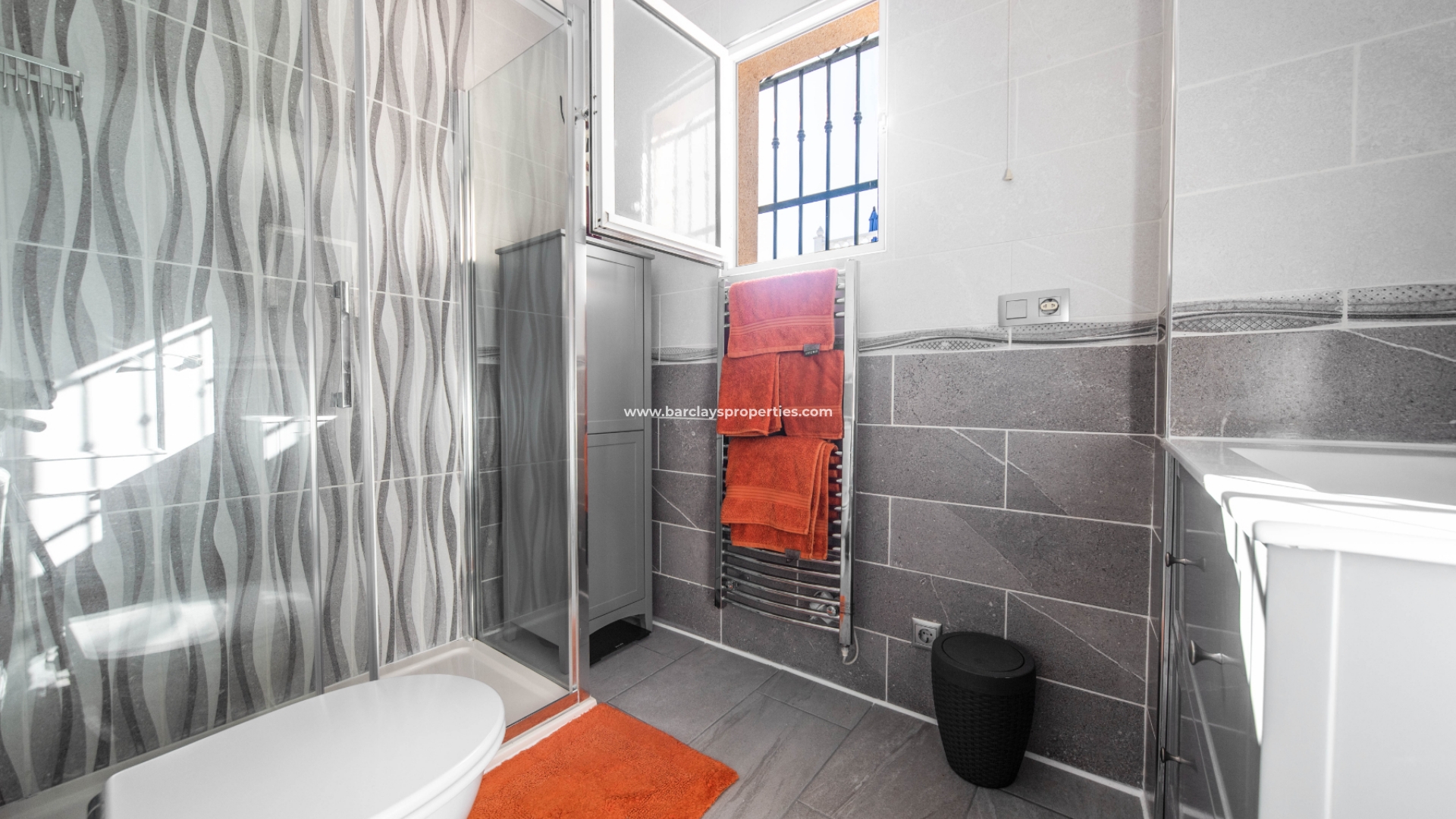 Vanuit de hal vinden we twee tweepersoons slaapkamers met gespiegelde inbouwkasten en airconditioning (de grootste heeft ook een plafondventilator). De badkamer is gerenoveerd en voorzien van een modern glazen douchescherm, verwarmd aluminium handdoekenrek, verwarming boven de deur en smaakvolle betegeling.