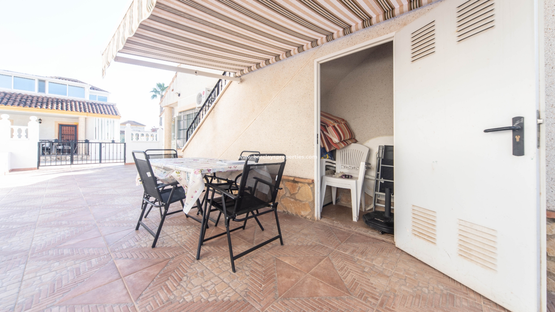 We betreden de tuin en vinden een volledig verharde parkeerplaats en een eethoek met zonnescherm en de buitentrap met berging onder de trap die leidt naar de bovenverdieping waar we het aparte gastenverblijf vinden met een groot zonneterras met uitzicht op het gemeenschappelijke zwembad. Dit bovenste niveau van het pand biedt een tweepersoons slaapkamer met inbouwkast, airconditioning, plafondventilator en toegang tot het grote zonneterras, evenals een badkamer met kamerbrede douche.