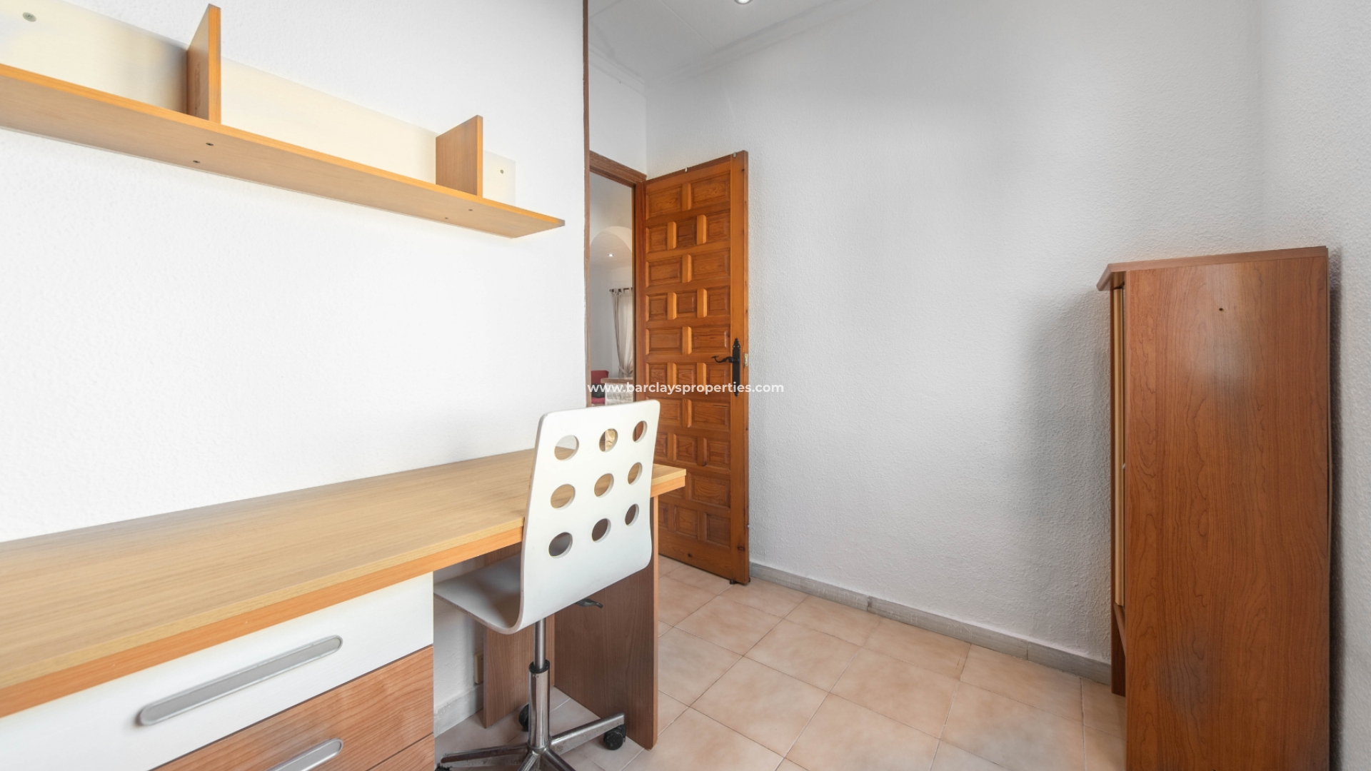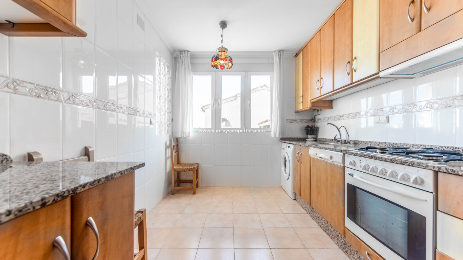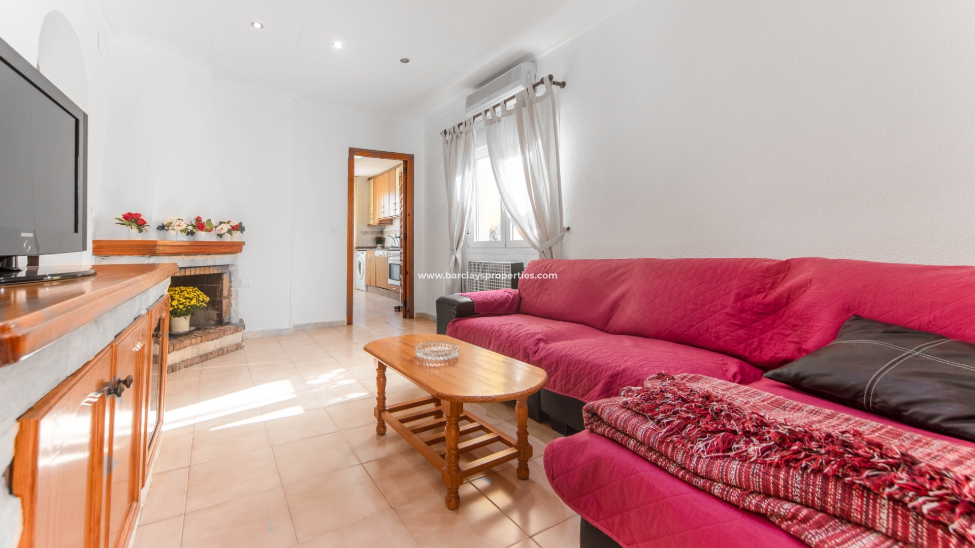 Een patiodeur leidt ons naar het voorportaal dat toegang geeft tot het interieur van het pand en de lichte woonkamer met open haard, gasverwarming, airconditioning en plafondspots, een onafhankelijke ingerichte keuken met nieuwe eenheden en marmeren werkbladen met veel bergruimte. De hal leidt naar de rest van de kamers: een onlangs gerenoveerde badkamer met muur tot muur douche en drie ruime slaapkamers (een heeft airconditioning).