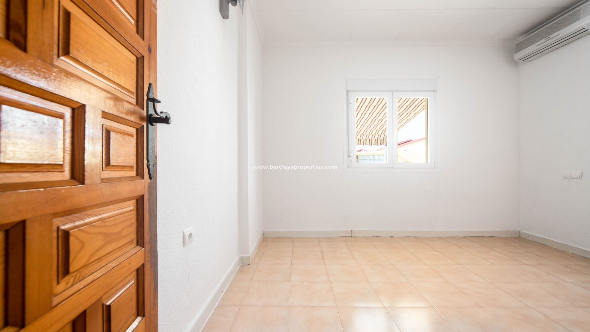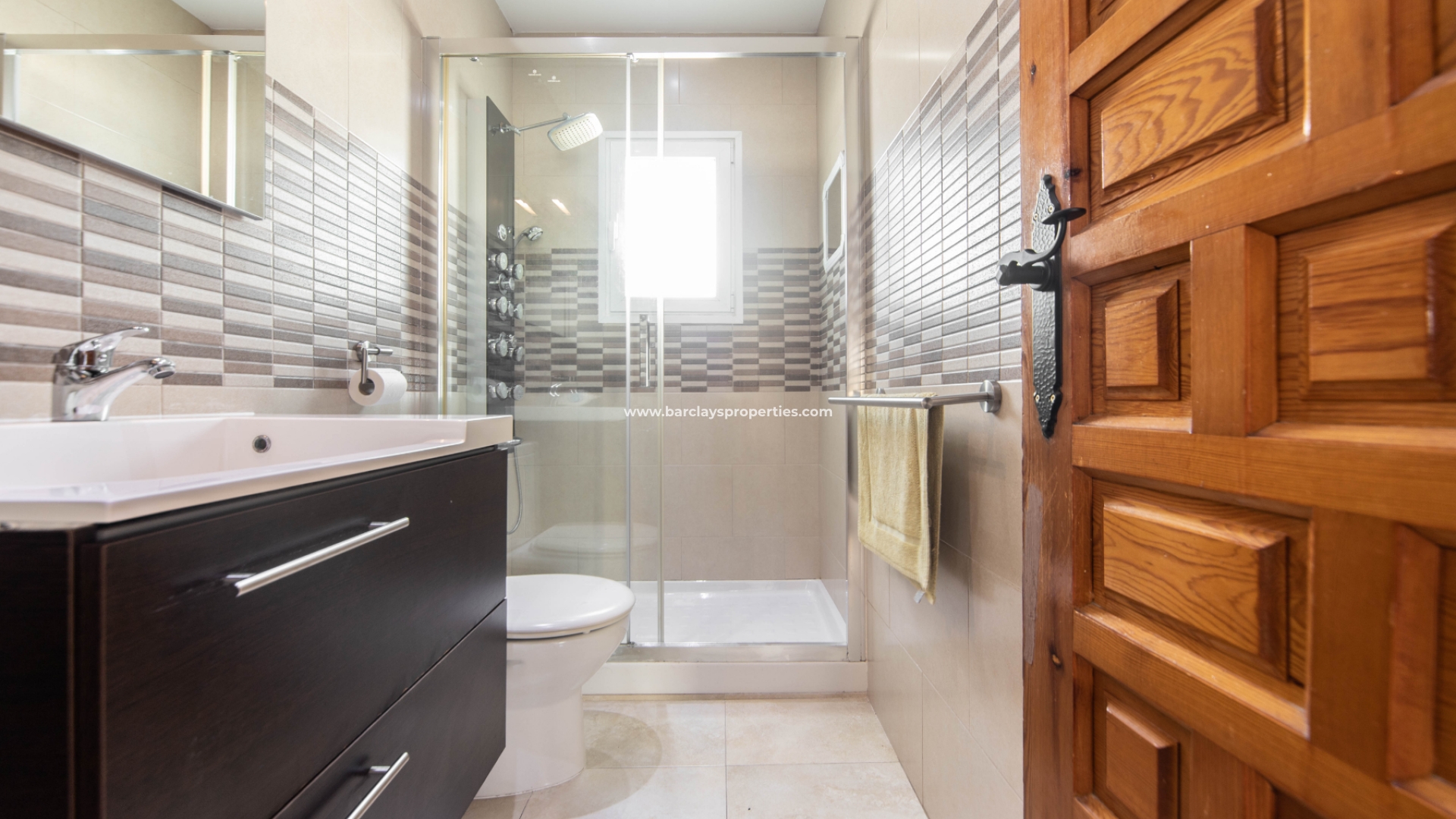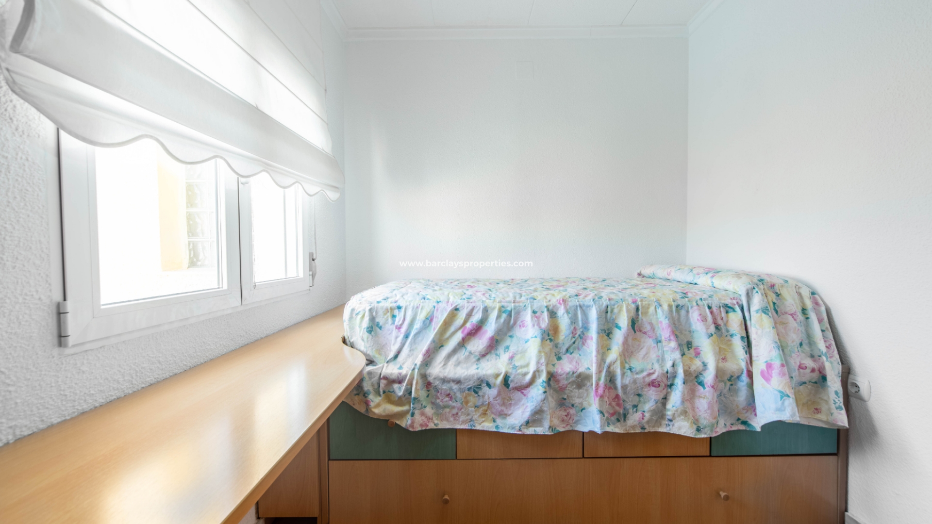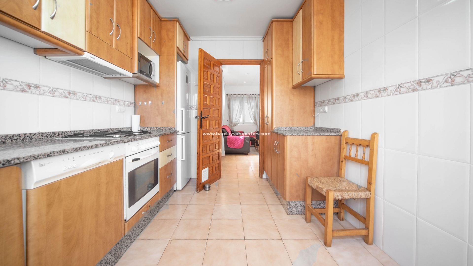 Een patiodeur leidt ons naar het voorportaal dat toegang geeft tot het interieur van het pand en de lichte woonkamer met open haard, gasverwarming, airconditioning en plafondspots, een onafhankelijke ingerichte keuken met nieuwe eenheden en marmeren werkbladen met veel bergruimte. De hal leidt naar de rest van de kamers: een onlangs gerenoveerde badkamer met muur tot muur douche en drie ruime slaapkamers (een heeft airconditioning).
