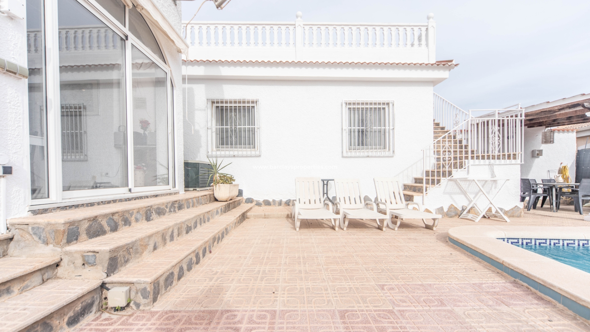 Aan het einde van de hal is er een deur die toegang geeft tot een grote achtertuin waar we een privé zwembad kunnen vinden, een verhoogd zonneterras met zonneschermen, een zitgedeelte dat perfect zou zijn om buiten te eten op een warme zomeravond en een buiten kookgedeelte compleet met gootsteen en BBQ. Vanaf hier leidt een trap naar een extra groot zonneterras met prachtig uitzicht op de bergen en het platteland, waar men optimaal kan profiteren van het mooie weer om te zonnebaden.