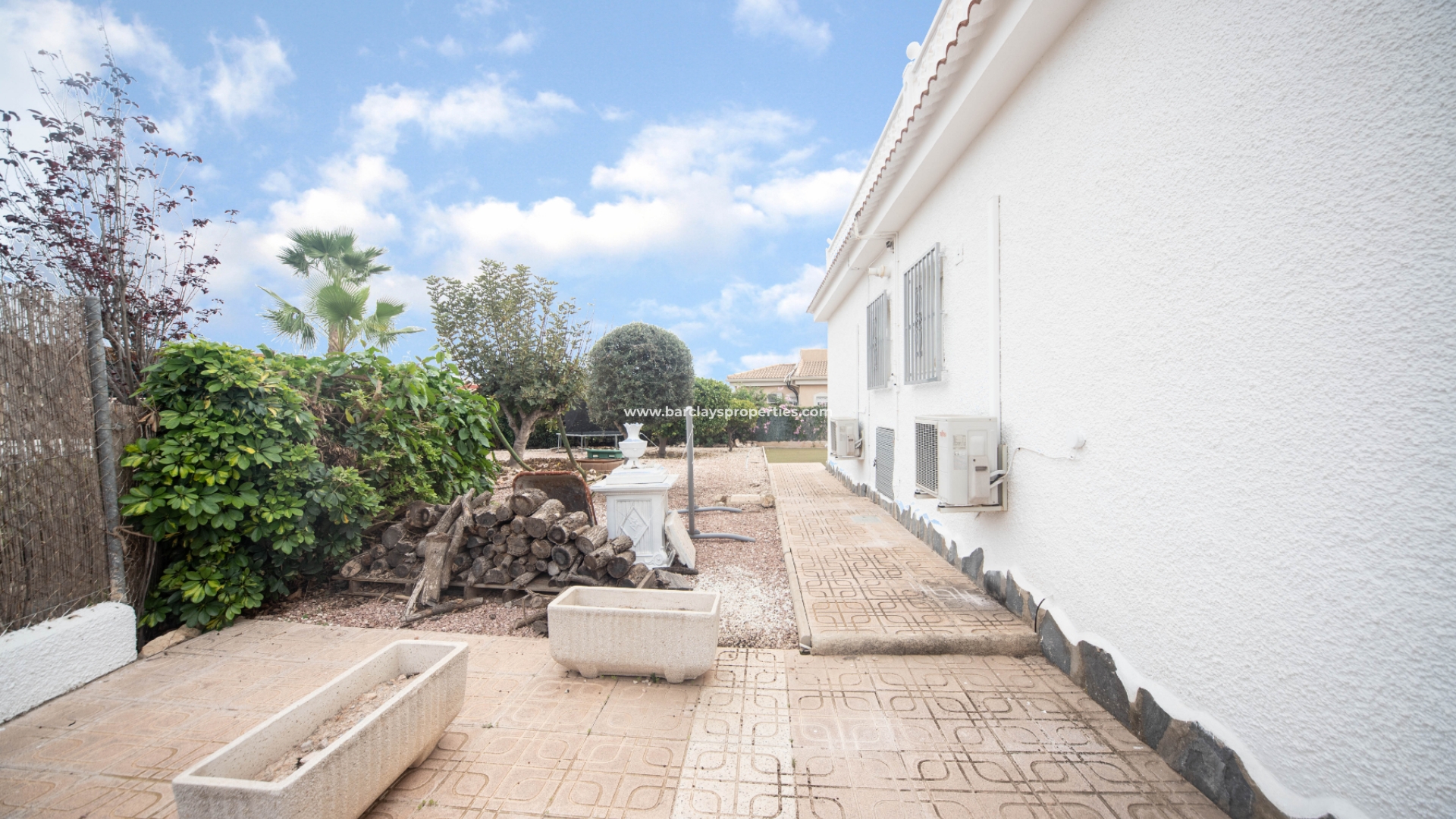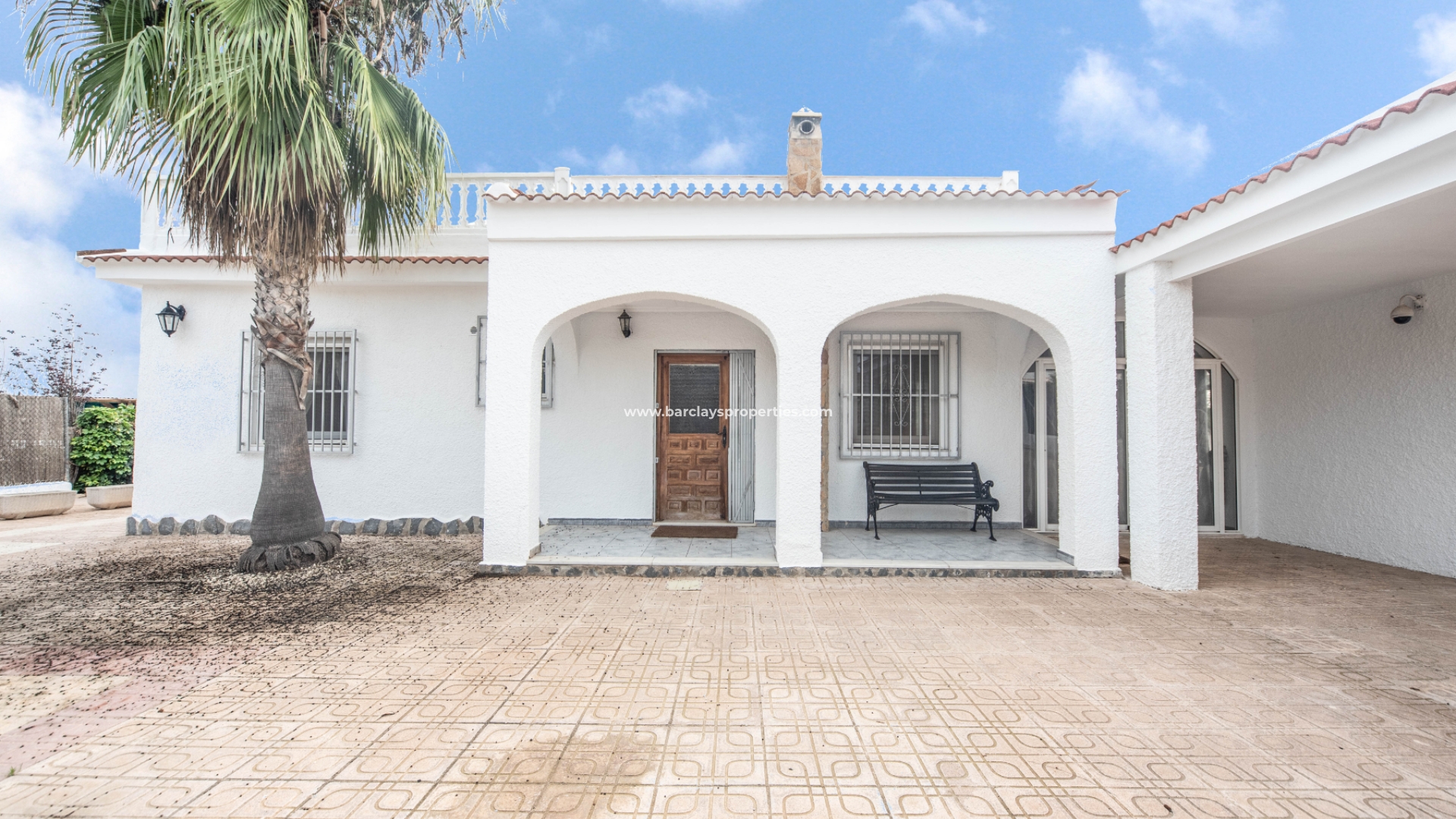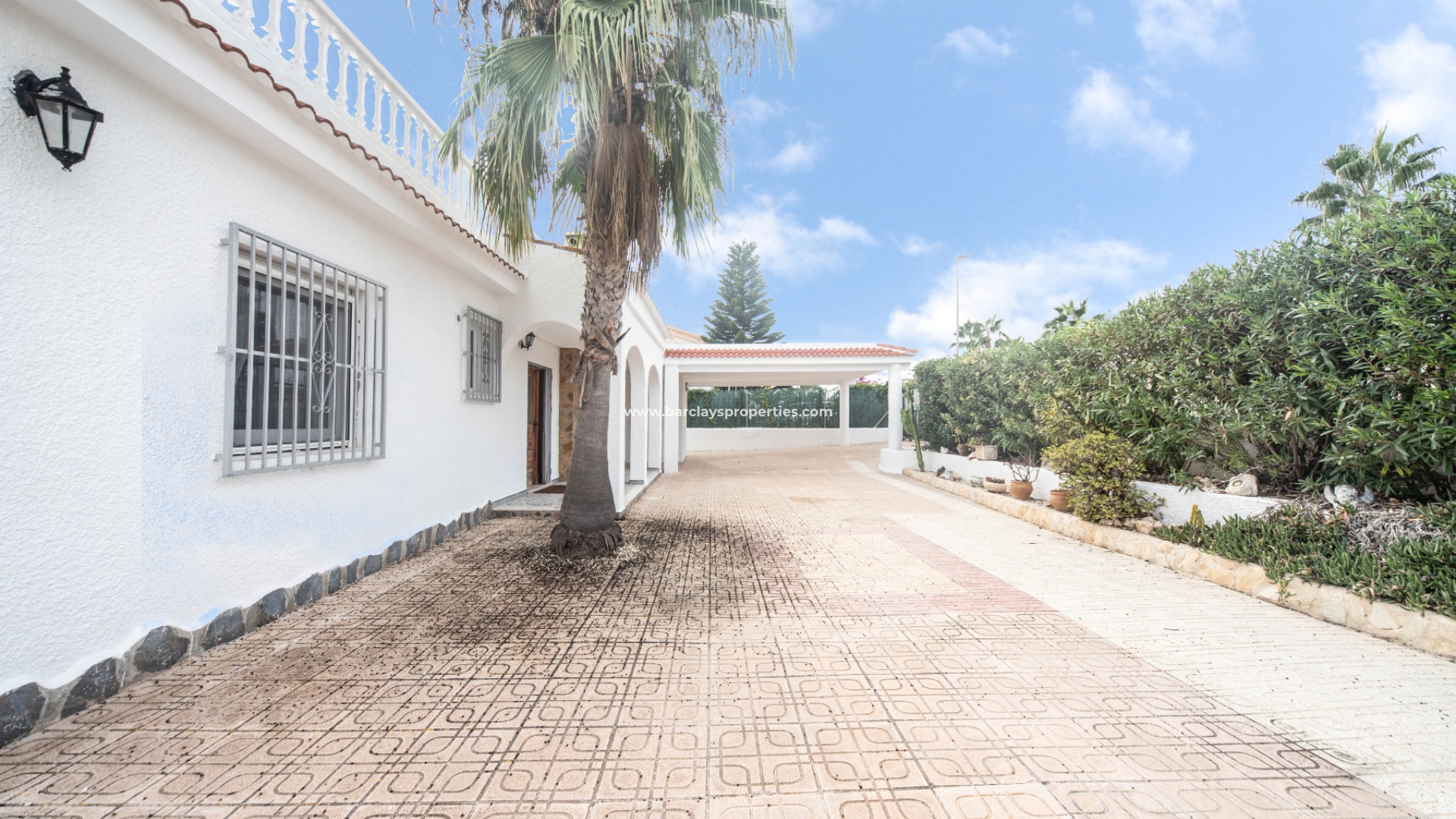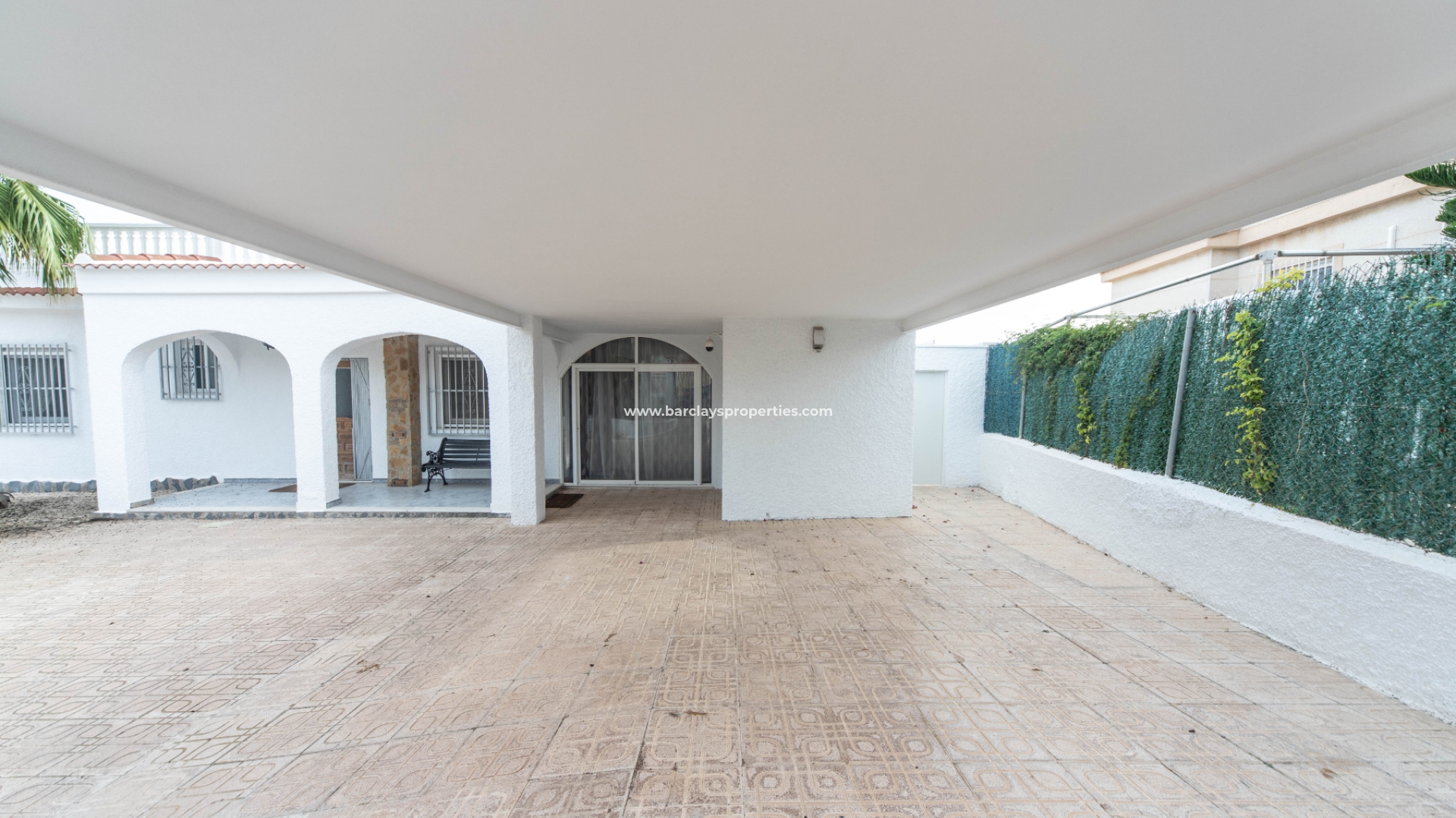 We hebben toegang tot deze prachtige woning via de voetgangerspoort of de grote elektrische poort die leidt naar een volledig betegelde voortuin waar we een mooie gevestigde palmboom vinden, samen met een grote ingebouwde carport die off-road parkeerplaats biedt.