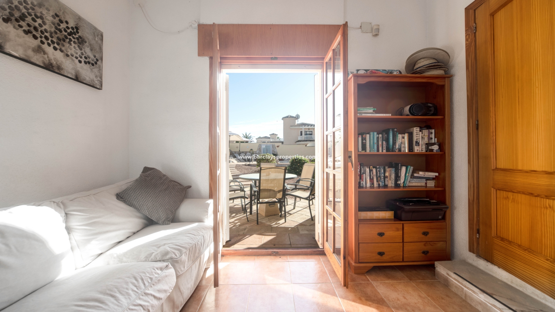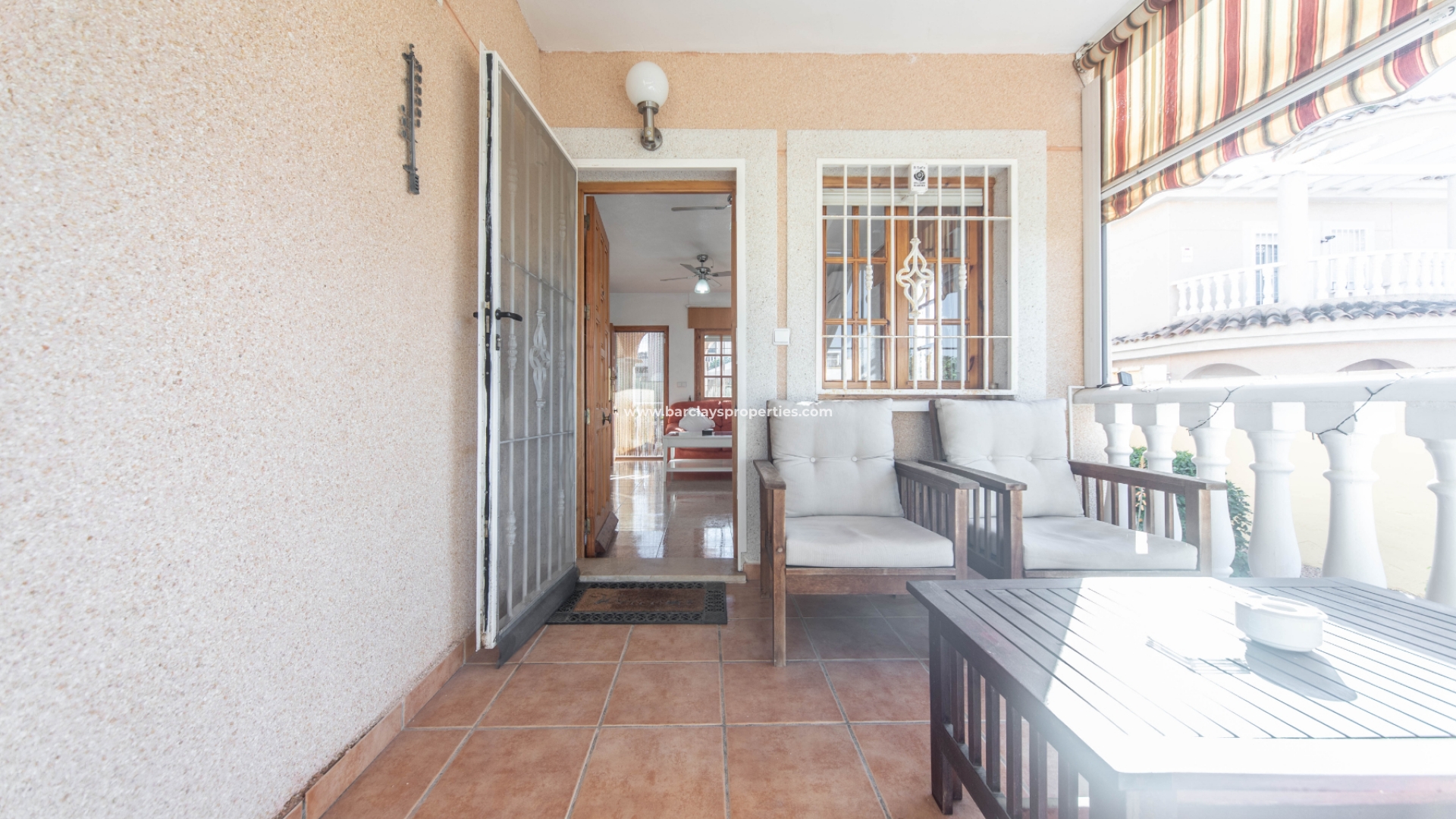De overdekte voorporch met verlengd zonnescherm en zijluifel om meer schaduw te creëren biedt een buitenzitje dat leidt naar het interieur van de villa waar we de lichte woonkamer/eetkamer vinden met airconditioning, plafondventilatoren en toegangsdeur naar het achterste gebogen zonneterras en de achtertuin.