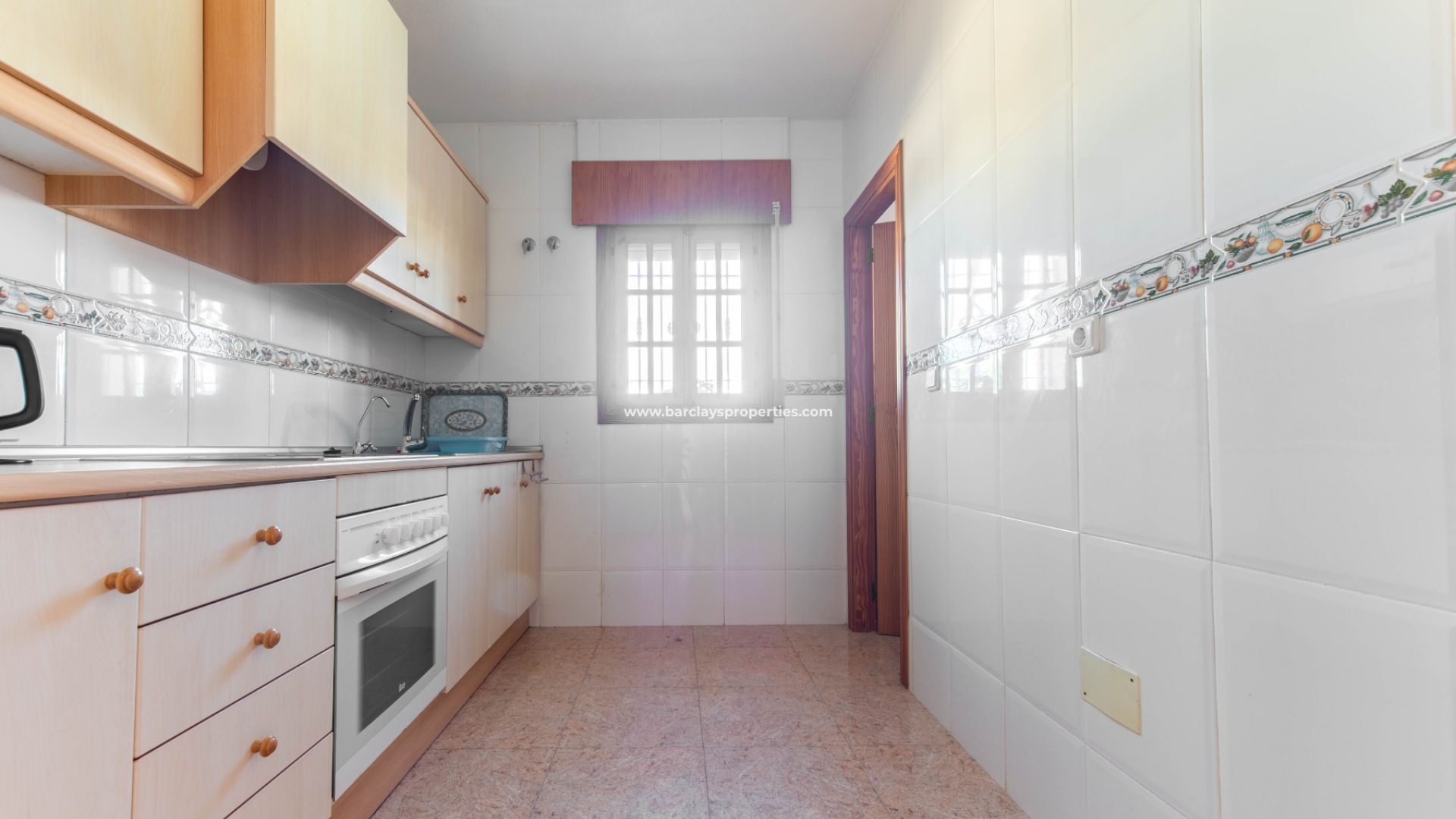 Vanuit de hal vinden we de ingerichte onafhankelijke keuken met plafondventilator en toegang tot een aparte bijkeuken. Naast de keuken vinden we een opslagruimte / bijkeuken, een badkamer met muur tot muur douche en aan het einde van de gang leiden stappen naar een tweepersoons slaapkamer met inbouwkasten, airconditioning, plafondventilatoren en openslaande deuren naar een achterterras met eethoek.