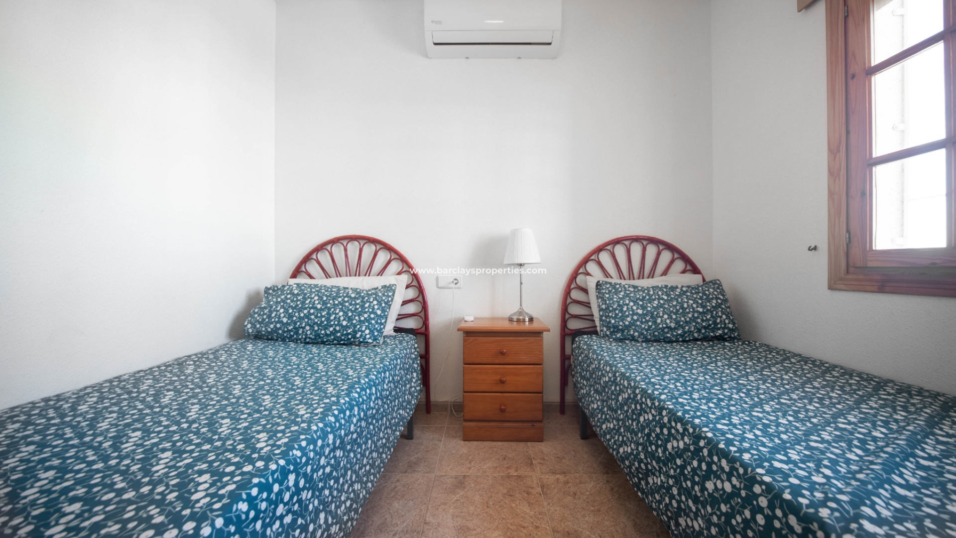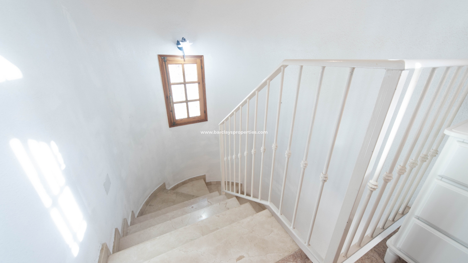 De gebogen marmeren trap leidt naar de eerste verdieping van deze "Azucena" waar we drie tweepersoons slaapkamers vinden die allemaal zijn voorzien van plafondventilatoren en airconditioning en twee van de slaapkamers hebben inbouwkasten en toegang tot een eigen zonneterras. Een ruime badkamer met bad met douche, WC, wastafel en bidet bevindt zich ook op deze verdieping.