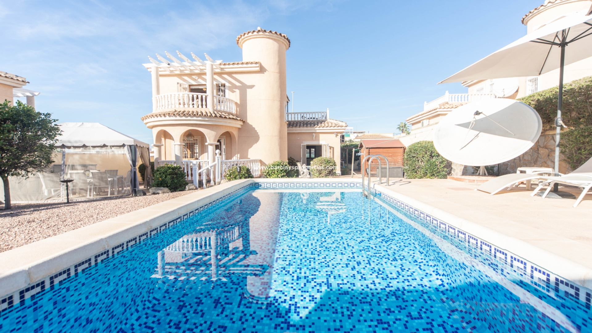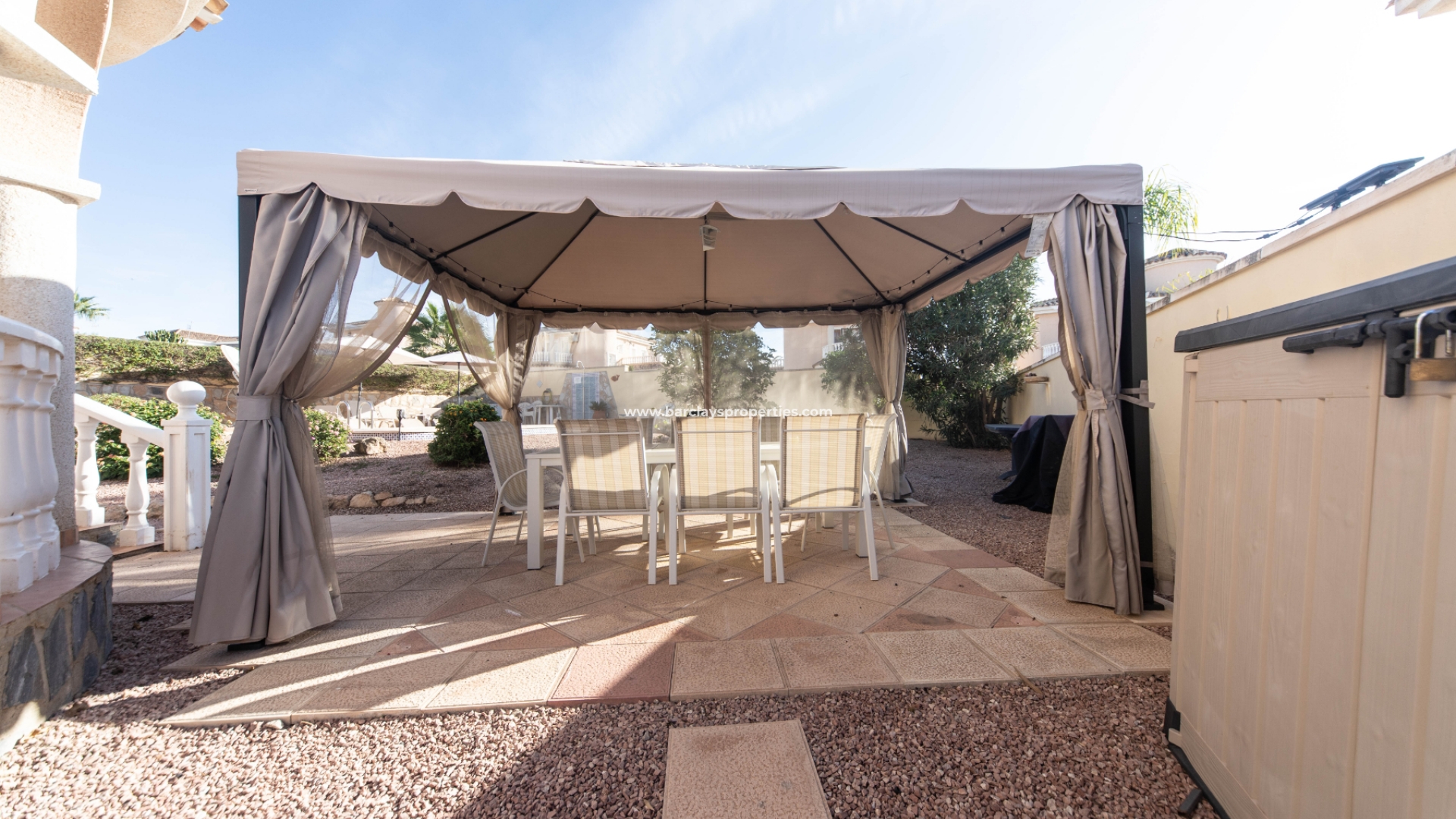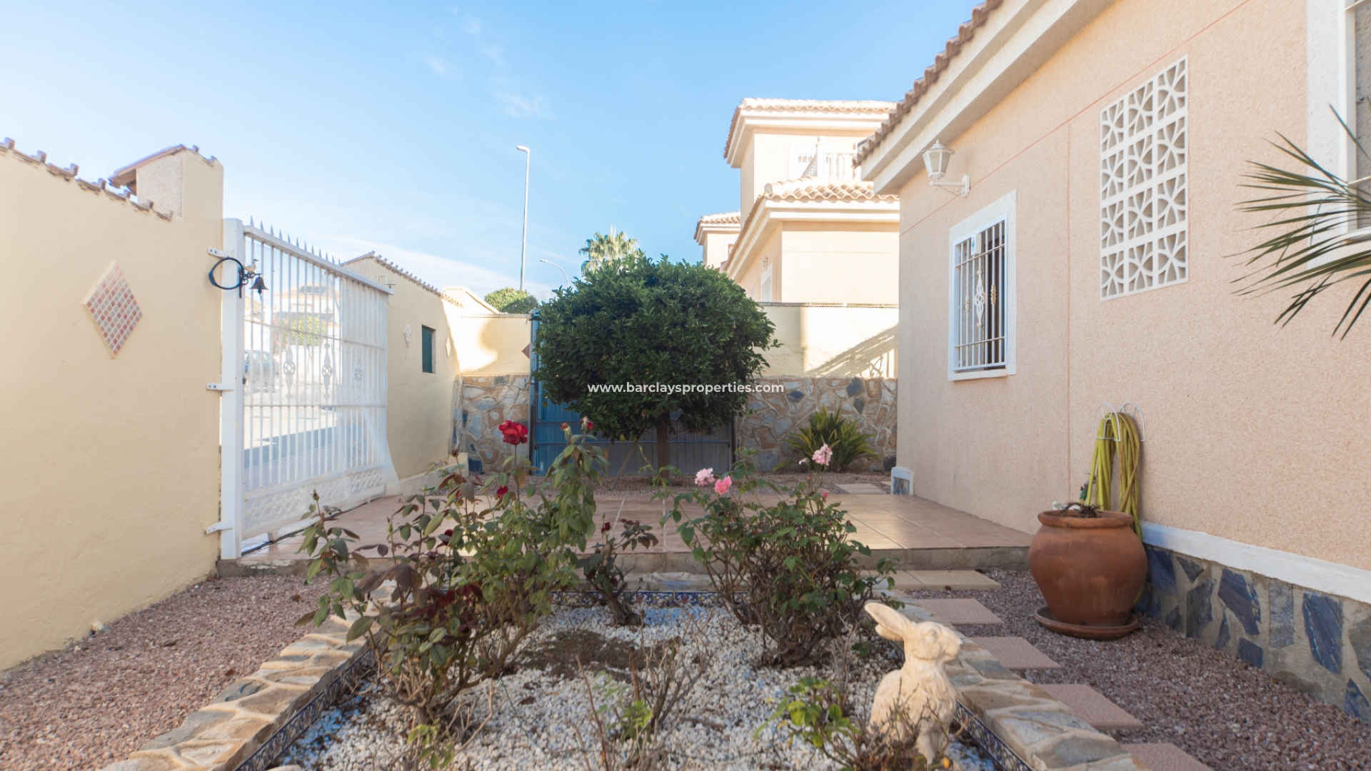 De tuin is van een goede grootte en biedt parkeergelegenheid, gevestigde planten en struiken en een mooie rozentuin aan de voorzijde van het pand en aan de zijkant is de tuin voorzien van "stepping stone stijl" kronkelende paden die leiden naar het op het zuidwesten gelegen zwembad met buitendouche, berging, ligweide, zithoeken en gazebo overdekte zithoek waar men kan genieten van het warme klimaat dat de Costa Blanca het hele jaar door biedt.