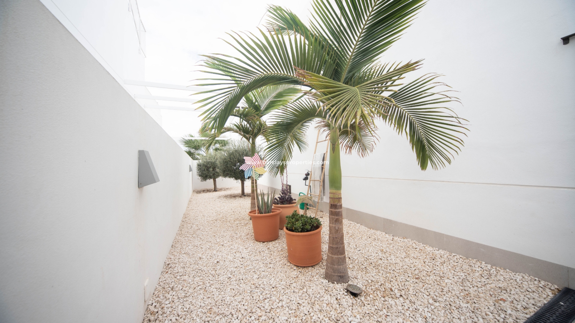 De voortuin die is geplaveid en met grind bedekt, biedt een verscheidenheid aan fruitbomen, palmbomen en een irrigatiesysteem, evenals verschillende zitjes, waaronder een "chill out zone", buiten eethoek met zonnescherm en schaduwrijke buiten lounge met aantrekkelijke bamboe-effect bank.