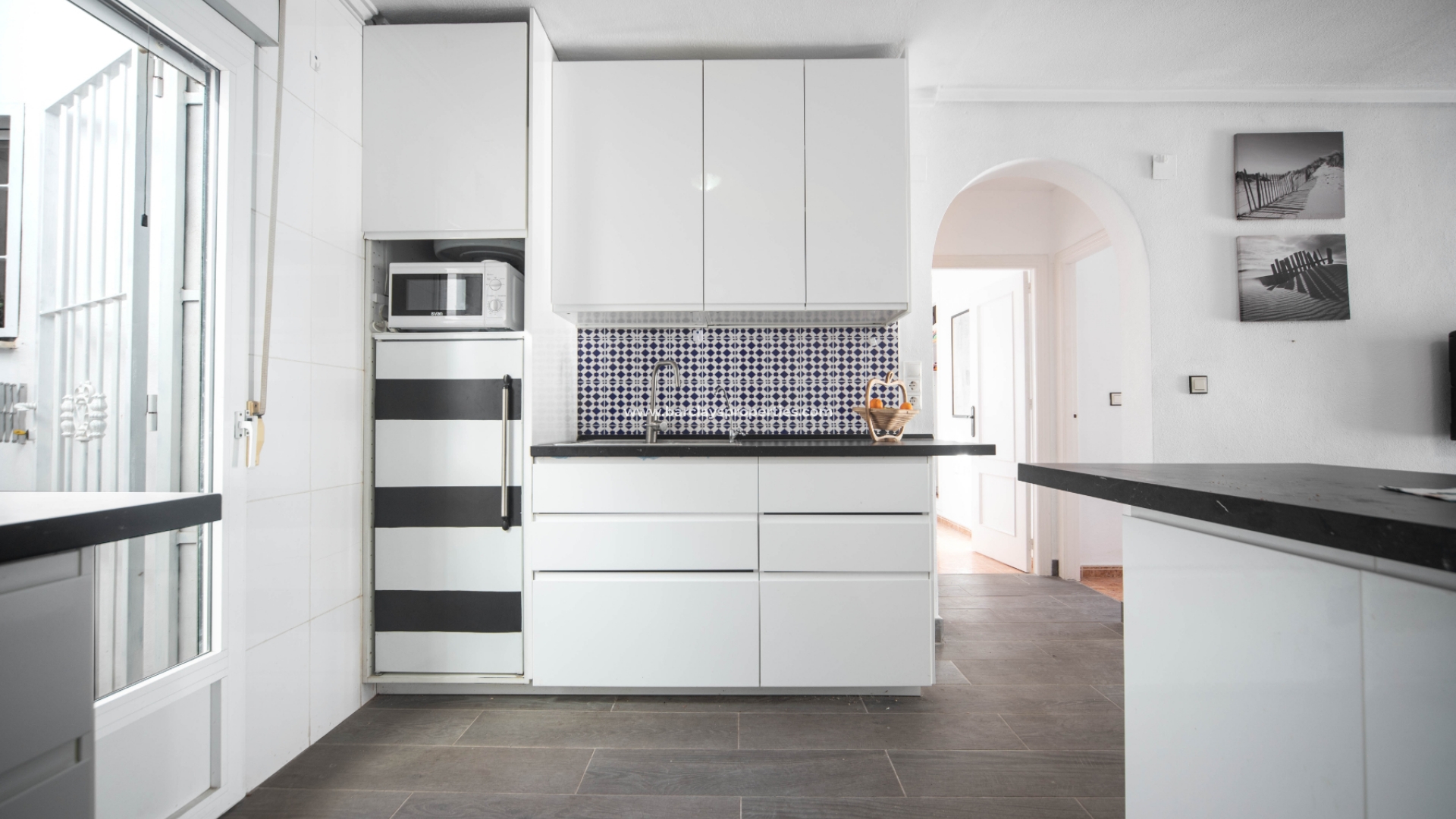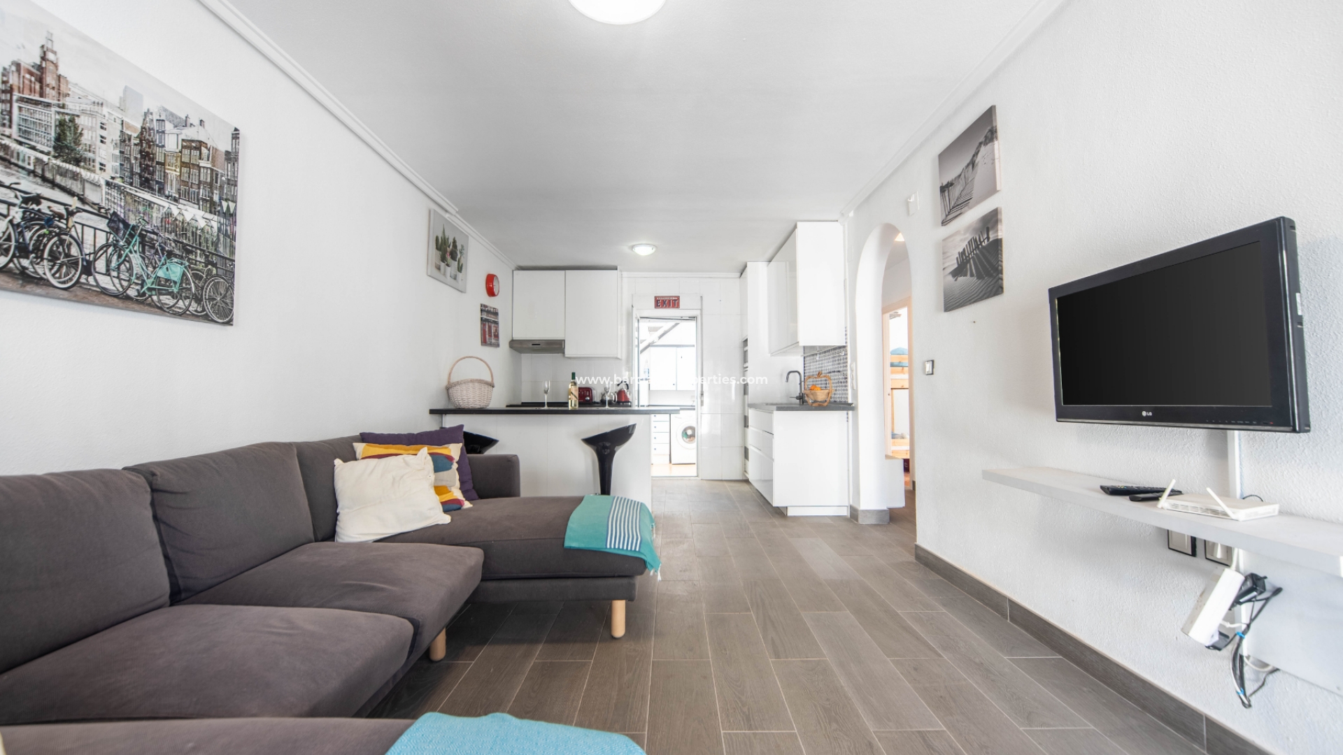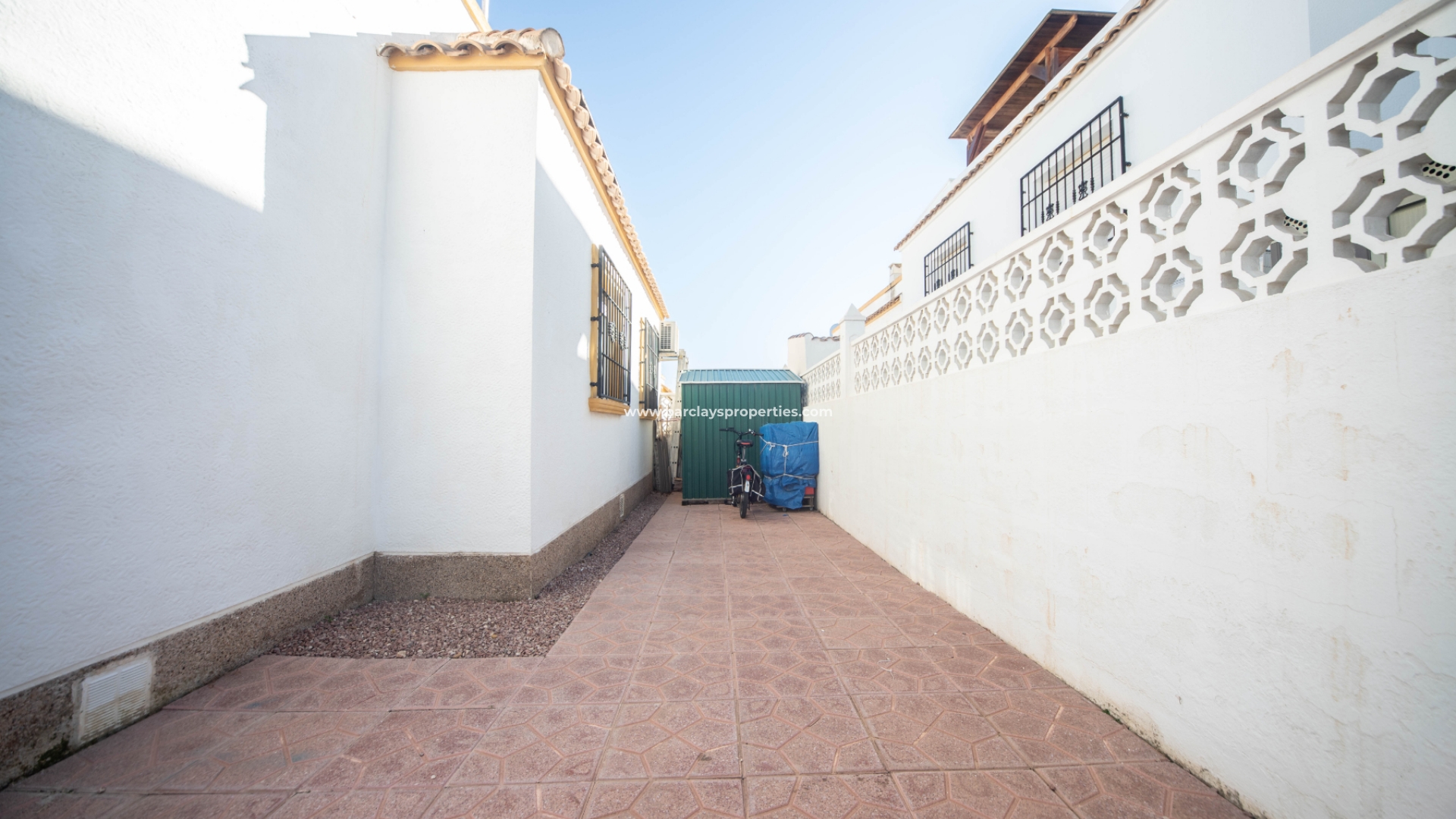 De dubbele oprit leidt naar parkeergelegenheid, een buitenzitje en een tuinhuisje voor opslag. Een aparte voetgangerspoort en een pad leiden naar het terras aan de voorzijde en de overdekte veranda met zitjes die toegang geven tot het interieur van deze quad villa waar we worden verwelkomd door de lichte en ruime woonkamer en de gerenoveerde, moderne open keuken met ontbijtbar.
