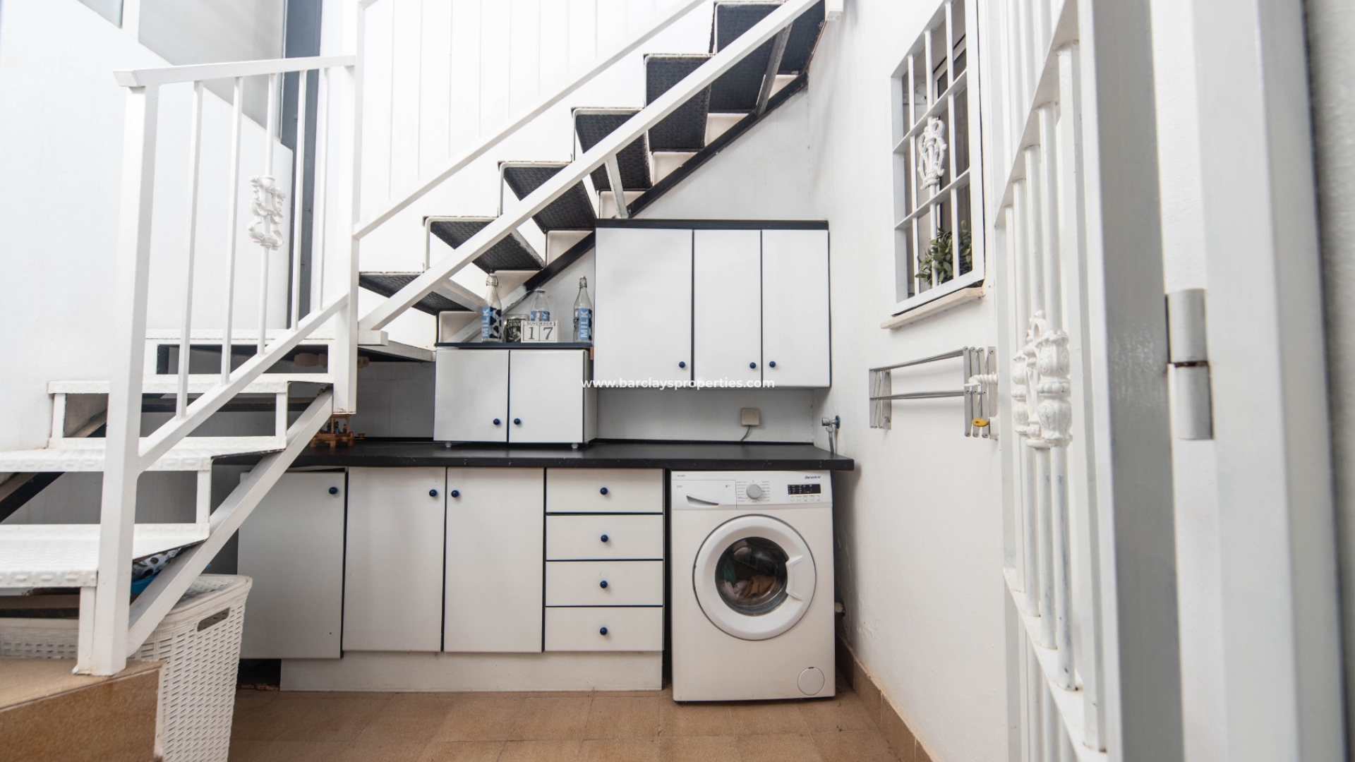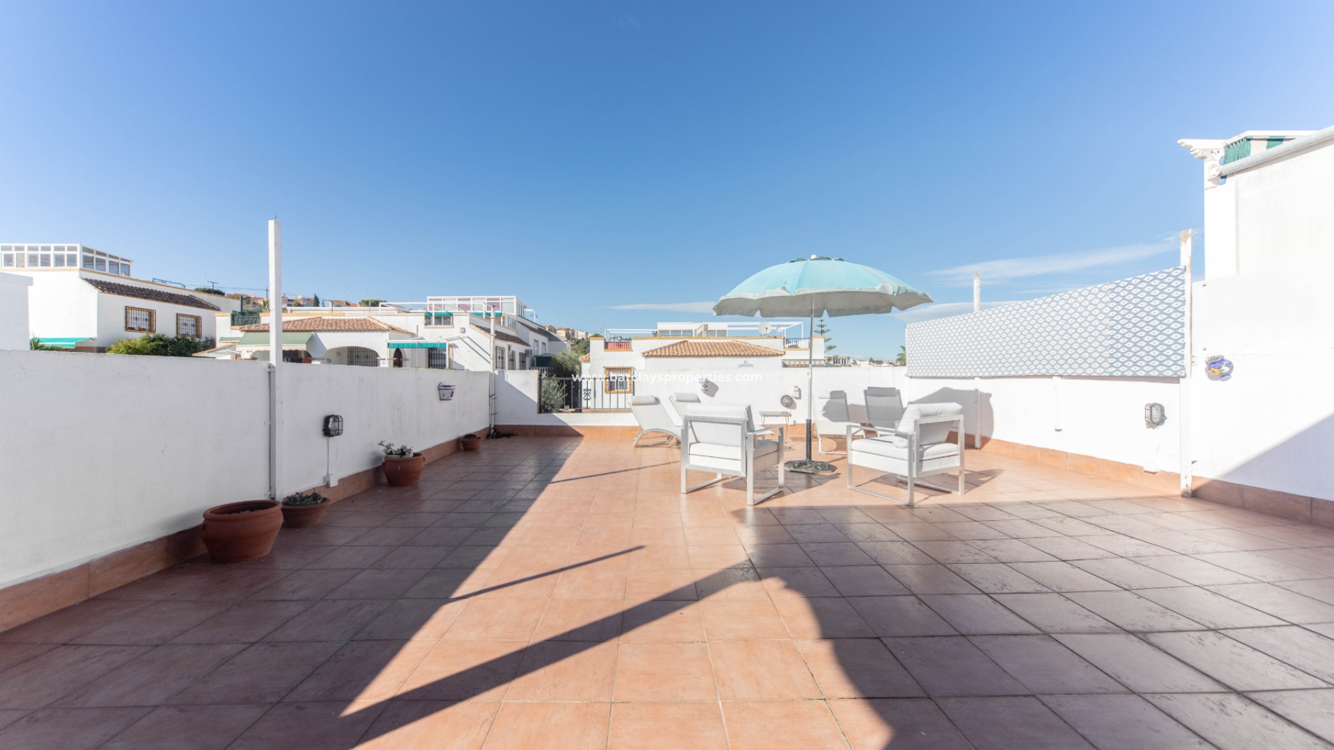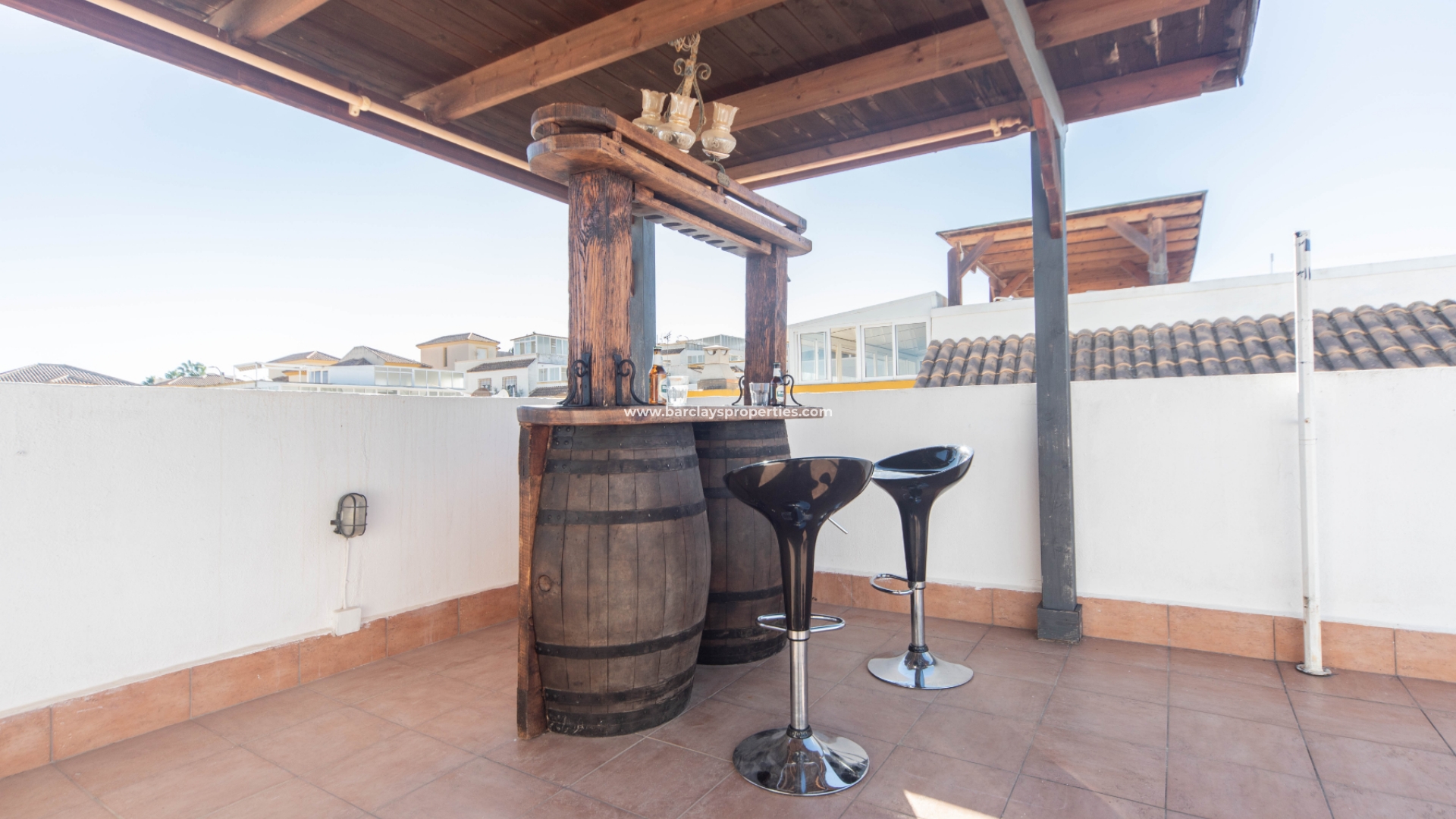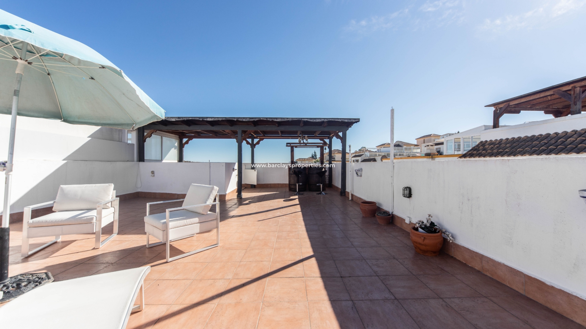 Een boog leidt naar de hal waar we drie tweepersoons slaapkamers aantreffen (waarvan twee met inbouwkasten en plafondventilatoren en één met airconditioning). Aan het eind van de gang ligt een ruime badkamer met een douche van muur tot muur. Terug naar de keuken vinden we een deur die leidt naar de bijkeuken / patio met een trap naar het dak solarium met fantastische overdekte bar compleet met barkrukken en heeft zelfs een bel aan de zijkant voor degenen die tips willen achterlaten voor de barman!!! Dit gebied is perfect voor entertainment op die warme zomerdagen en -avonden. Het solarium biedt ook zit- en ligstoelen en uitzicht op de naburige stad Guardamar Del Segura.