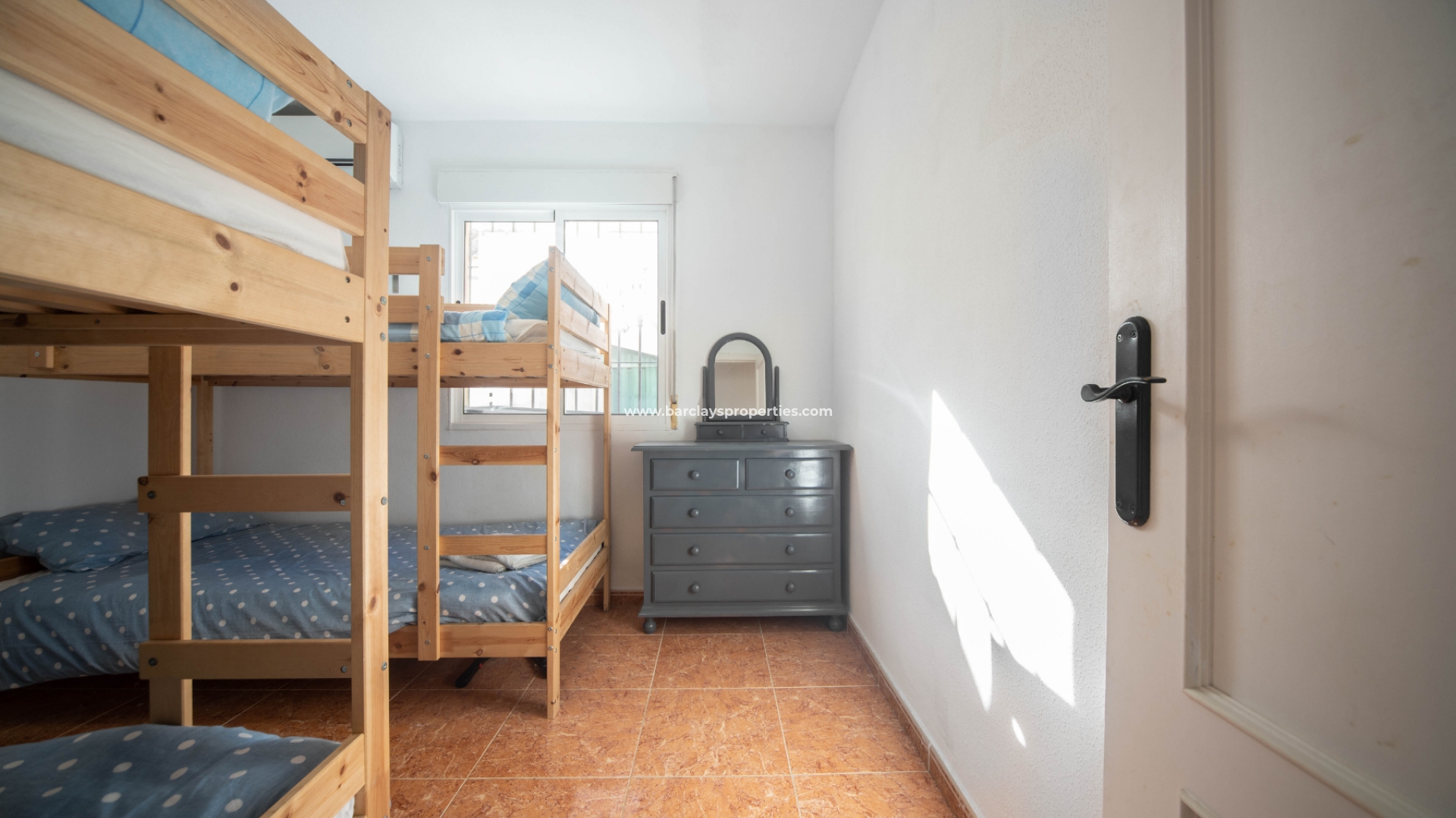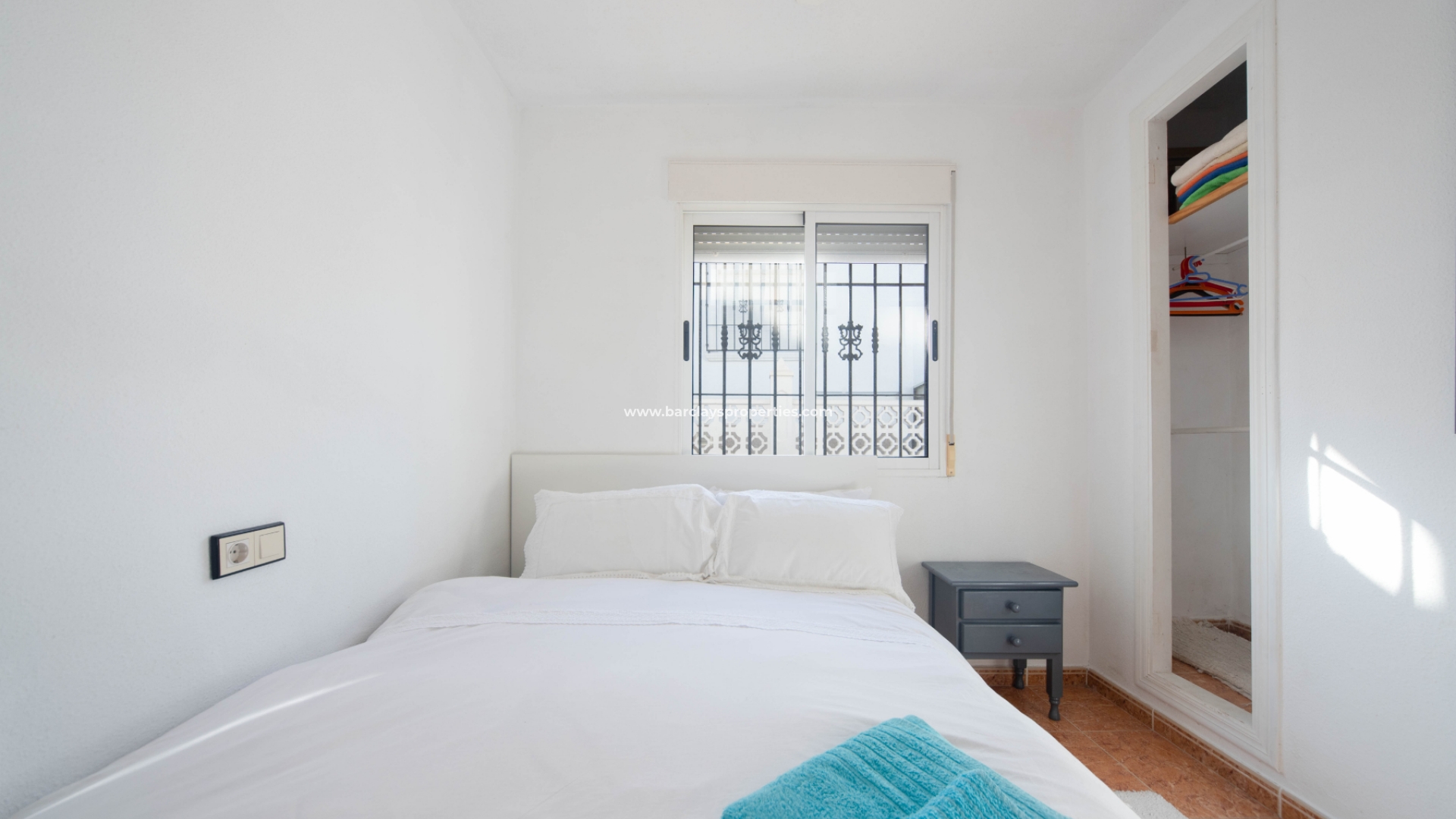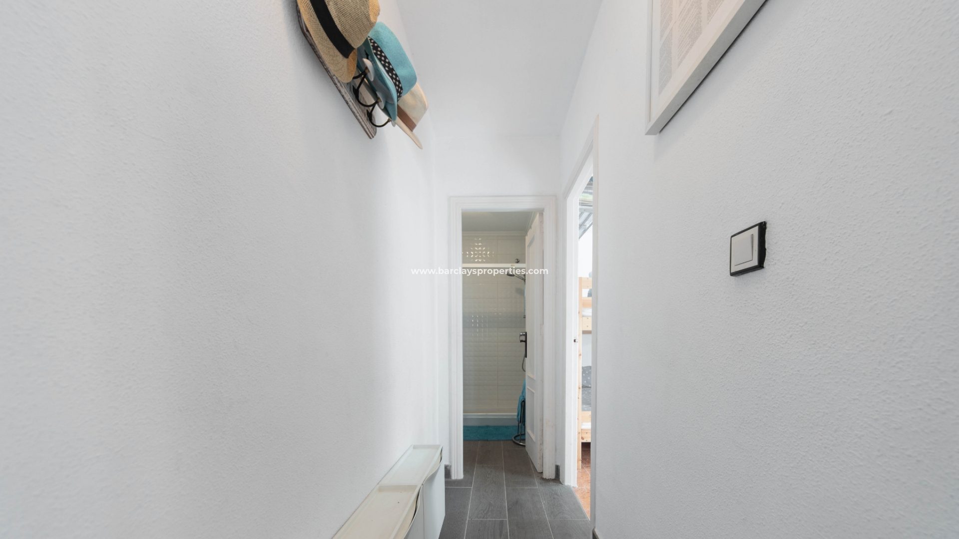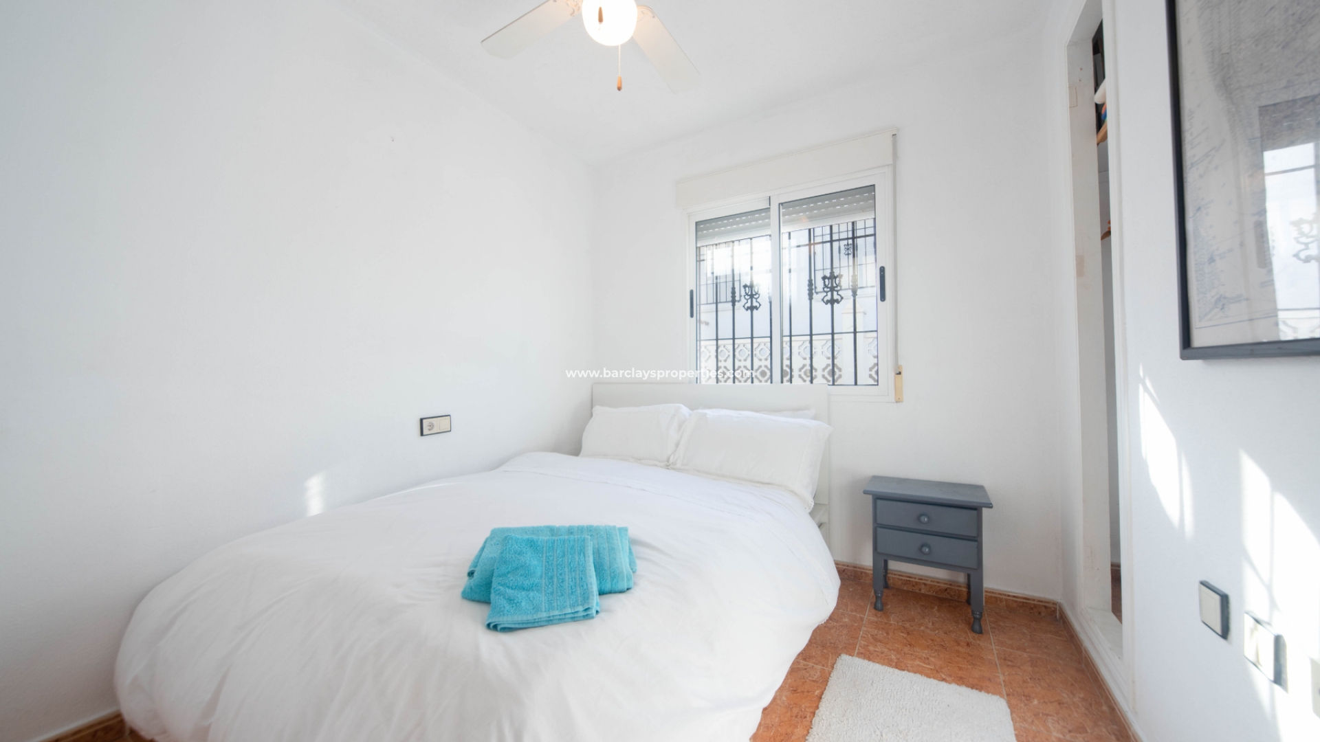 Een boog leidt naar de hal waar we drie tweepersoons slaapkamers aantreffen (waarvan twee met inbouwkasten en plafondventilatoren en één met airconditioning). Aan het eind van de gang ligt een ruime badkamer met een douche van muur tot muur. Terug naar de keuken vinden we een deur die leidt naar de bijkeuken / patio met een trap naar het dak solarium met fantastische overdekte bar compleet met barkrukken en heeft zelfs een bel aan de zijkant voor degenen die tips willen achterlaten voor de barman!!! Dit gebied is perfect voor entertainment op die warme zomerdagen en -avonden. Het solarium biedt ook zit- en ligstoelen en uitzicht op de naburige stad Guardamar Del Segura.