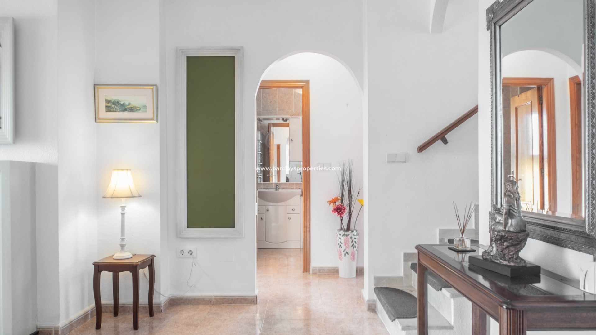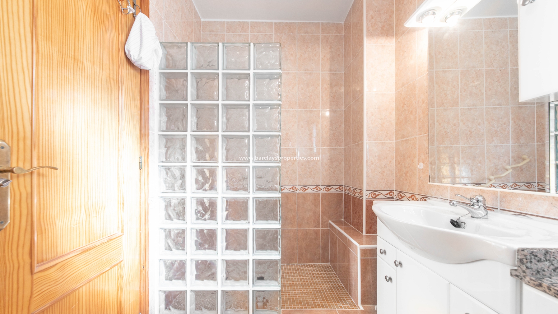 Deze ruime villa verwelkomt ons via een beveiligde voordeur in een ontvangsthal met bijkeuken. Er is ook toegang tot het gebogen overdekte terras aan de voorzijde dat leidt naar de grote woonkamer met open haard en eethoek met airconditioning. Vanuit de woonkamer vinden we een lichte grote onafhankelijke volledig ingerichte keuken met granieten werkblad, kookplaat, oven, afzuigkap, vaatwasser en koelkast met vriesvak - de keuken heeft een deur met opstapje die leidt naar de achtertuin. Ook te vinden op de begane grond van deze mooie vrijstaande woning zijn een familie badkamer met walk-in douche met glazen baksteen ontwerp en twee dubbele slaapkamers met ingebouwde kasten (een van de slaapkamers heeft airconditioning en een plafondventilator.