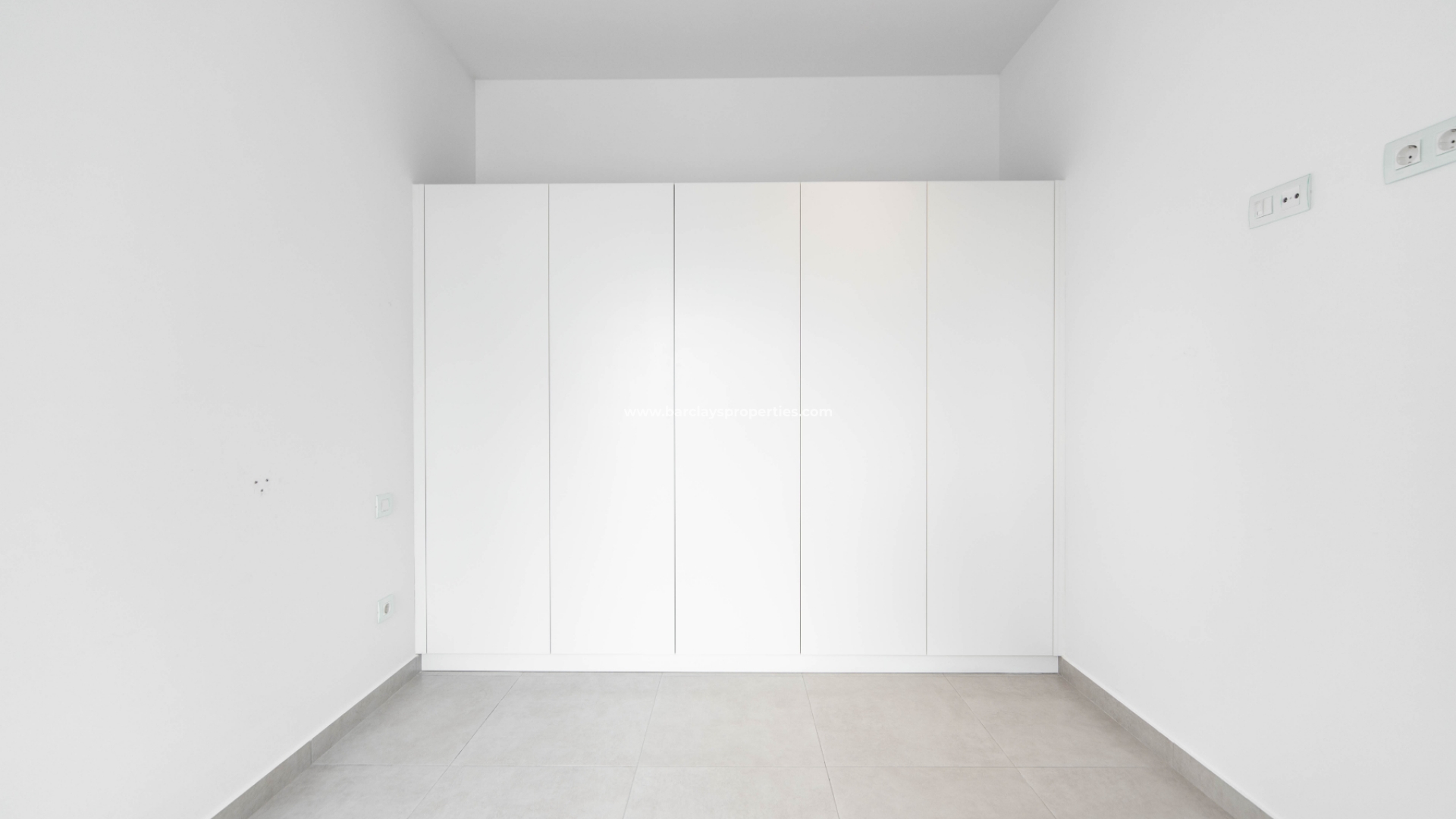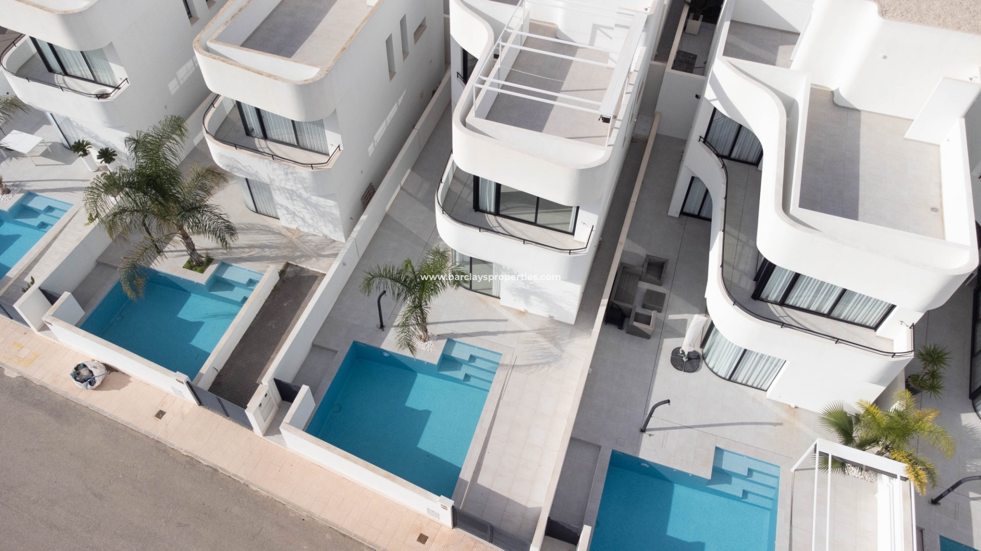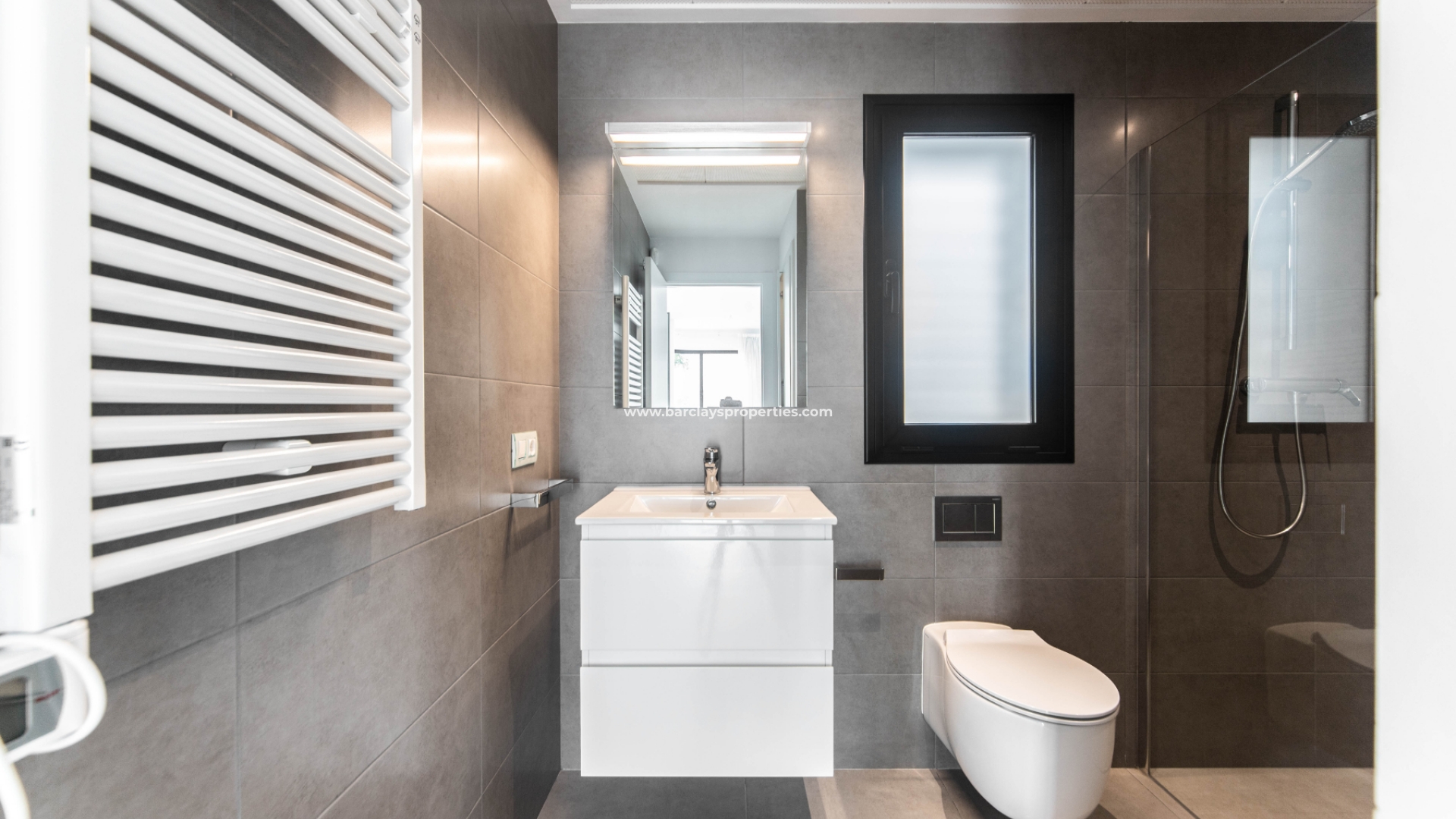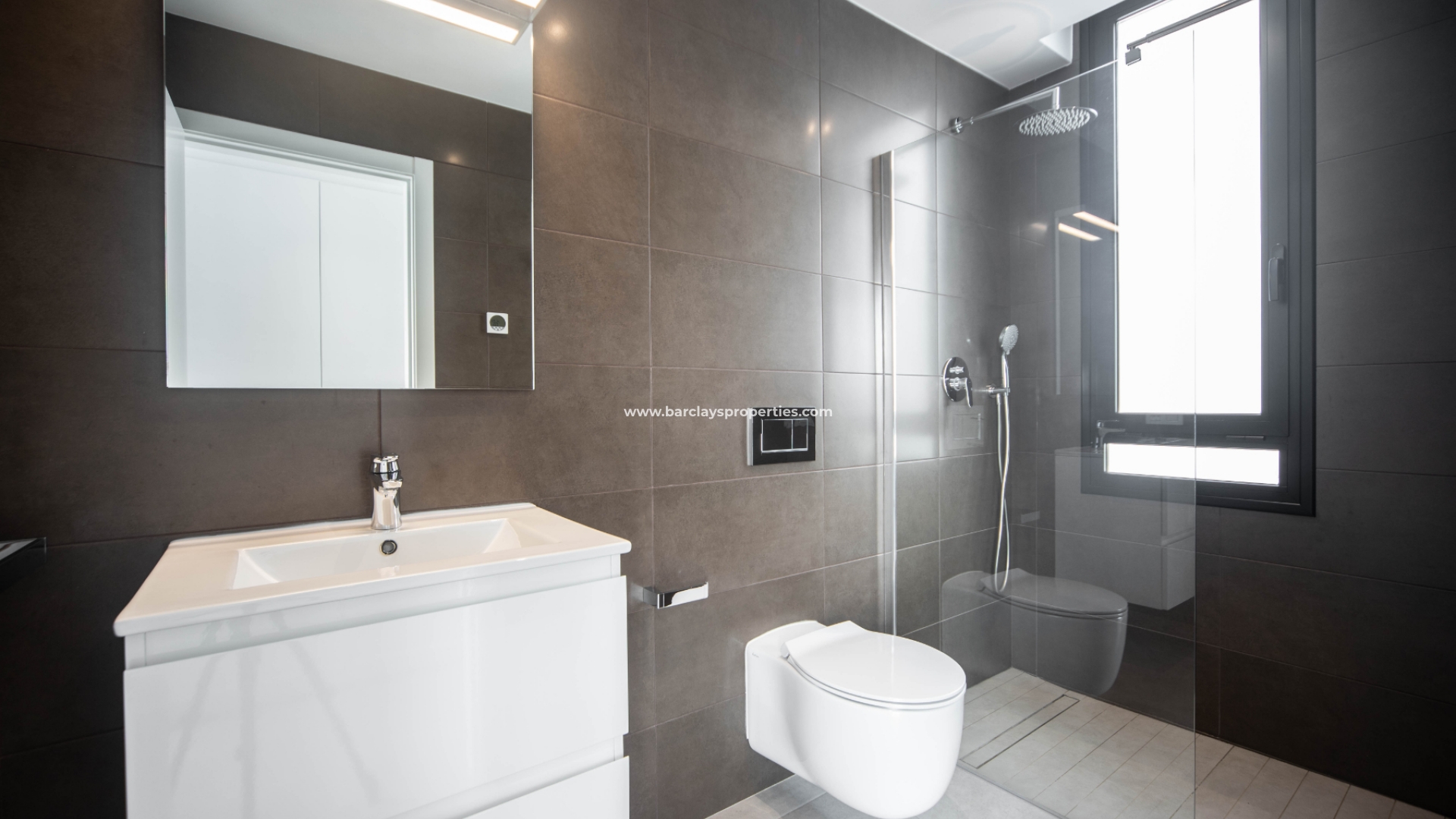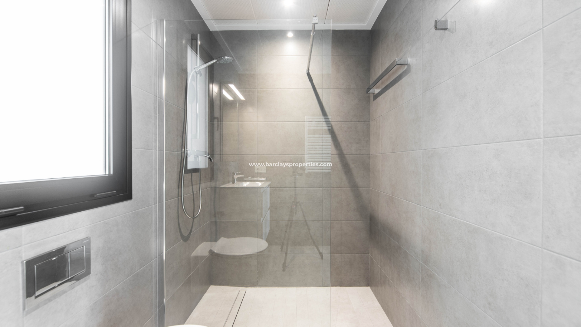 De villa biedt volledige privacy, het unieke architectonische ontwerp zorgt ervoor dat elke villa zich volledig privé voelt en niet over het hoofd wordt gezien door de omliggende eigendommen. Toegang tot de villa is via de hoge veiligheid voordeur die leidt naar de ruime woonkamer en open plan volledig ingerichte moderne keuken met een granieten werkblad, oven, kookplaat, afzuigkap en vaatwasser. Grote patio deuren leiden naar het zonneterras. Ook op de begane grond vinden we een moderne volledig betegelde badkamer met verhoogd toilet, badmeubel met spiegel en LED-verlichting, een verwarmd handdoekenrek en een moderne muur tot muur douche en een dubbele slaapkamer met inbouwkasten, een elektrisch zonnescherm en openslaande deuren naar het zwembad.