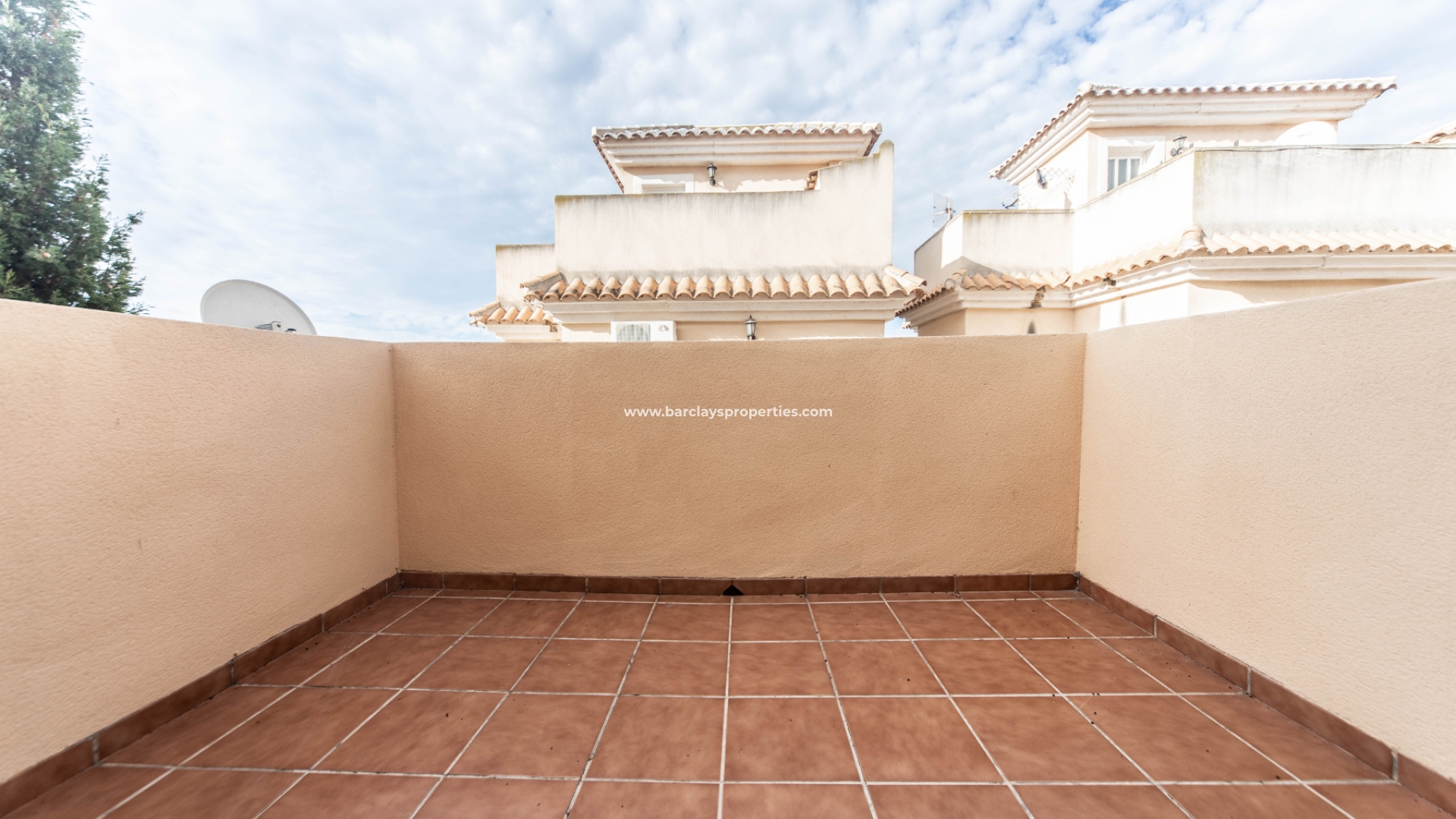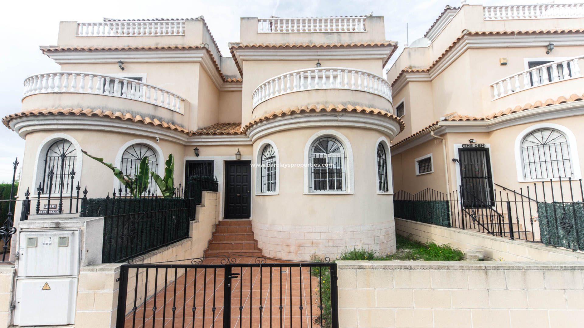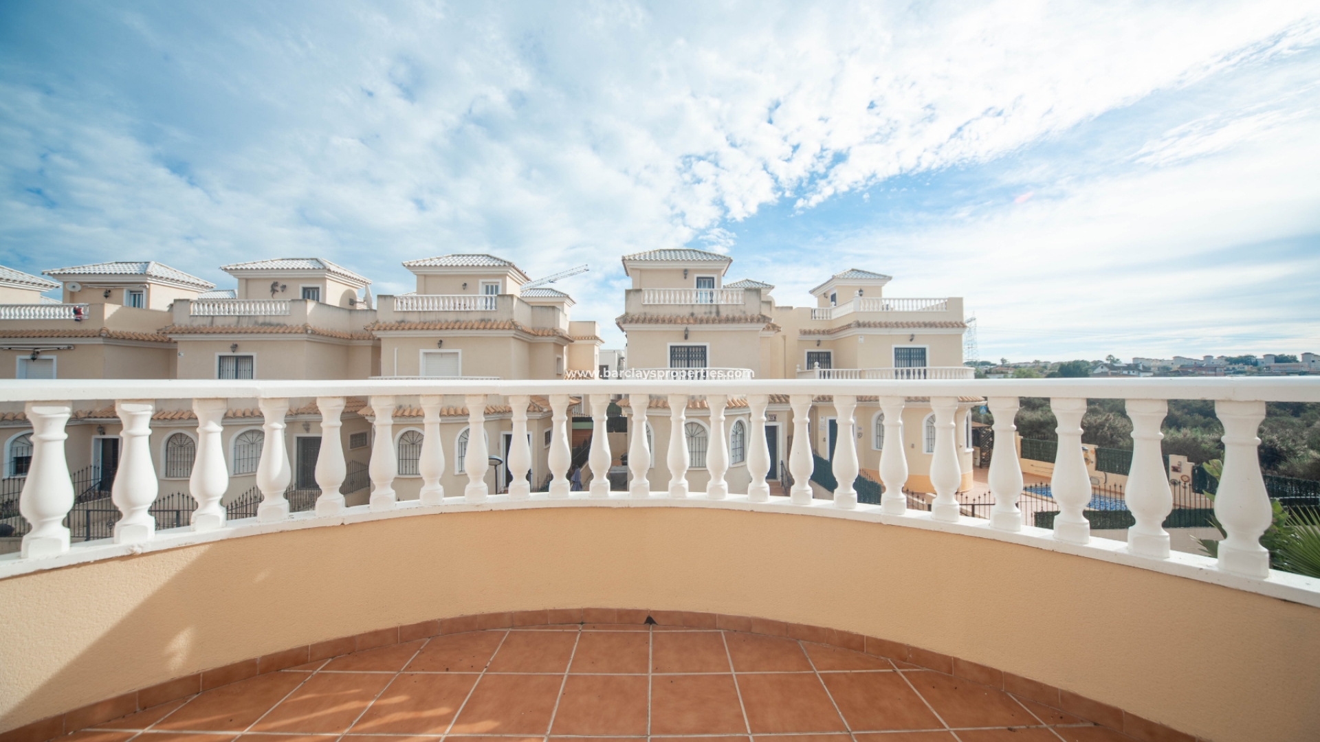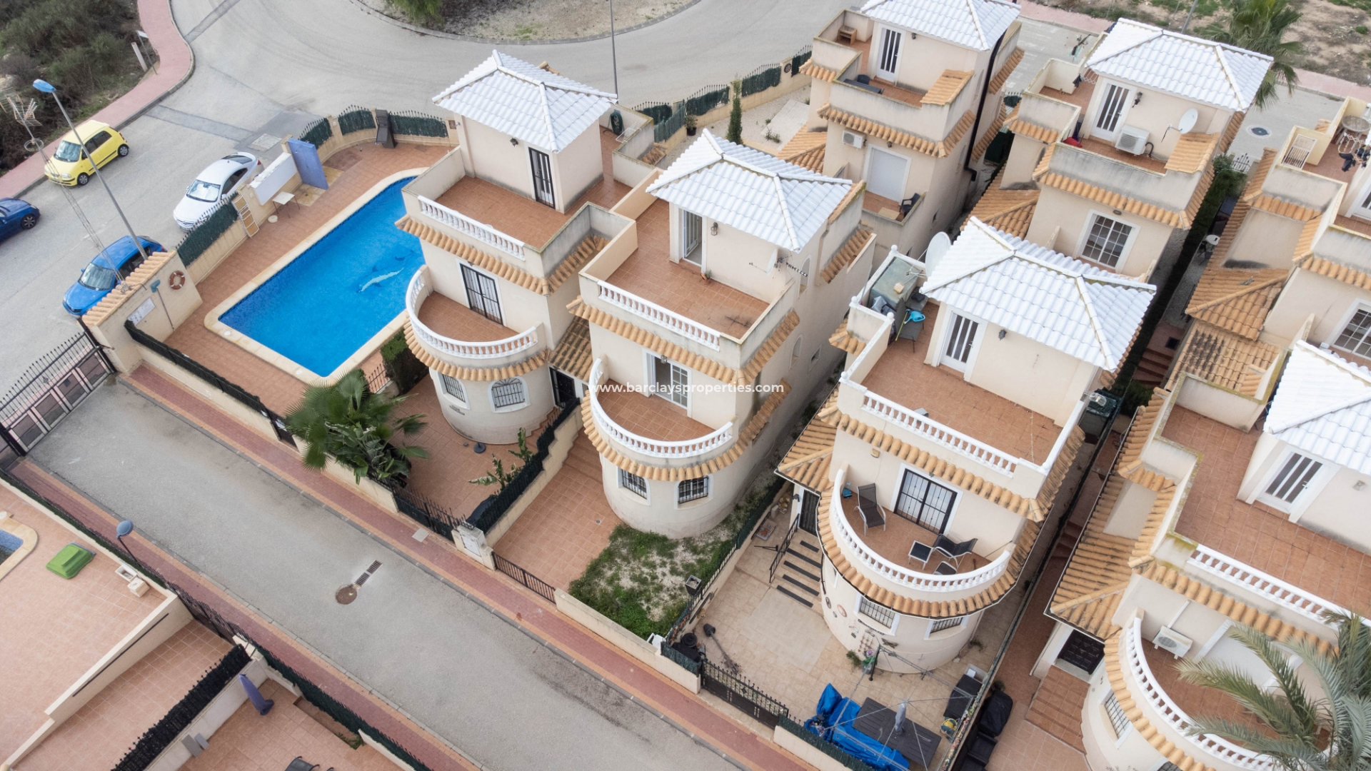 Deze aantrekkelijke vrijstaande woning, een model "Villas del Palmeral" ligt in een privé-gemeenschap op slechts één deur afstand van het goed onderhouden gemeenschappelijke zwembad. De toplocatie biedt een prachtig uitzicht op de bergen vanaf de vele zonnige terrassen. Alle voorzieningen zijn te vinden op slechts 10 minuten lopen van het pand in de urbanisatie La Marina waar men verwend wordt met keuze als het gaat om supermarkten, bars en restaurants.
