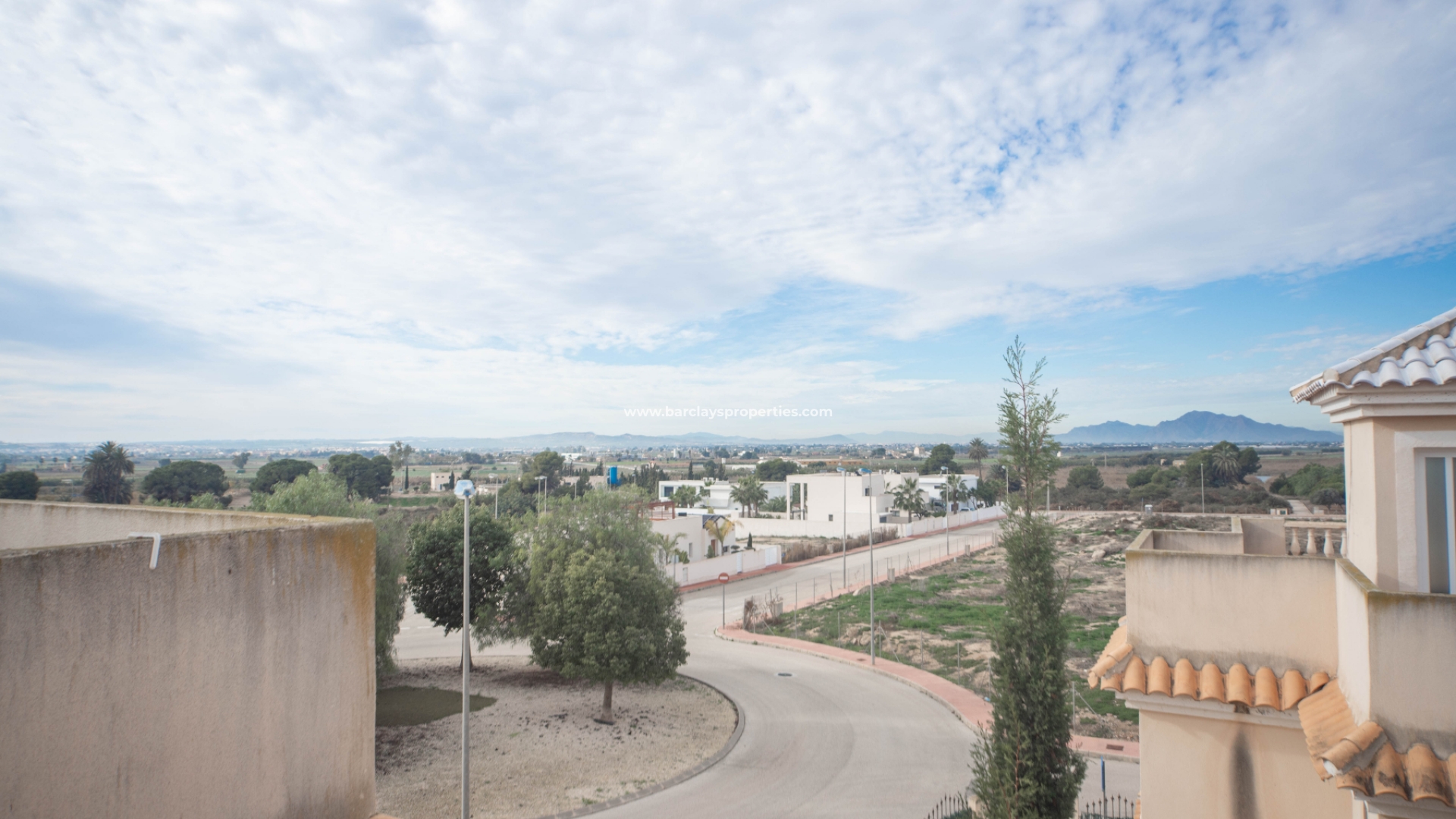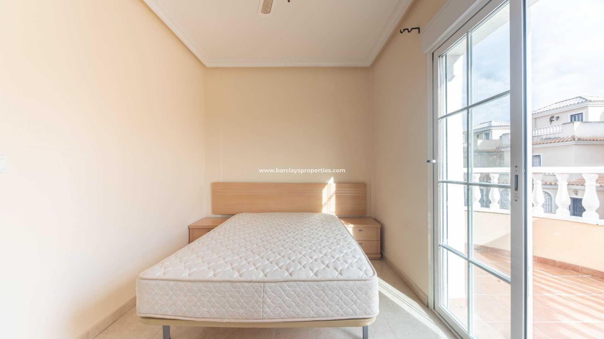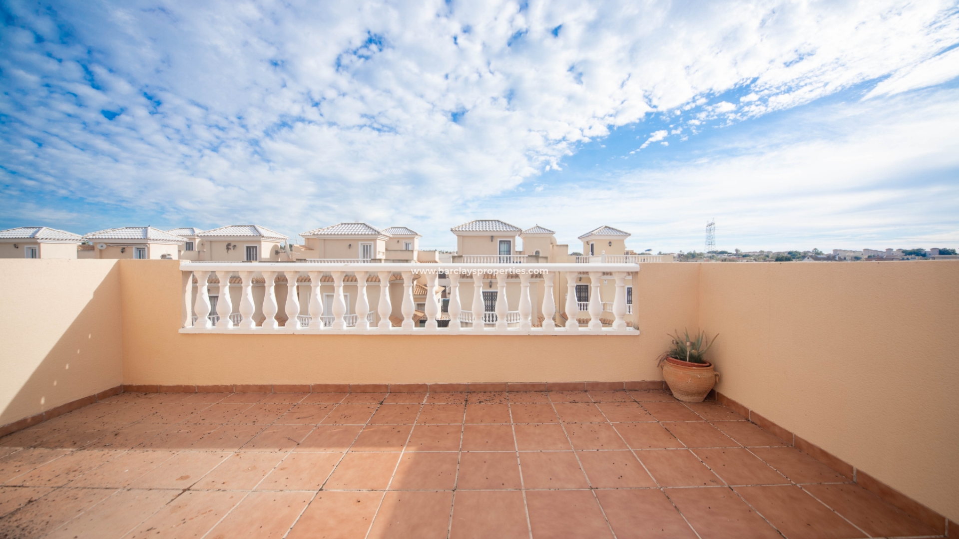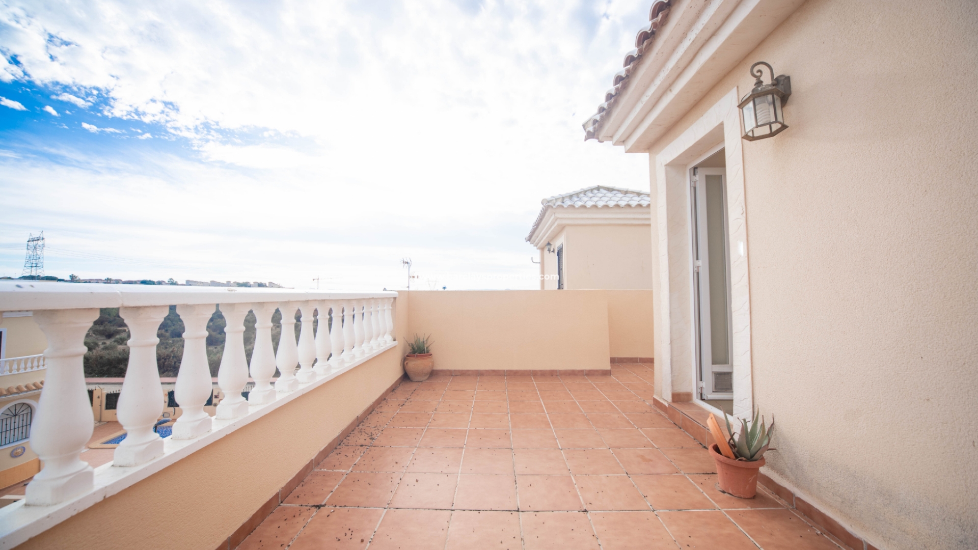 Deze aantrekkelijke vrijstaande woning, een model "Villas del Palmeral" ligt in een privé-gemeenschap op slechts één deur afstand van het goed onderhouden gemeenschappelijke zwembad. De toplocatie biedt een prachtig uitzicht op de bergen vanaf de vele zonnige terrassen. Alle voorzieningen zijn te vinden op slechts 10 minuten lopen van het pand in de urbanisatie La Marina waar men verwend wordt met keuze als het gaat om supermarkten, bars en restaurants.