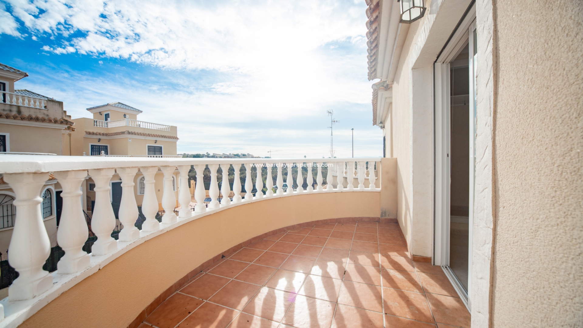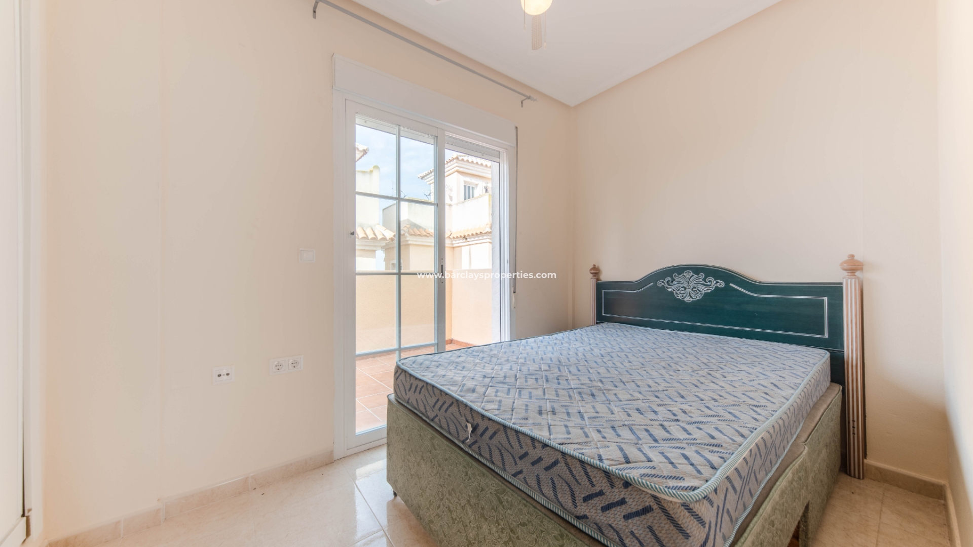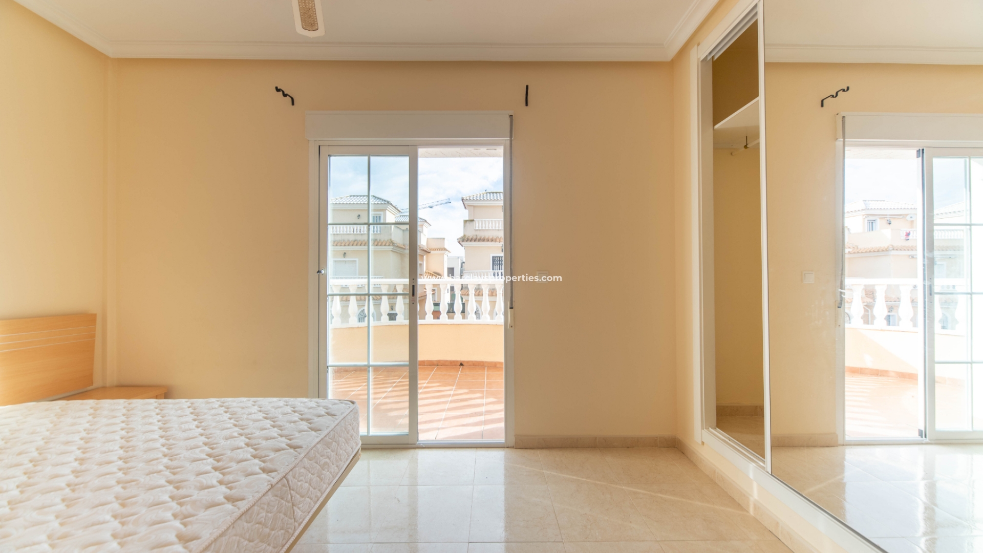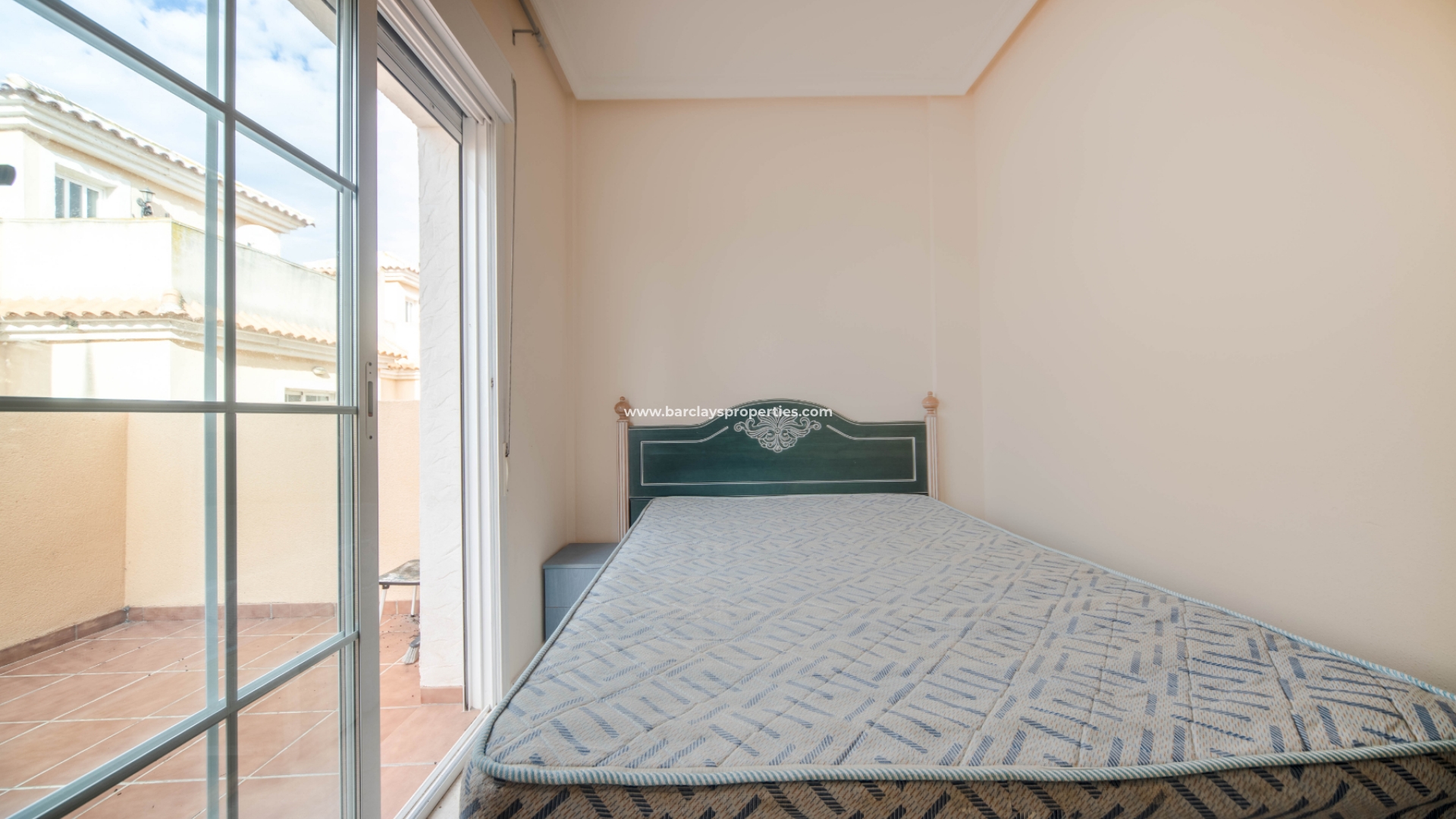 Deze aantrekkelijke vrijstaande woning, een model "Villas del Palmeral" ligt in een privé-gemeenschap op slechts één deur afstand van het goed onderhouden gemeenschappelijke zwembad. De toplocatie biedt een prachtig uitzicht op de bergen vanaf de vele zonnige terrassen. Alle voorzieningen zijn te vinden op slechts 10 minuten lopen van het pand in de urbanisatie La Marina waar men verwend wordt met keuze als het gaat om supermarkten, bars en restaurants.