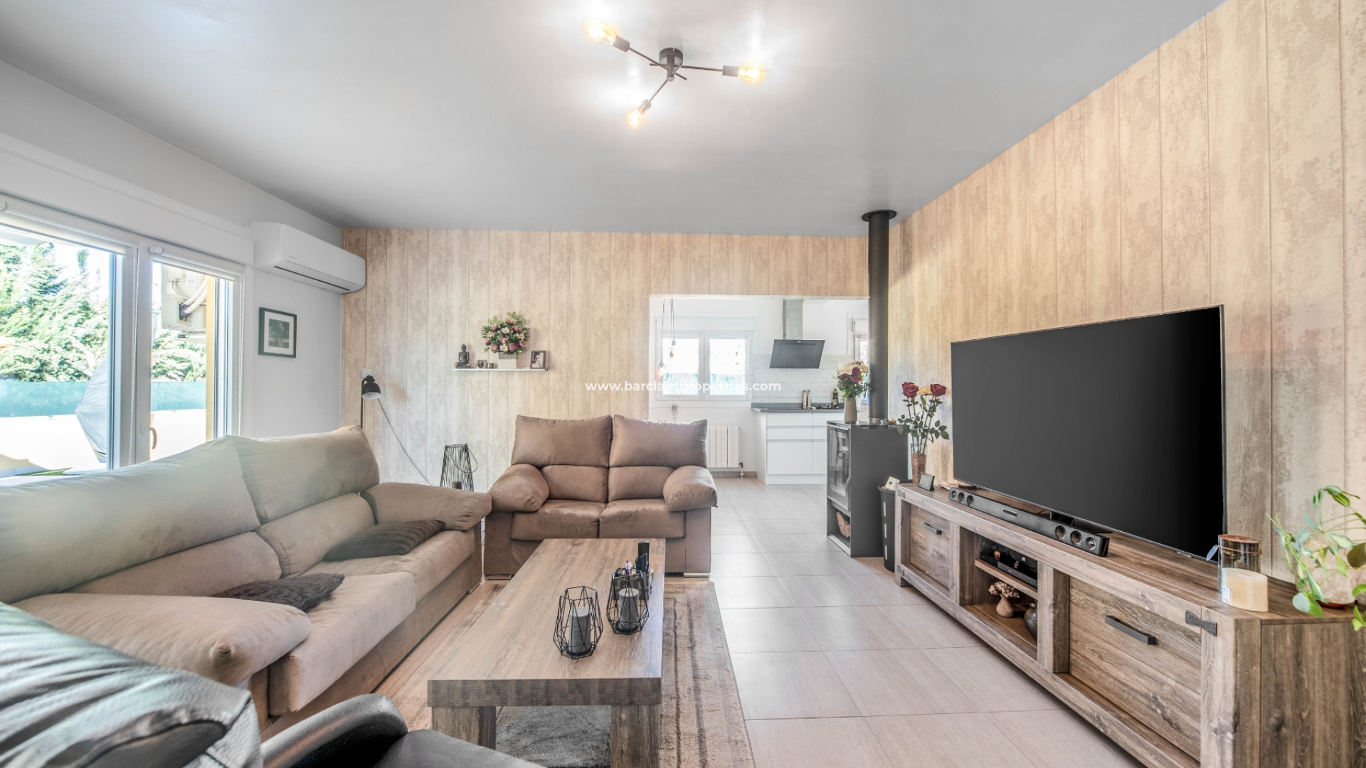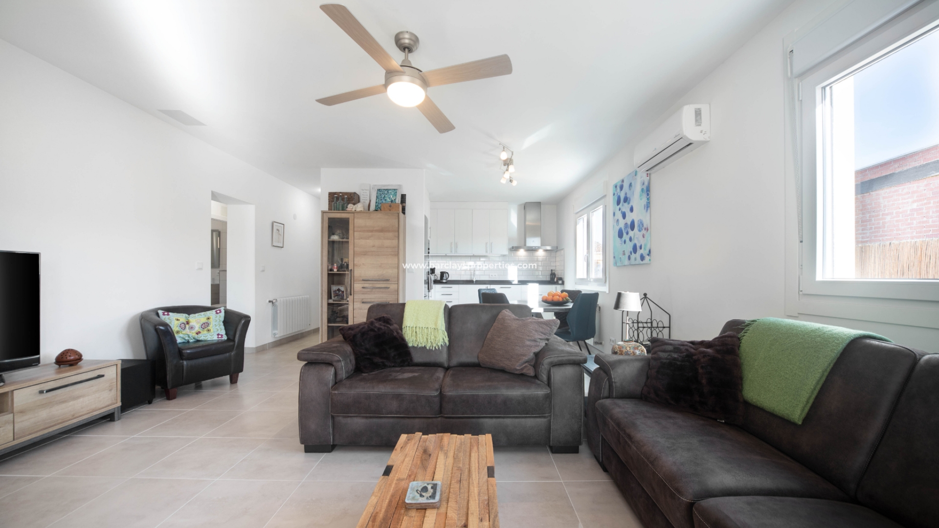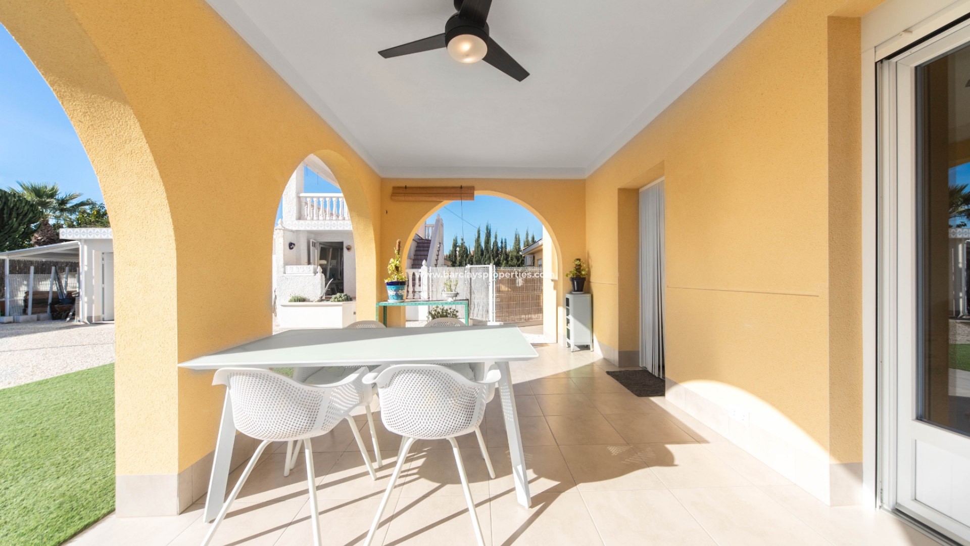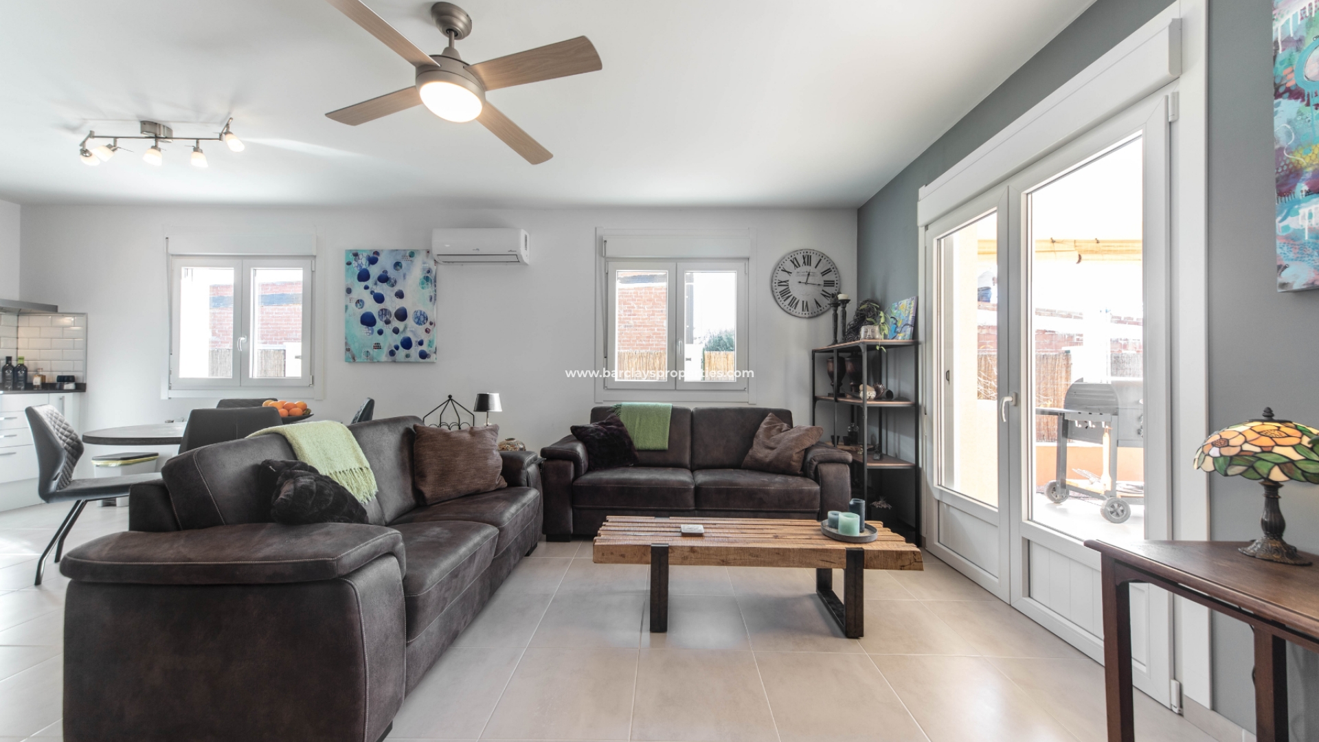 Deze villa met een grote overdekte voorporch met zithoek en plafondventilator leidt naar het interieur van het pand met een grote open woonkamer / moderne keuken met split-level oven en kookplaat / eethoek, deze ruimte heeft veel ramen waardoor een overvloed aan licht het pand binnenkomt en wordt verwarmd en gekoeld met airconditioning en een plafondventilator. Dicht bij de woonkamer ligt een tweepersoonsslaapkamer met inbouwkasten, airconditioning, een plafondventilator en een en-suite moderne badkamer met badmeubel met LED-verlichting en een hoekdouche. Aan het einde van de gang is nog een slaapkamer met inbouwkasten en daarnaast een familiebadkamer met hoekdouche. Deze villa is voorzien van centrale verwarming op gas en wordt gedeeltelijk gemeubileerd aangeboden.