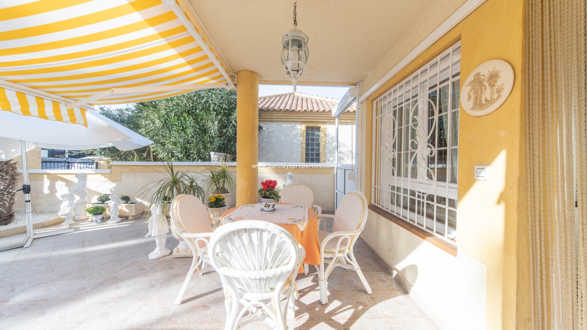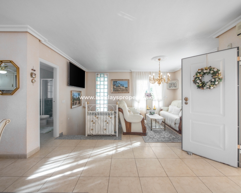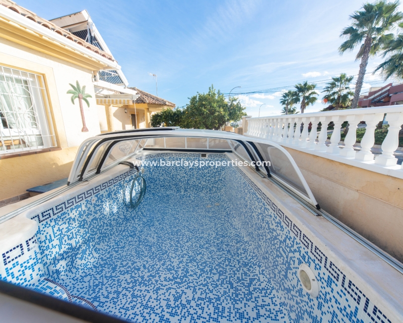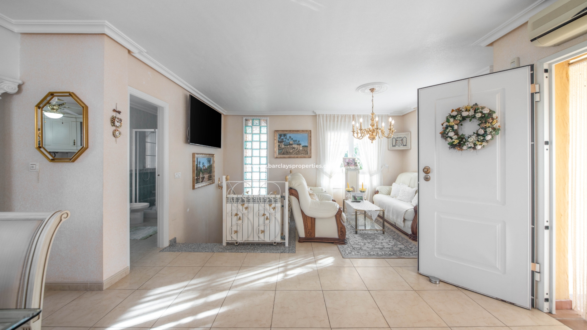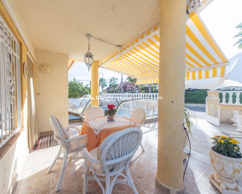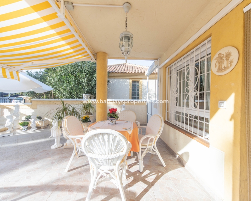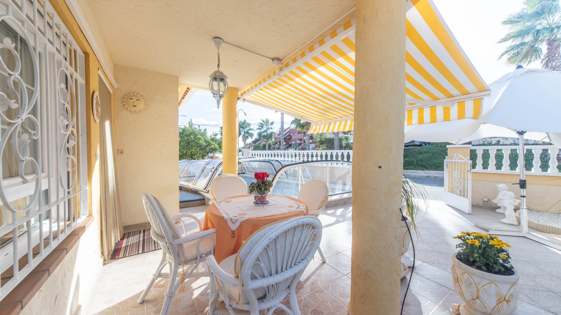 Presentatie van deze villa te koop in La Marina, gelegen in een rustige omgeving van La Marina Urbanisation maar toch op korte loopafstand van de dichtstbijzijnde voorzieningen. Op de bovenste verdieping van het pand vinden we de hoofdingang, maar niet voordat we door de netjes geplaveide tuin met zijn eigen 6,5 bij 3,5 meter overdekt verwarmd zwembad zijn gegaan! De zonneschermen net boven de zuilen van de veranda zorgen voor extra schaduw aan deze weelderige buitenkant. Er is een overdekte zithoek bij het zwembad met prachtig uitzicht op het landschap en een andere zithoek aan de voorkant van het pand, zodat u de hele dag die warme mediterrane zon kunt volgen.