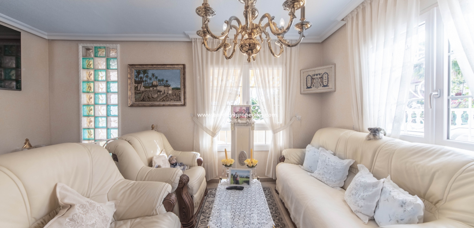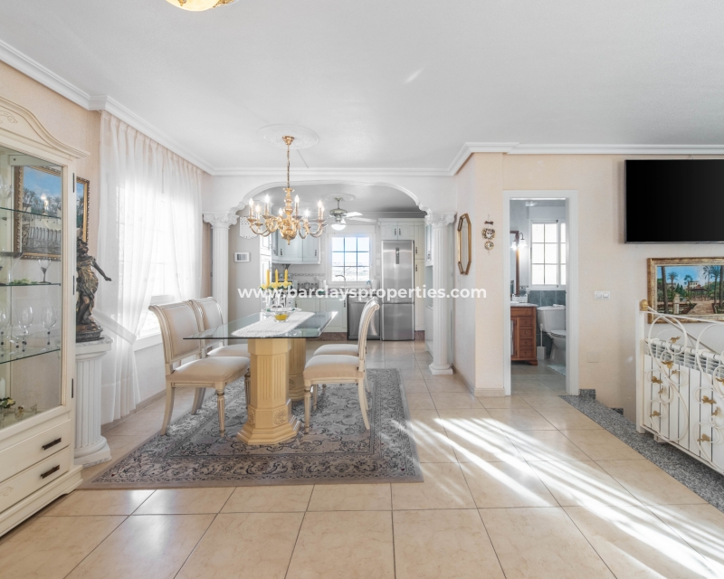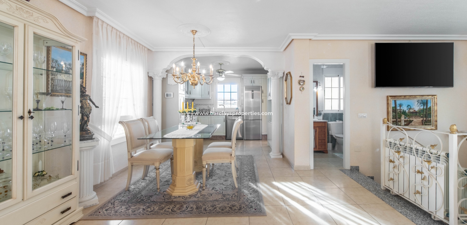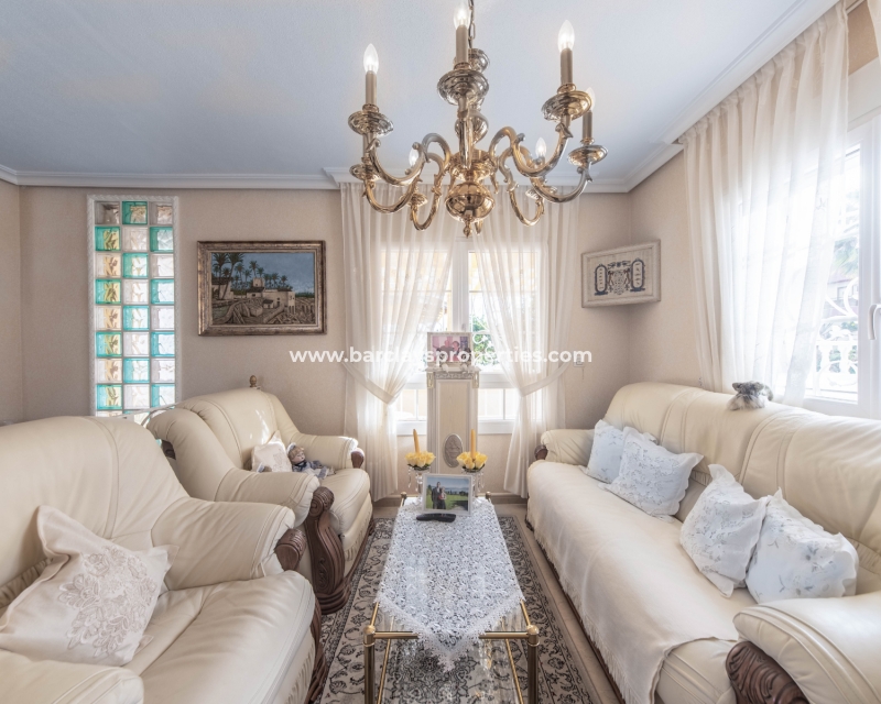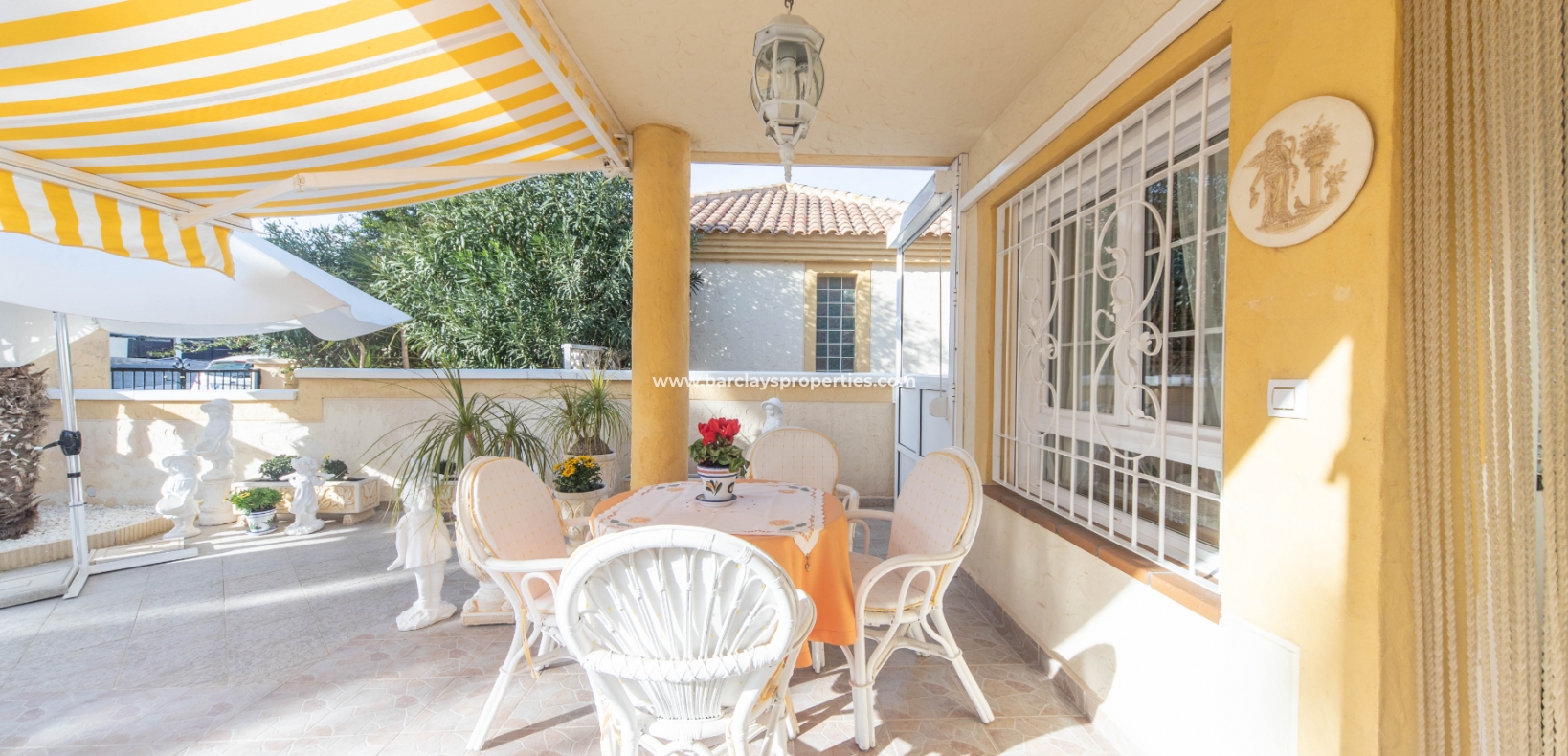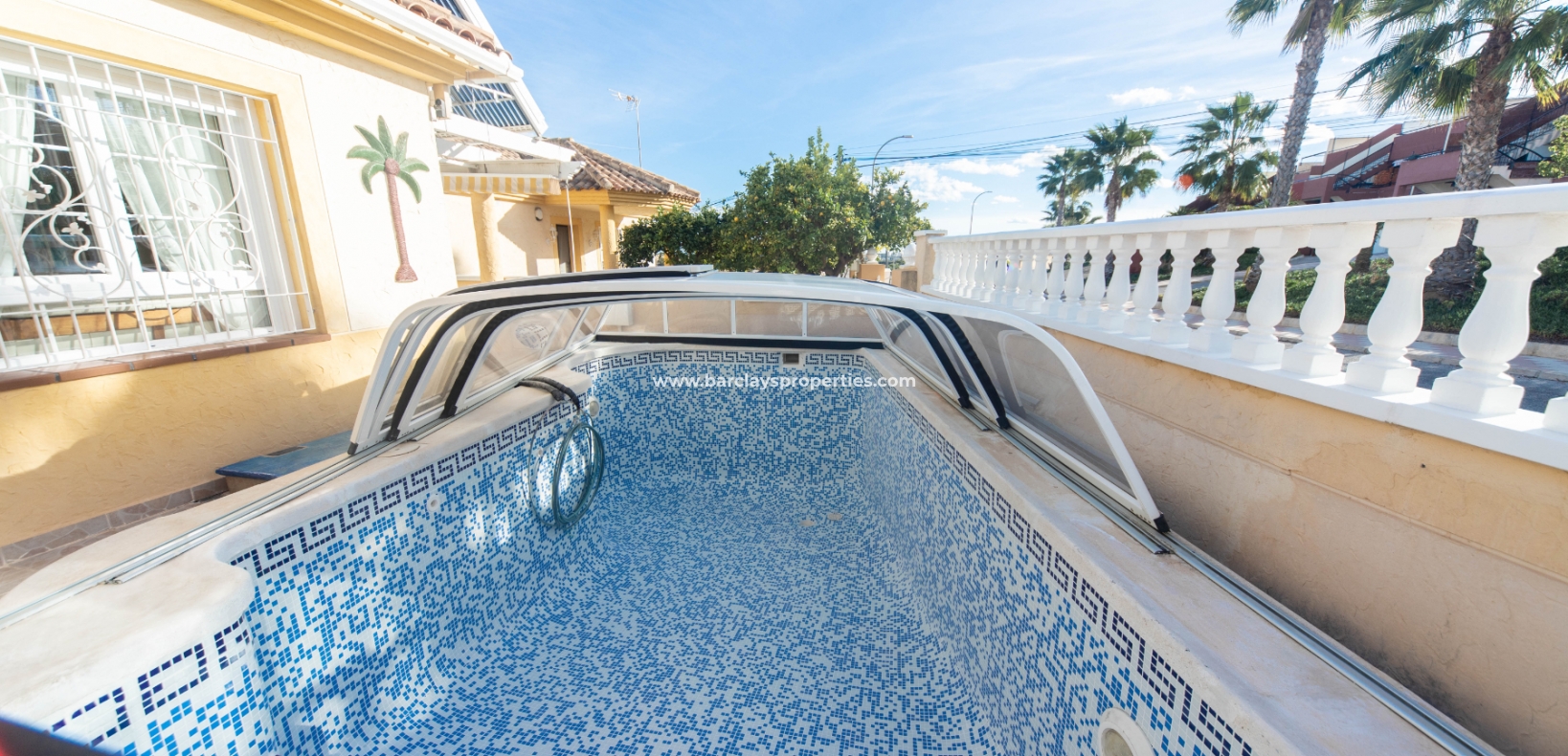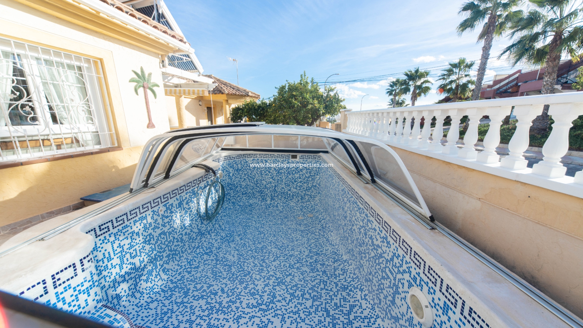 Presentatie van deze villa te koop in La Marina, gelegen in een rustige omgeving van La Marina Urbanisation maar toch op korte loopafstand van de dichtstbijzijnde voorzieningen. Op de bovenste verdieping van het pand vinden we de hoofdingang, maar niet voordat we door de netjes geplaveide tuin met zijn eigen 6,5 bij 3,5 meter overdekt verwarmd zwembad zijn gegaan! De zonneschermen net boven de zuilen van de veranda zorgen voor extra schaduw aan deze weelderige buitenkant. Er is een overdekte zithoek bij het zwembad met prachtig uitzicht op het landschap en een andere zithoek aan de voorkant van het pand, zodat u de hele dag die warme mediterrane zon kunt volgen.