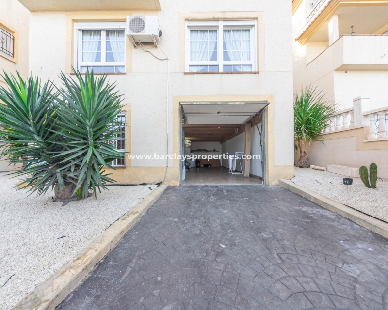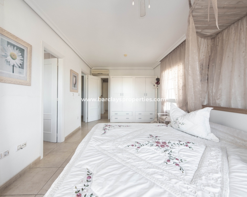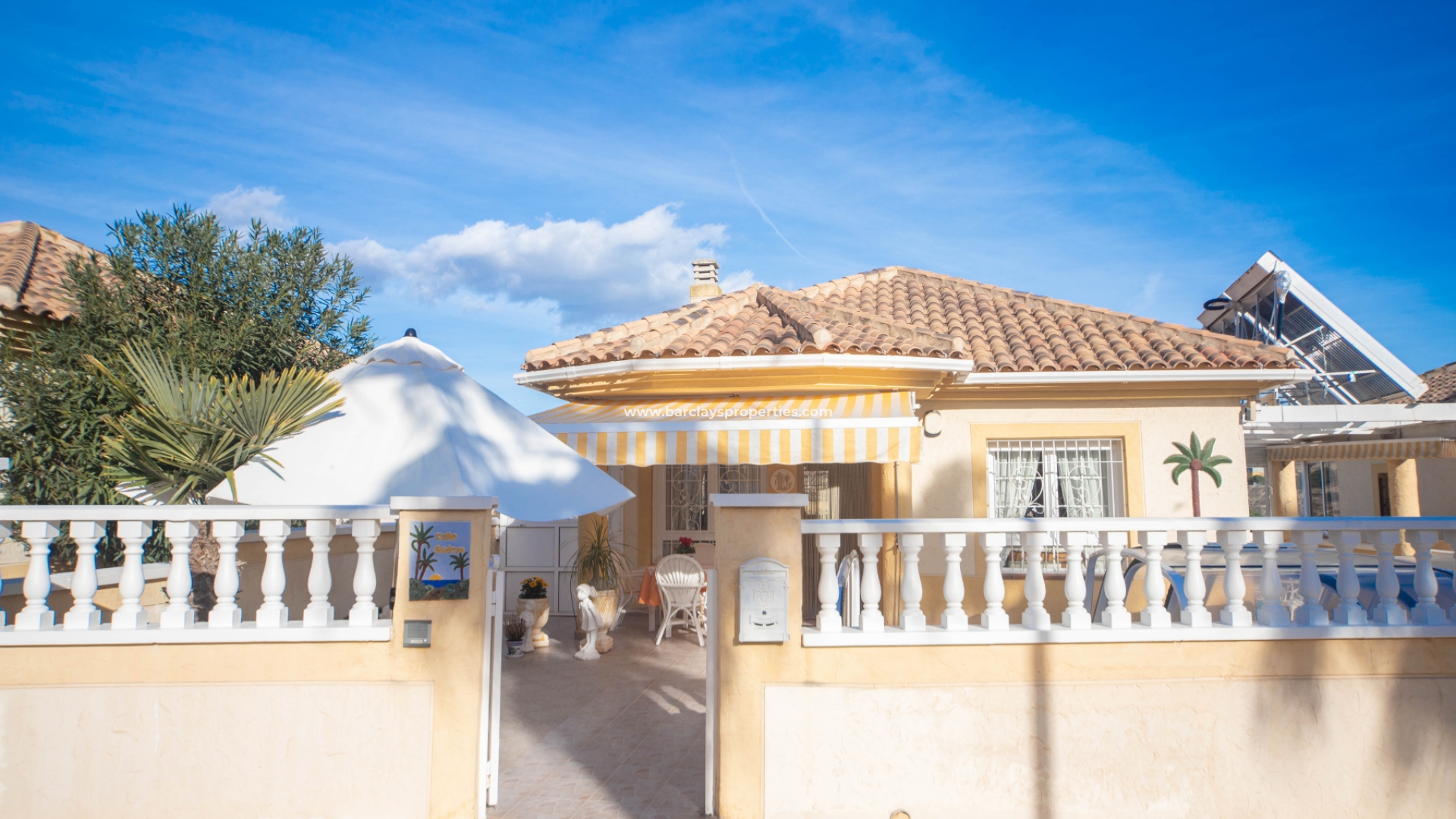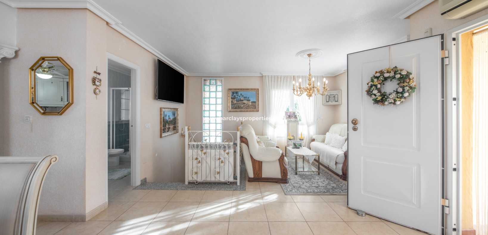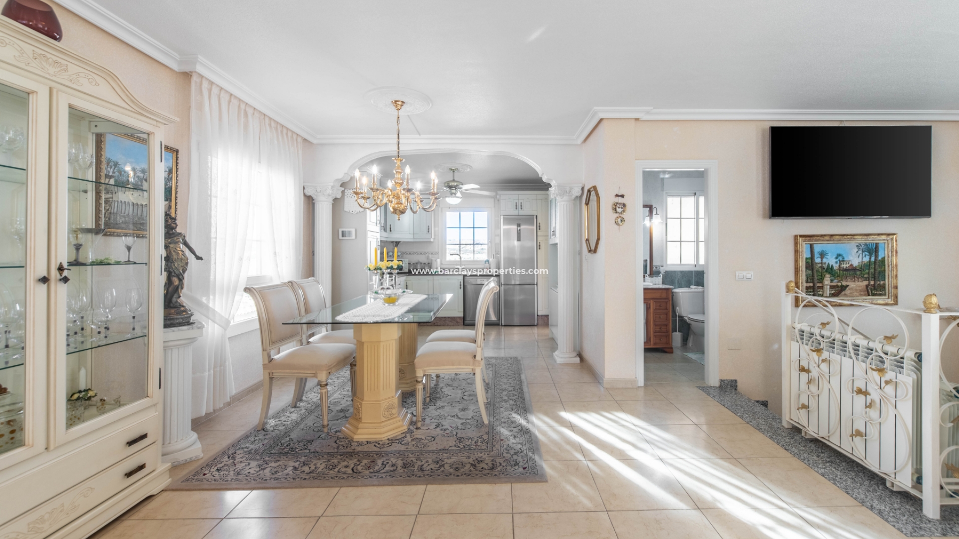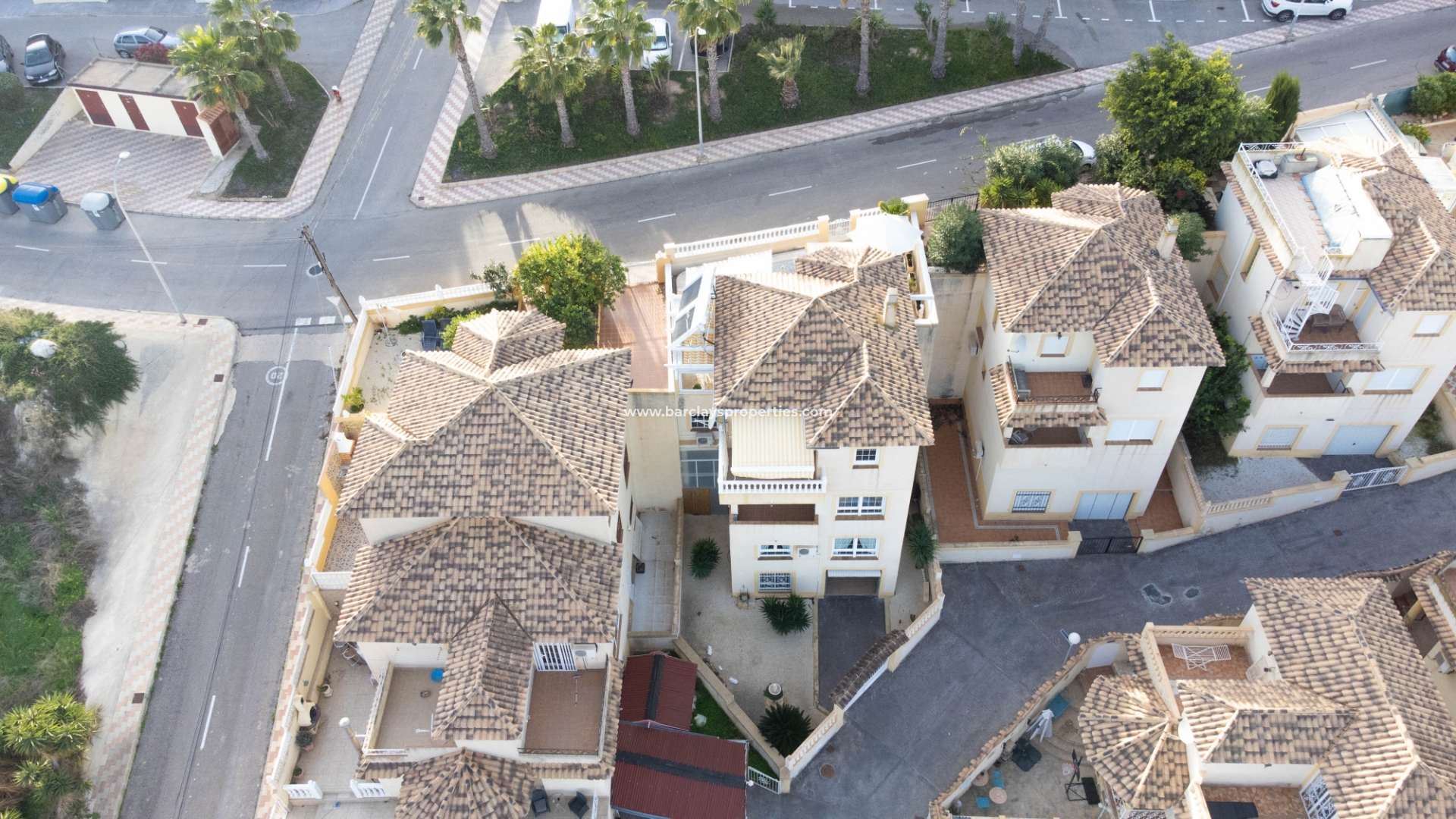Presentatie van deze villa te koop in La Marina, gelegen in een rustige omgeving van La Marina Urbanisation maar toch op korte loopafstand van de dichtstbijzijnde voorzieningen. Op de bovenste verdieping van het pand vinden we de hoofdingang, maar niet voordat we door de netjes geplaveide tuin met zijn eigen 6,5 bij 3,5 meter overdekt verwarmd zwembad zijn gegaan! De zonneschermen net boven de zuilen van de veranda zorgen voor extra schaduw aan deze weelderige buitenkant. Er is een overdekte zithoek bij het zwembad met prachtig uitzicht op het landschap en een andere zithoek aan de voorkant van het pand, zodat u de hele dag die warme mediterrane zon kunt volgen.