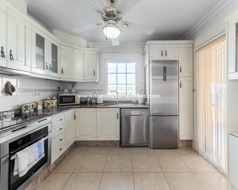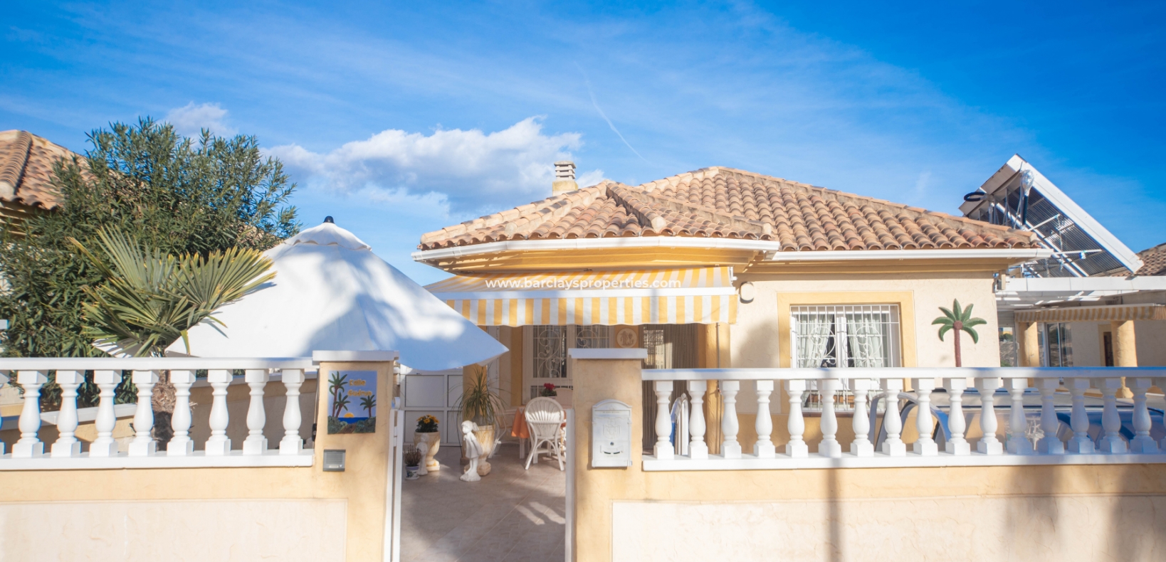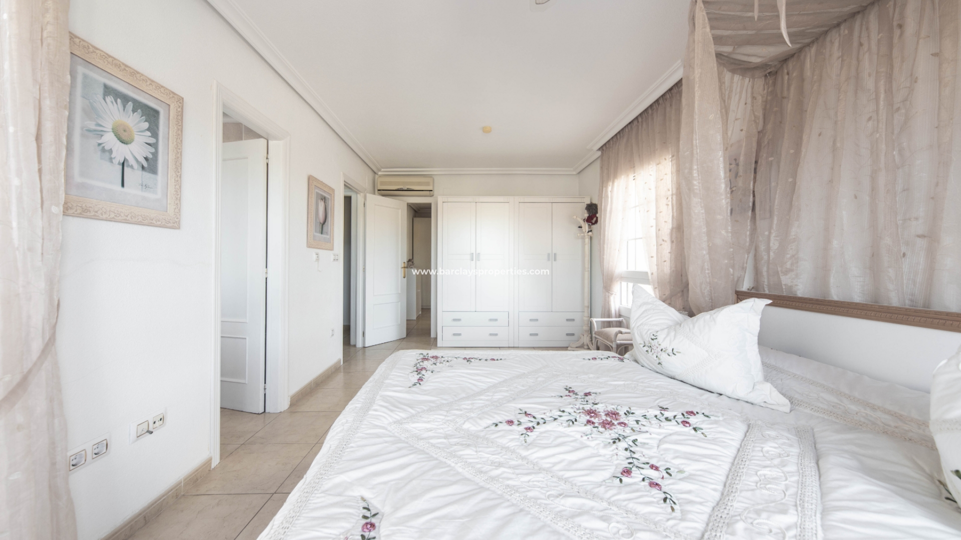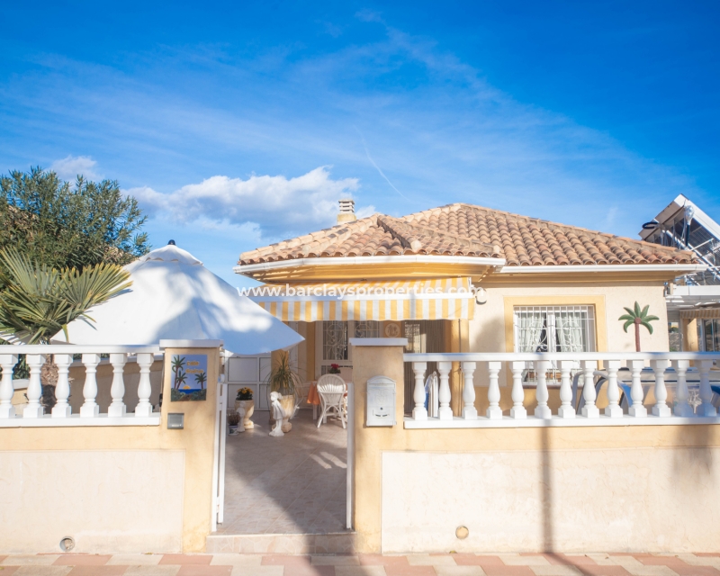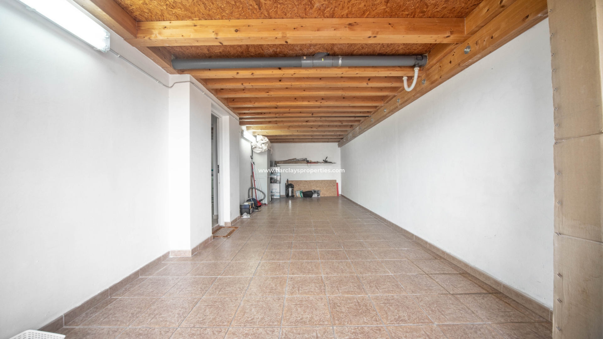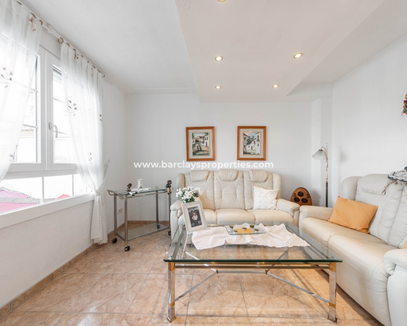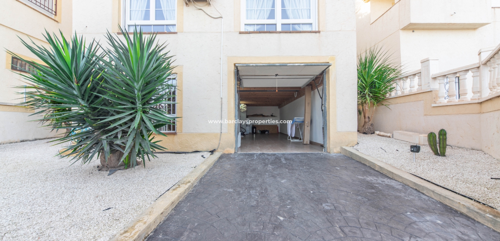 Presentatie van deze villa te koop in La Marina, gelegen in een rustige omgeving van La Marina Urbanisation maar toch op korte loopafstand van de dichtstbijzijnde voorzieningen. Op de bovenste verdieping van het pand vinden we de hoofdingang, maar niet voordat we door de netjes geplaveide tuin met zijn eigen 6,5 bij 3,5 meter overdekt verwarmd zwembad zijn gegaan! De zonneschermen net boven de zuilen van de veranda zorgen voor extra schaduw aan deze weelderige buitenkant. Er is een overdekte zithoek bij het zwembad met prachtig uitzicht op het landschap en een andere zithoek aan de voorkant van het pand, zodat u de hele dag die warme mediterrane zon kunt volgen.