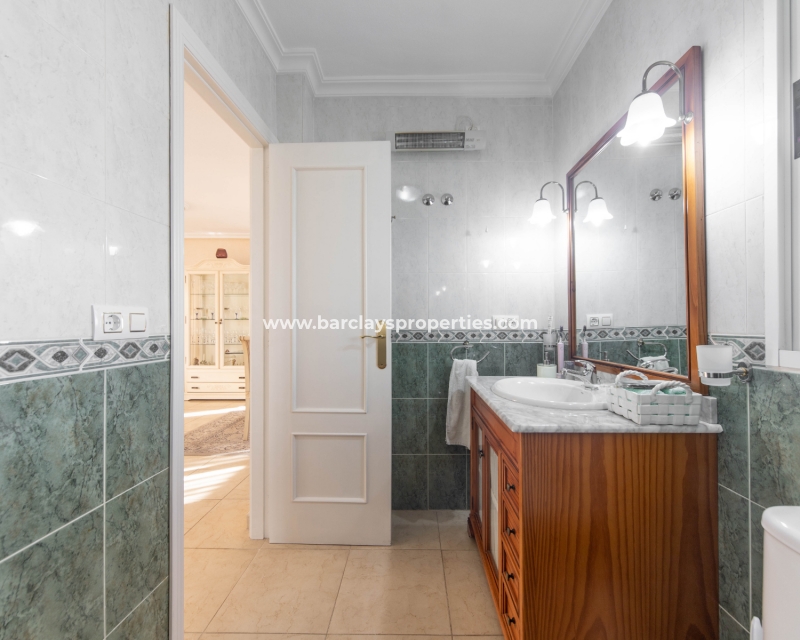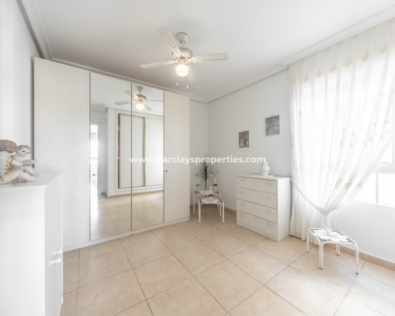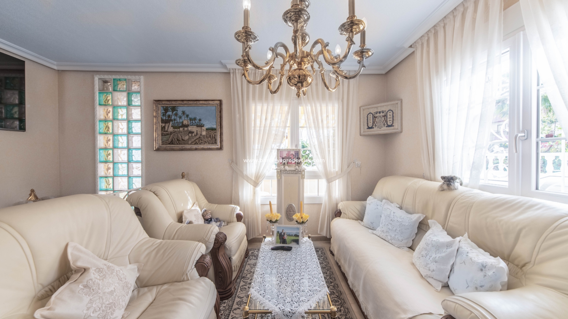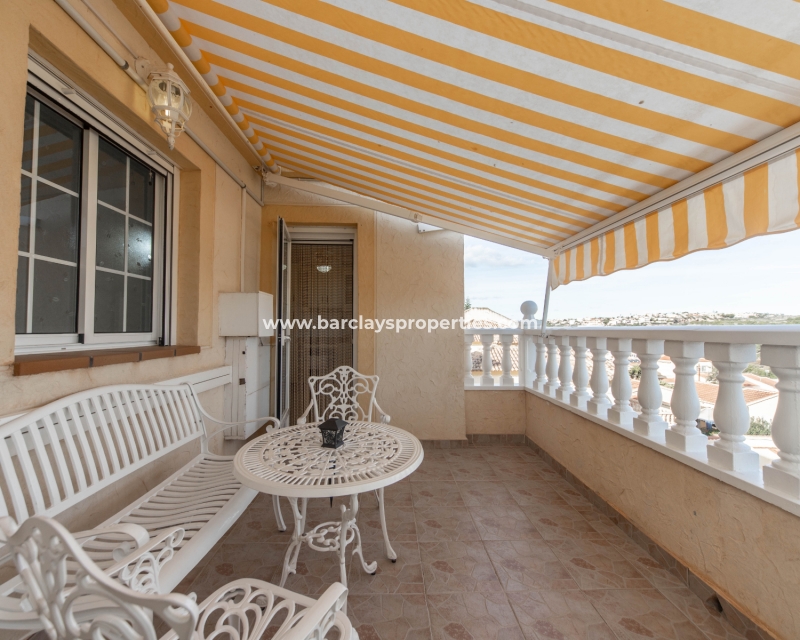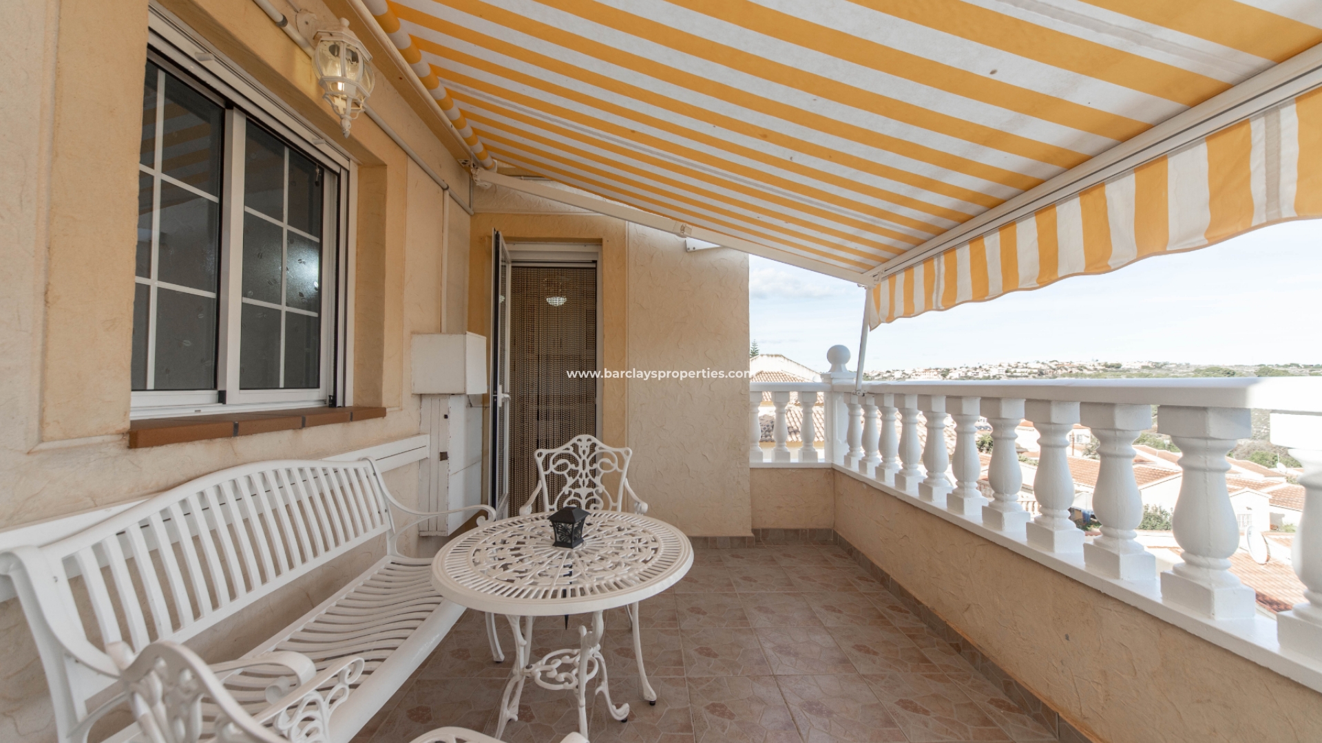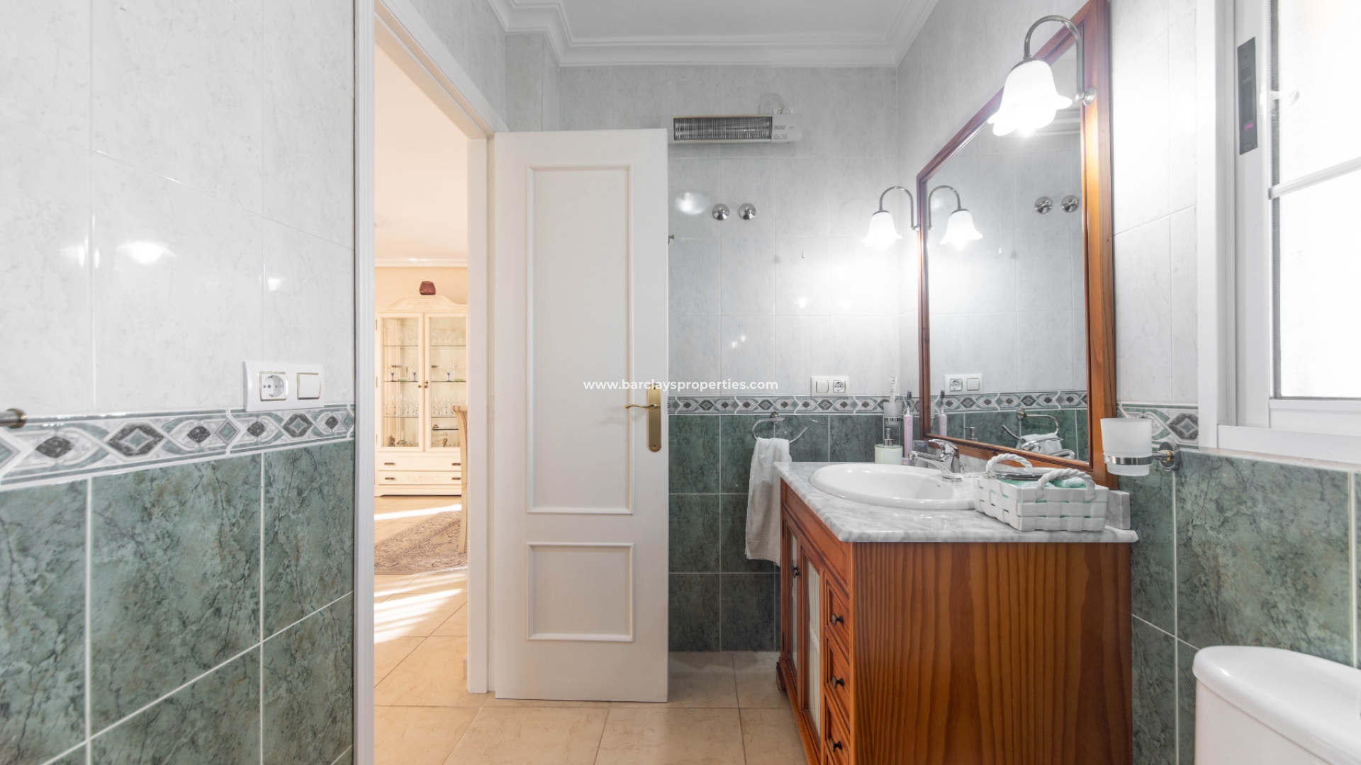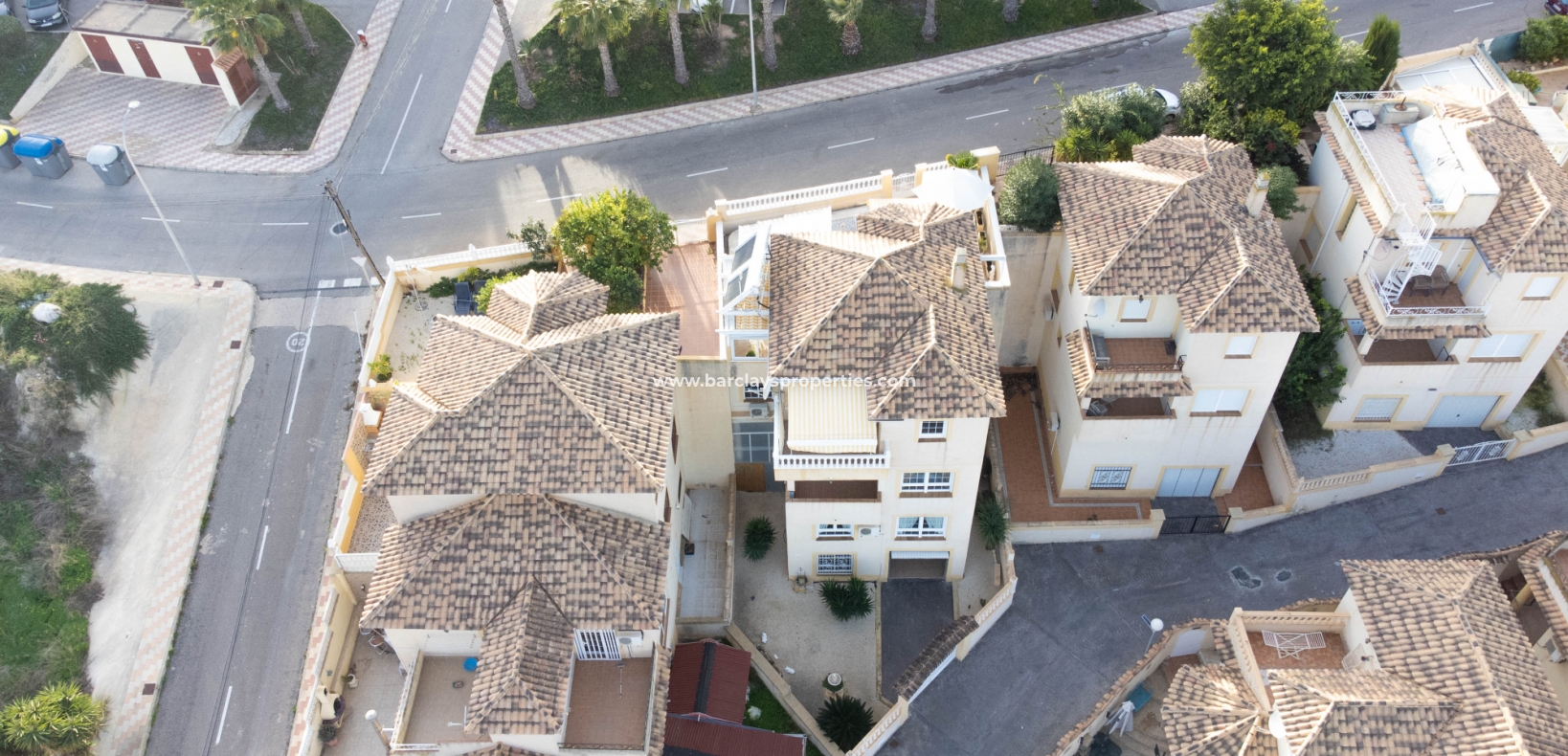 Presentatie van deze villa te koop in La Marina, gelegen in een rustige omgeving van La Marina Urbanisation maar toch op korte loopafstand van de dichtstbijzijnde voorzieningen. Op de bovenste verdieping van het pand vinden we de hoofdingang, maar niet voordat we door de netjes geplaveide tuin met zijn eigen 6,5 bij 3,5 meter overdekt verwarmd zwembad zijn gegaan! De zonneschermen net boven de zuilen van de veranda zorgen voor extra schaduw aan deze weelderige buitenkant. Er is een overdekte zithoek bij het zwembad met prachtig uitzicht op het landschap en een andere zithoek aan de voorkant van het pand, zodat u de hele dag die warme mediterrane zon kunt volgen.